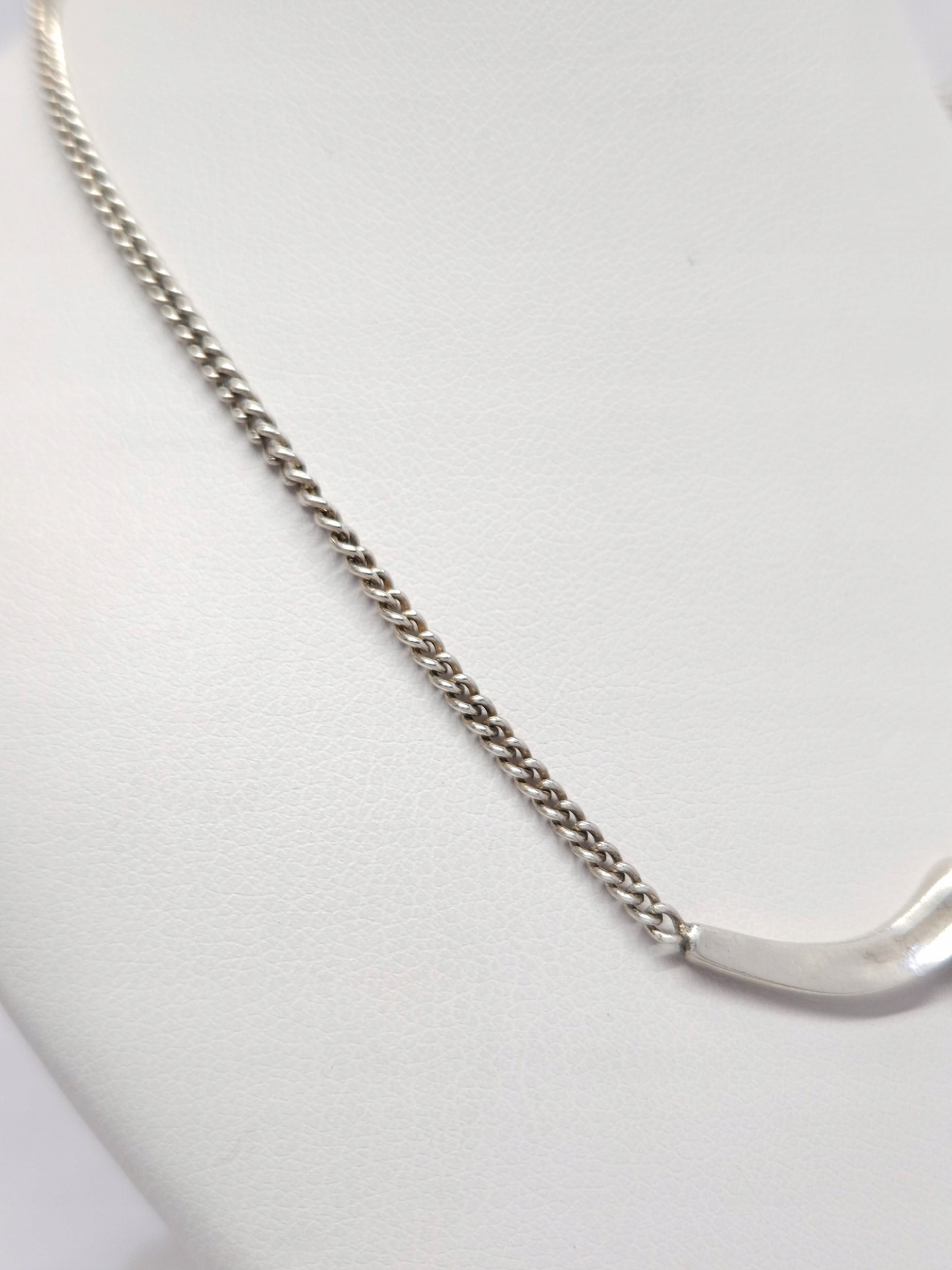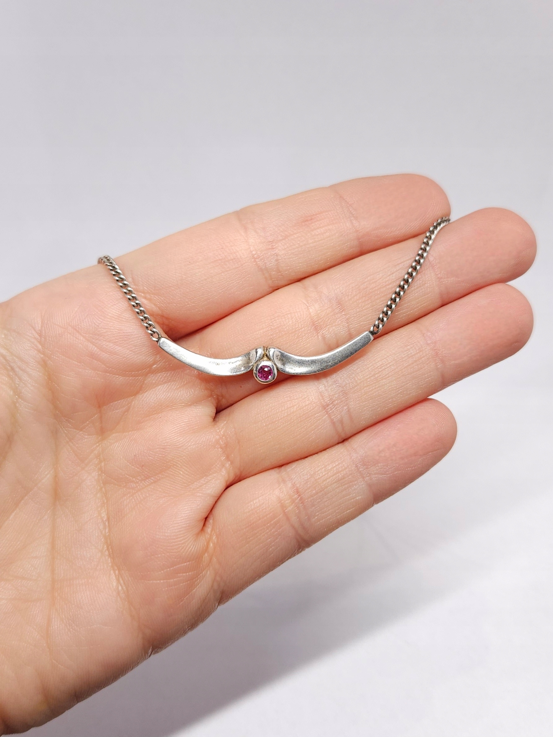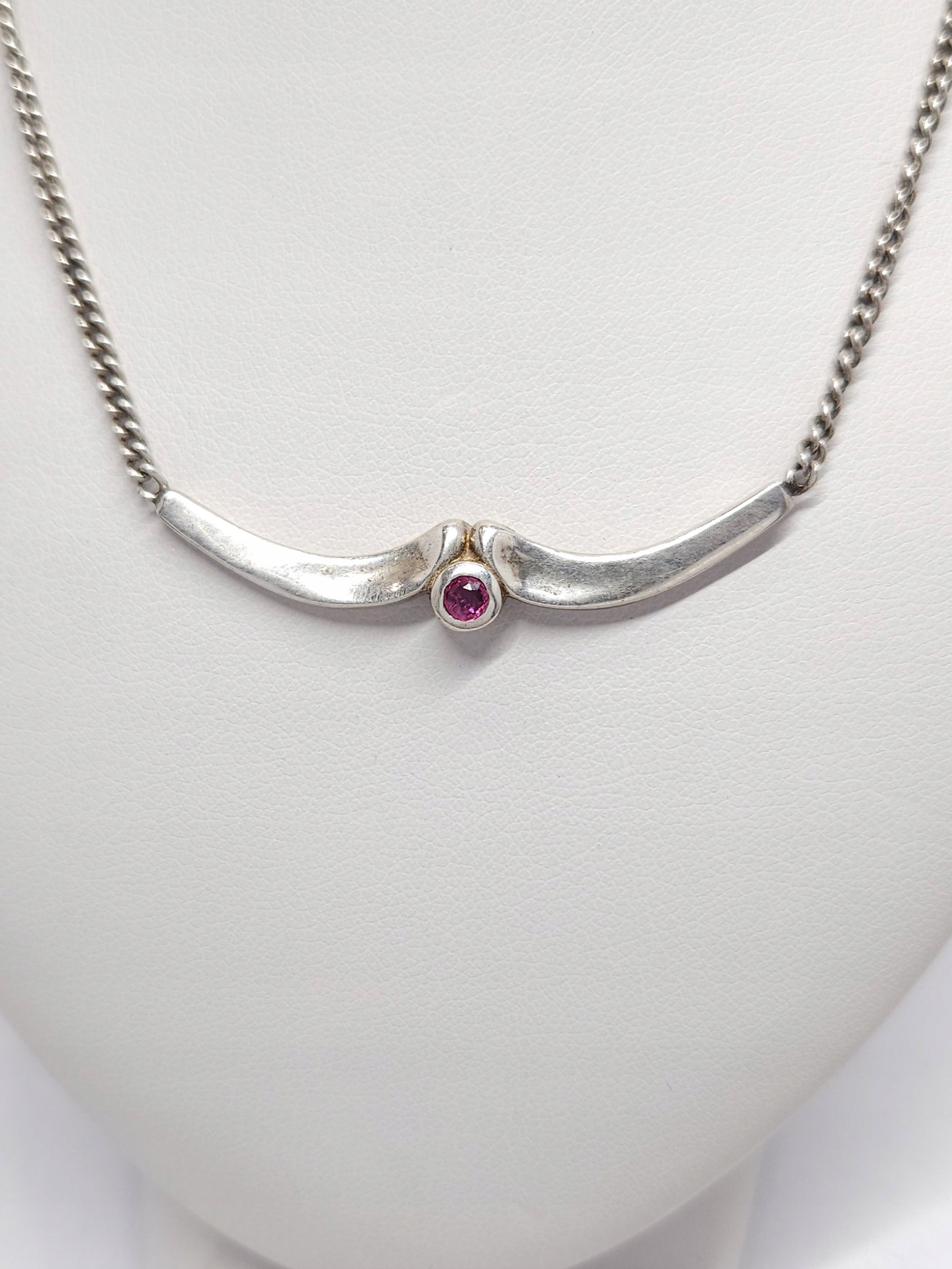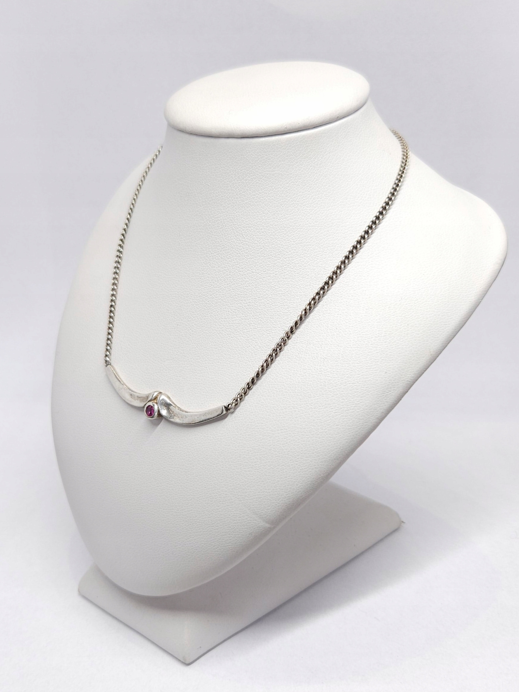 Krótki, srebrny naszyjnik, z elementem ozdobnym dekorowanym pojedynczym rubinem