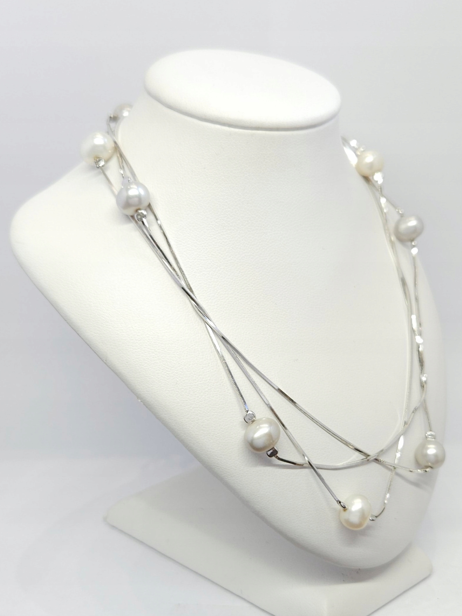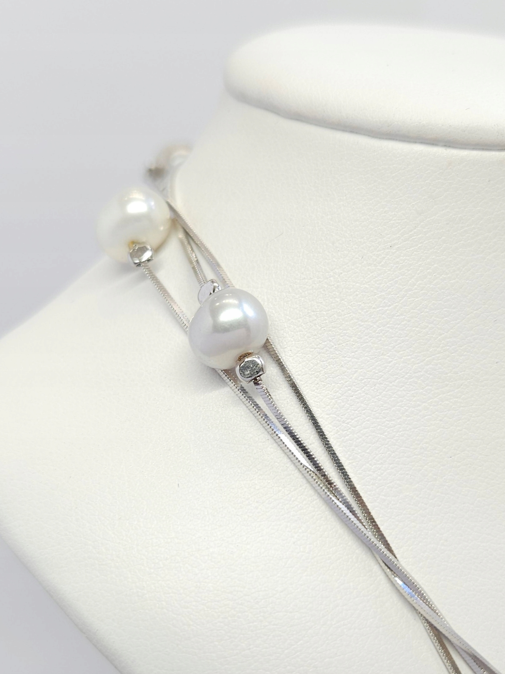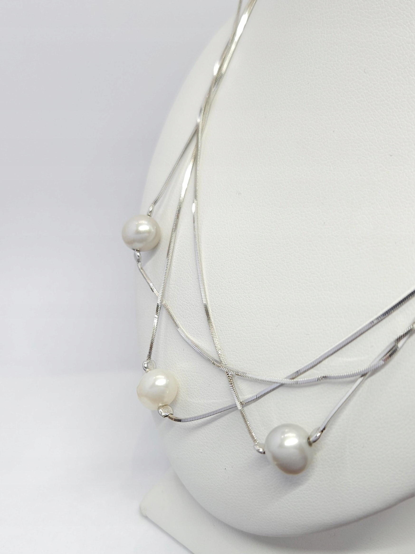 Srebrny potrójny naszyjnik z perłami hodowanymi, srebro 0,925 obw. 45cm