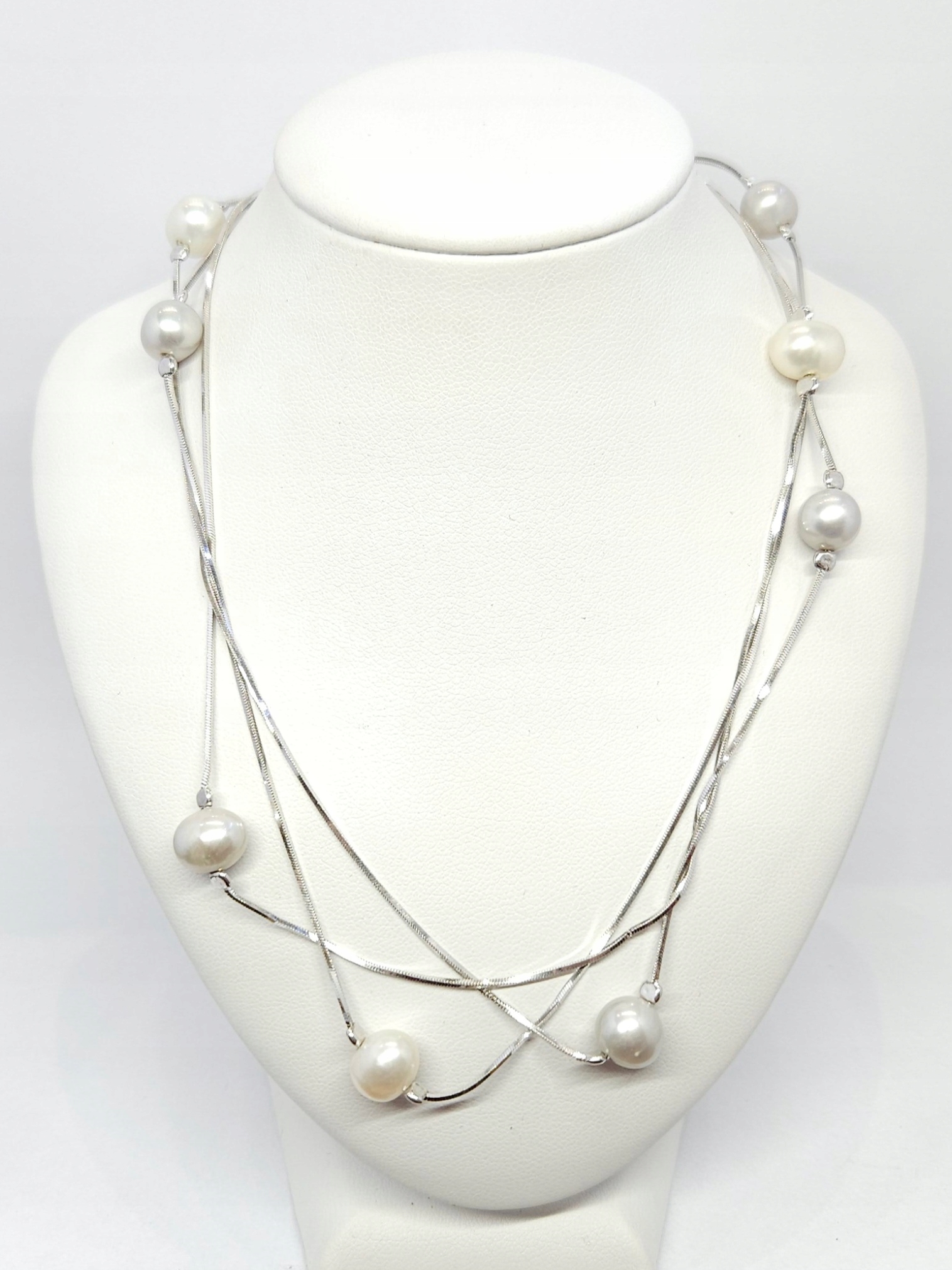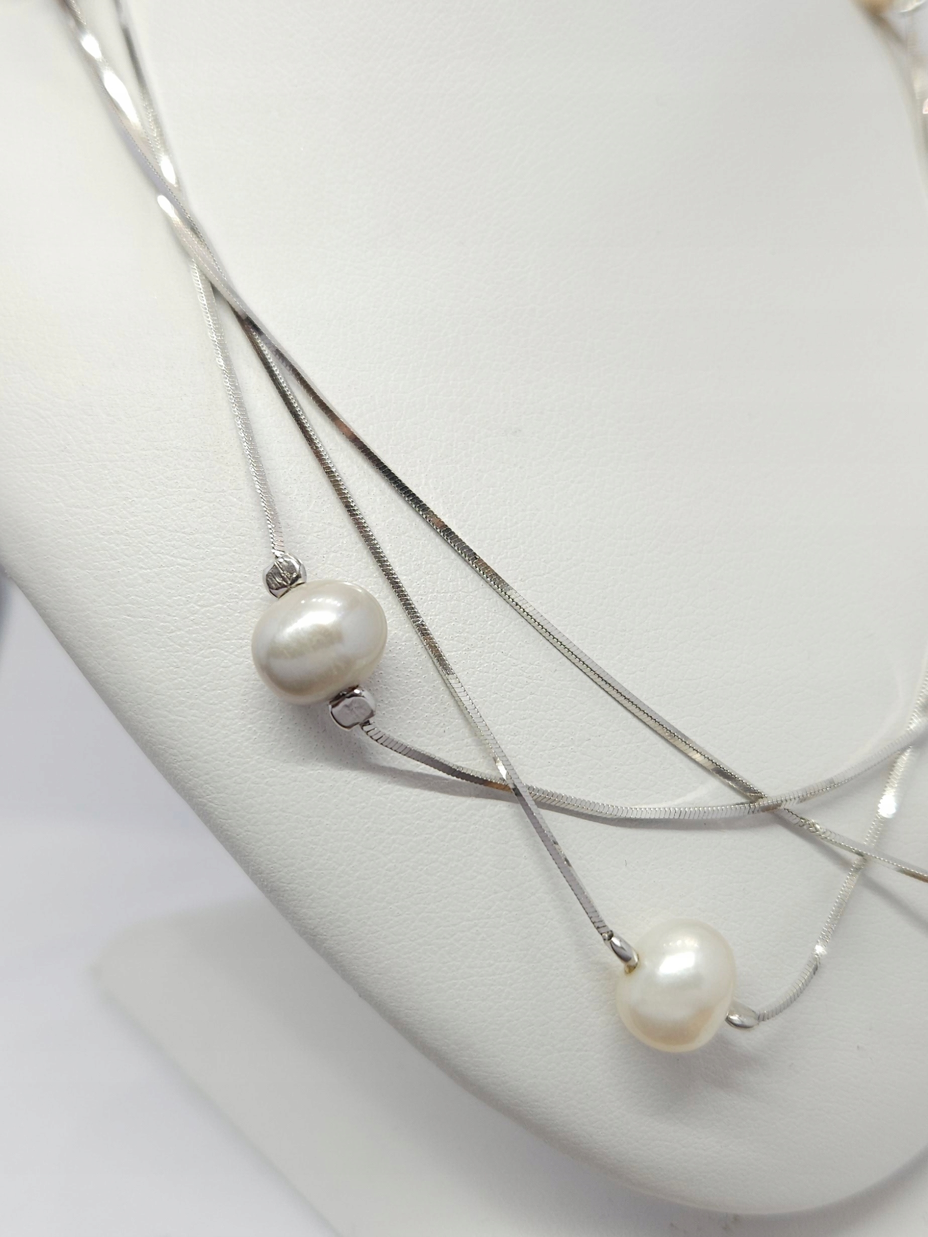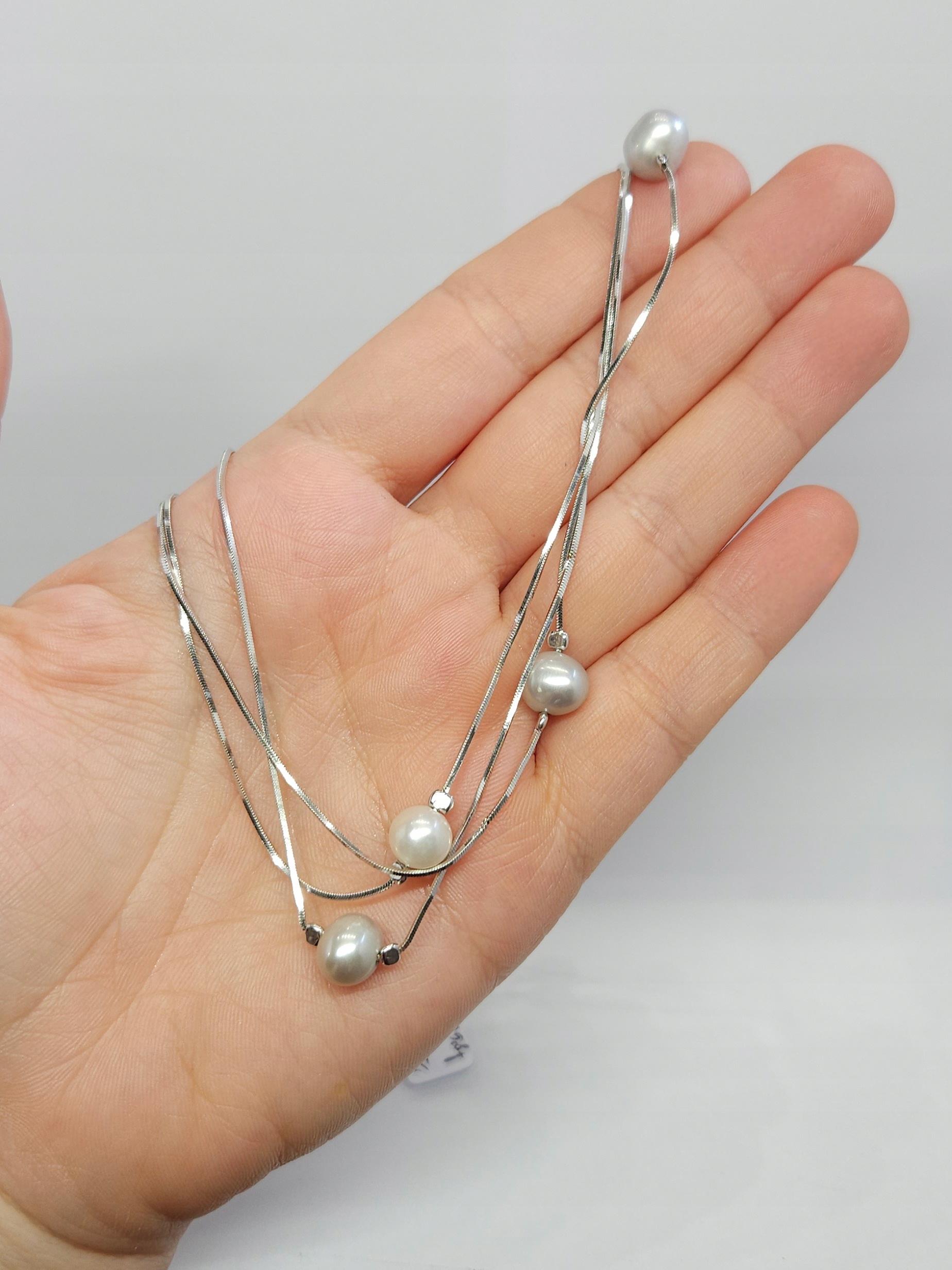 Srebrny potrójny naszyjnik z perłami hodowanymi, srebro 0,925 obw. 45cm