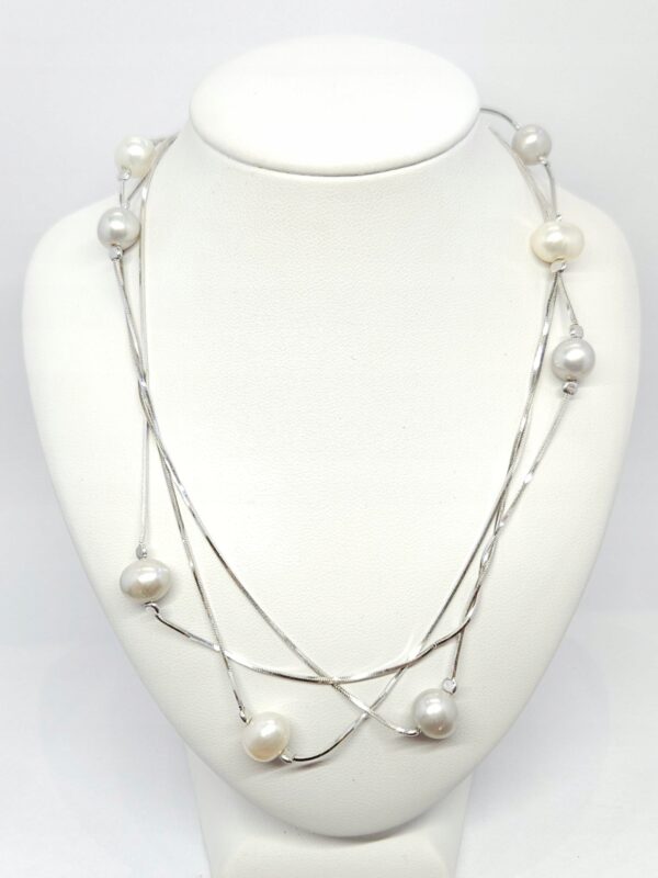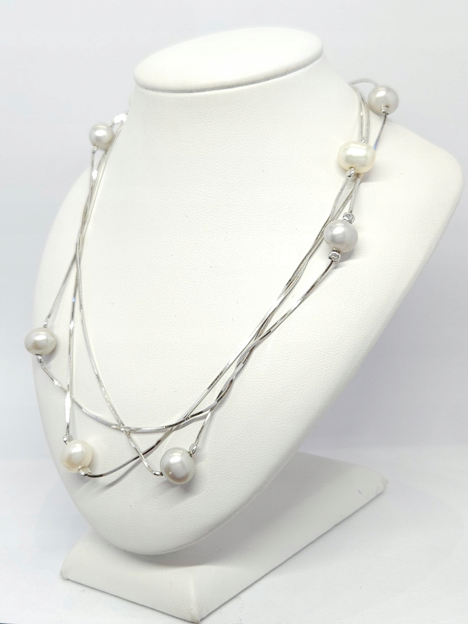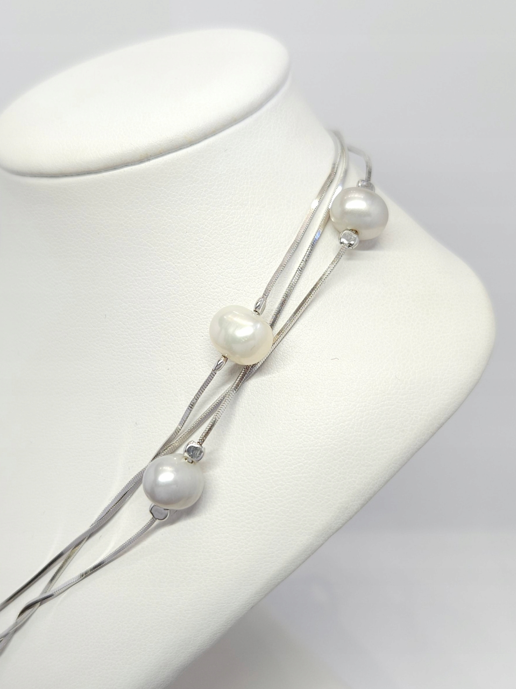 Naszyjnik ze srebra rodowanego, wykonany z trzech przeplatanych ze sobą łańcuszków, zdobionych perłami hodowanymi w odcieniach bieli i srebra; z racji wieku łańcuszki noszą lekkie ślady użytkowania