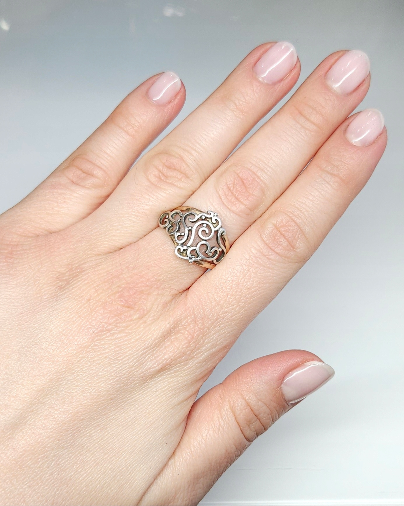 Efektowny pierścionek, wykonany ze złota i srebra, z ażurowym elementem ozdobnym