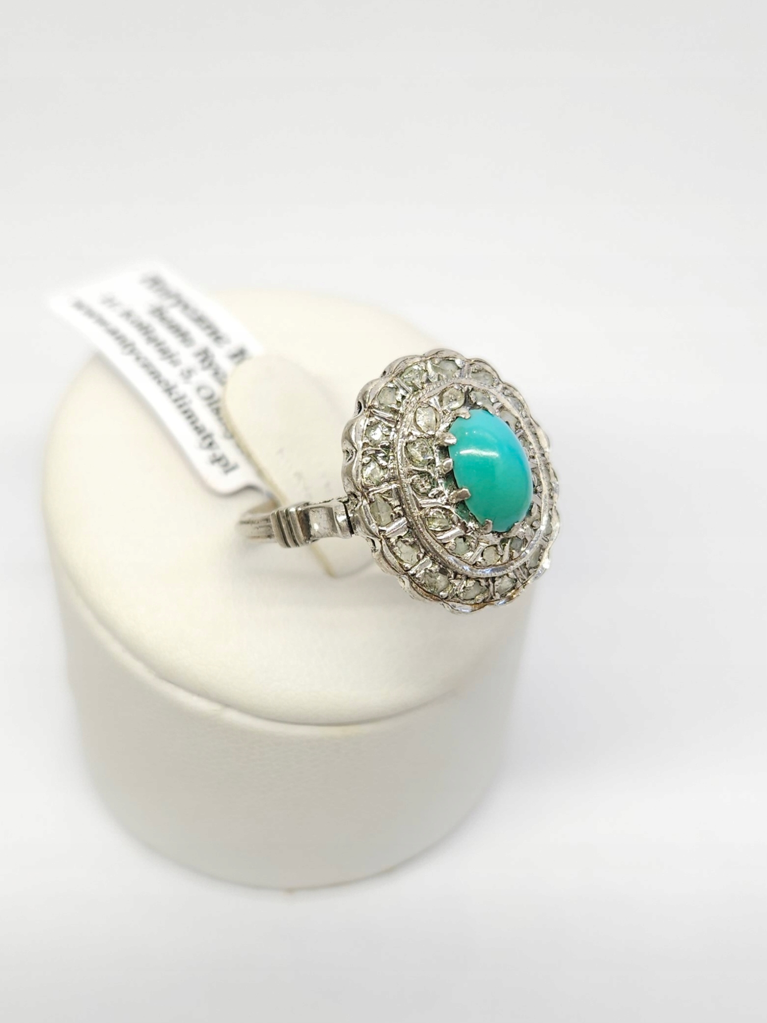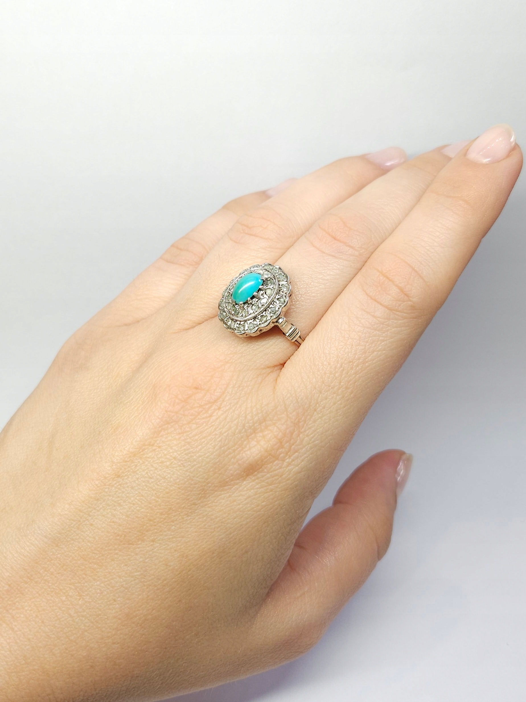 Pierścionek z turkusem i rozetami diamentowymi, srebro pr. 0,800 r.17