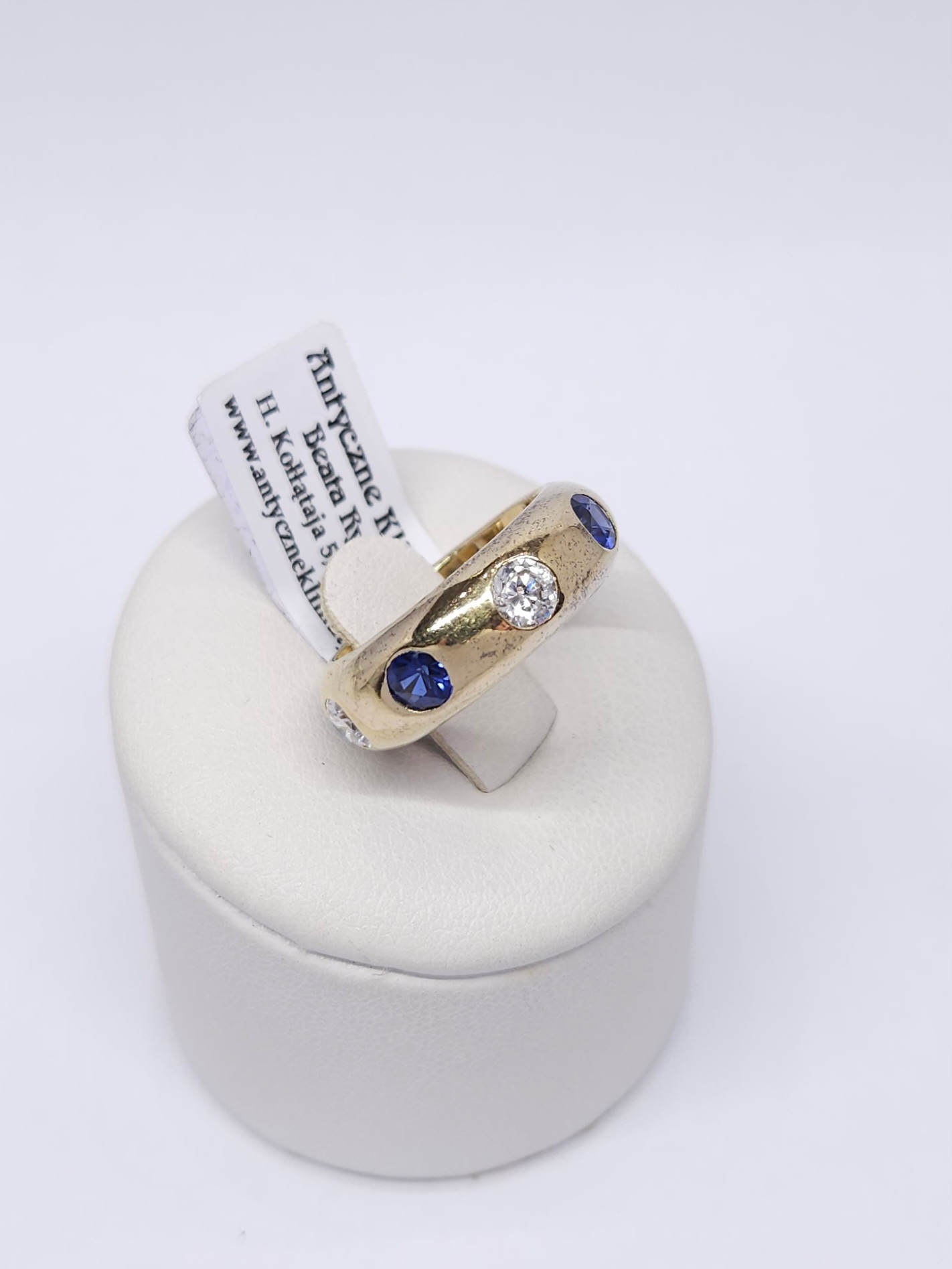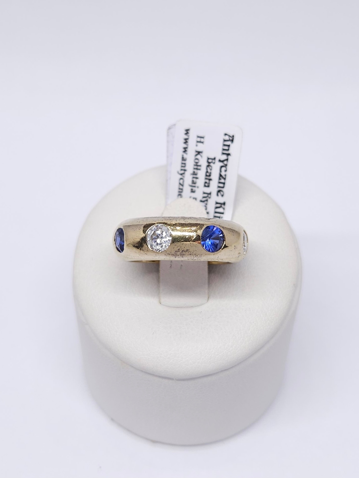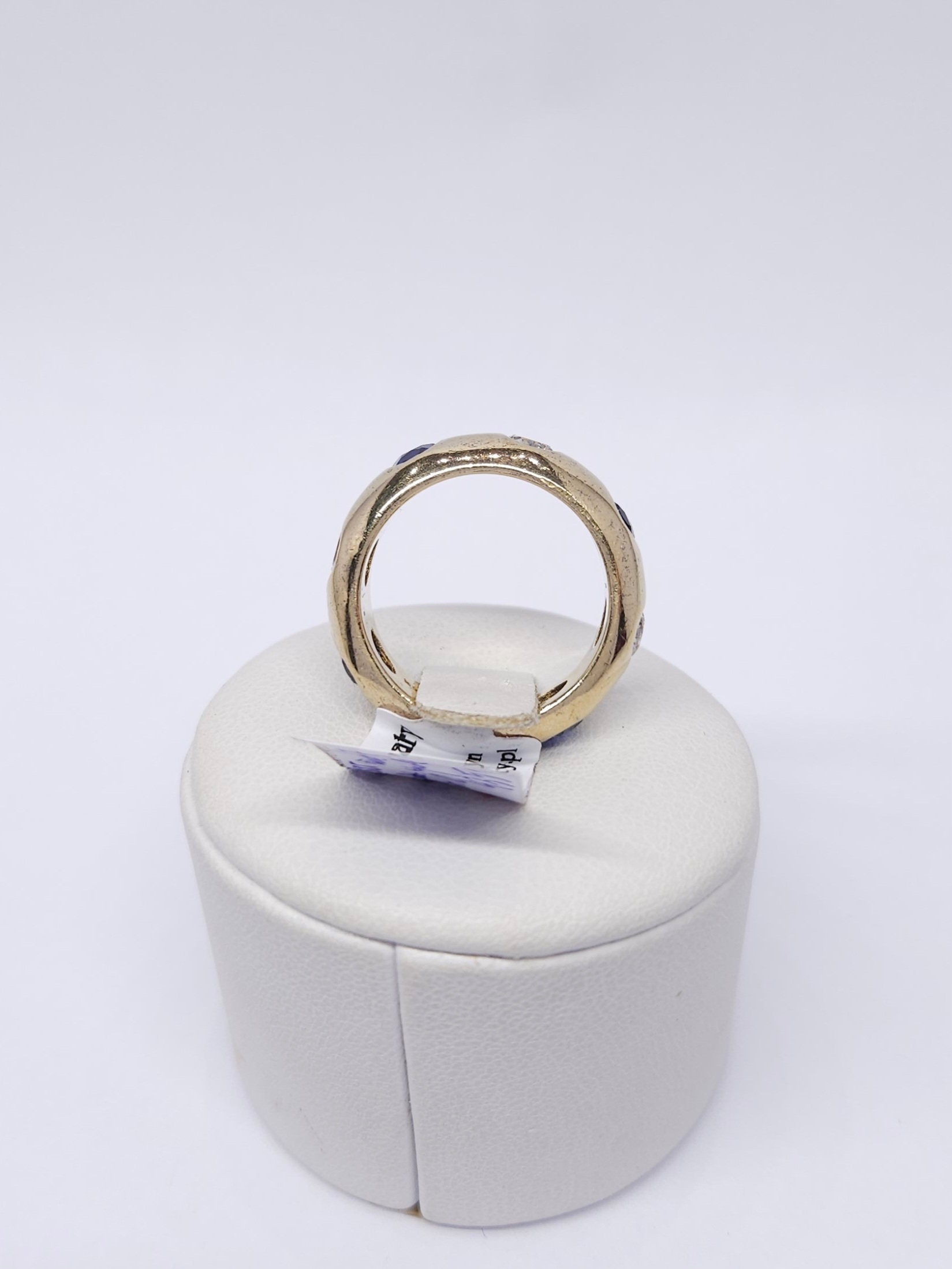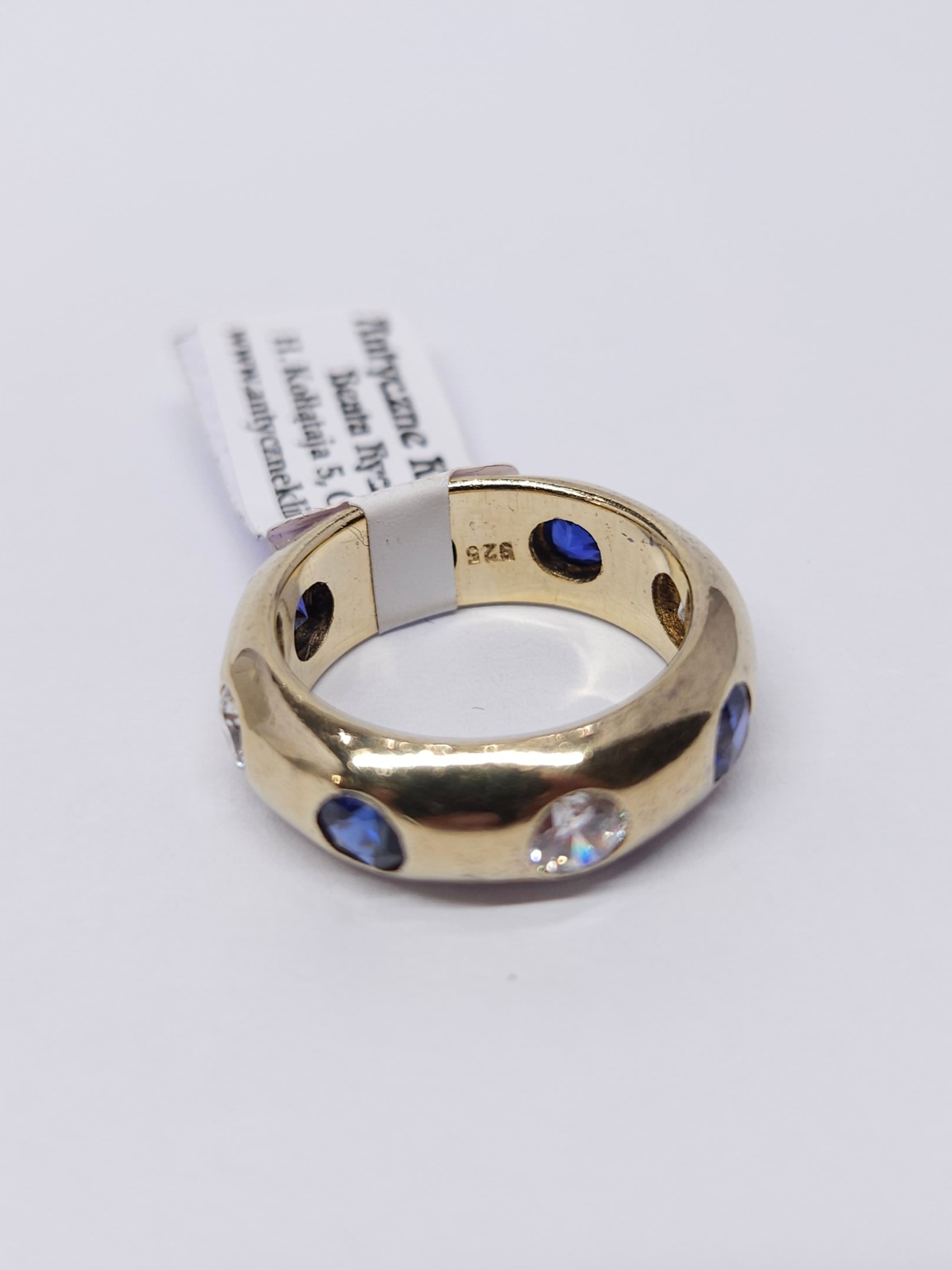 Srebrny, pozłacany pierścionek – masywna, zaokrąglona obrączka, naprzemiennie wysadzana cyrkoniami i szafirami syntetycznymi