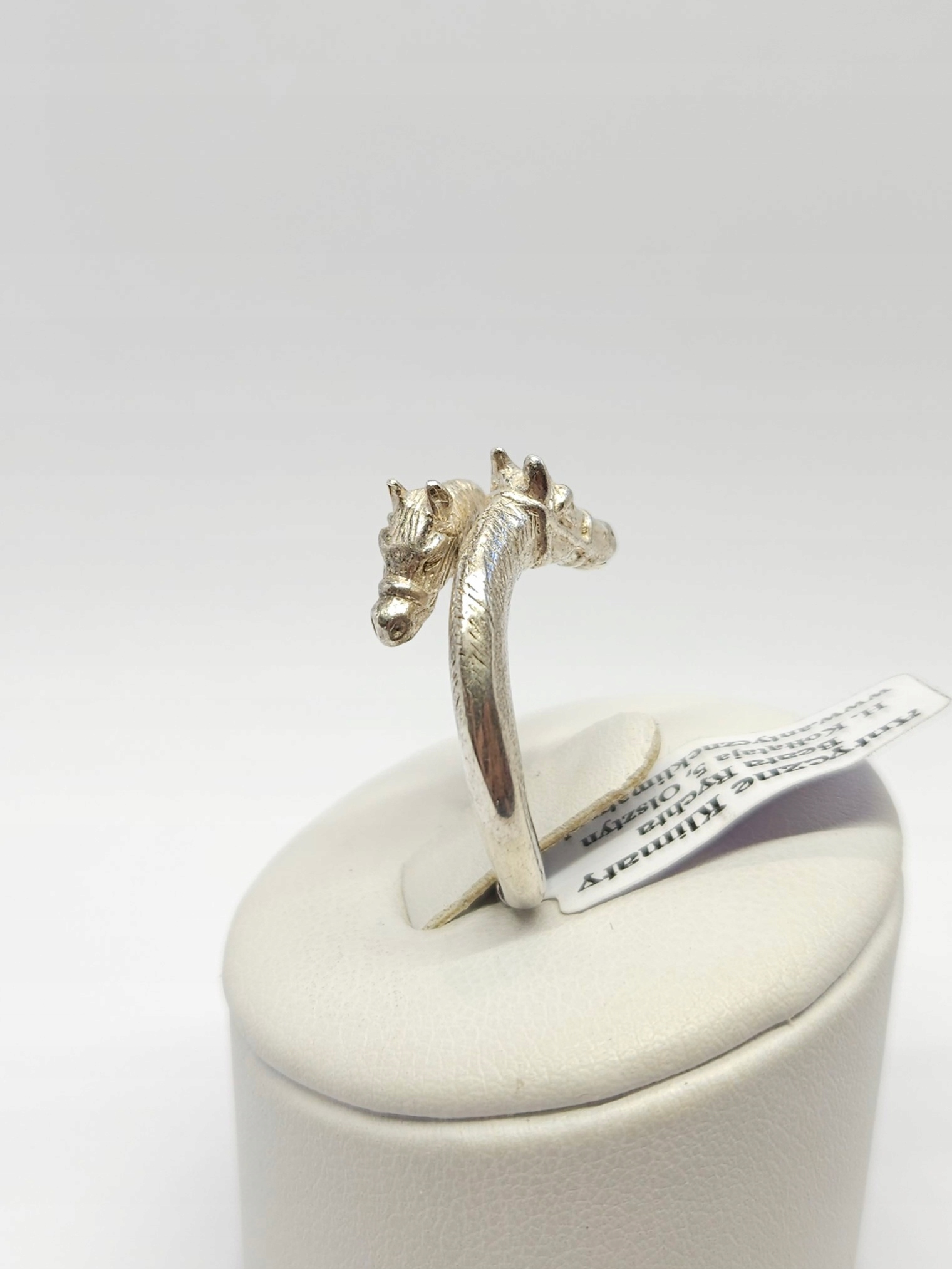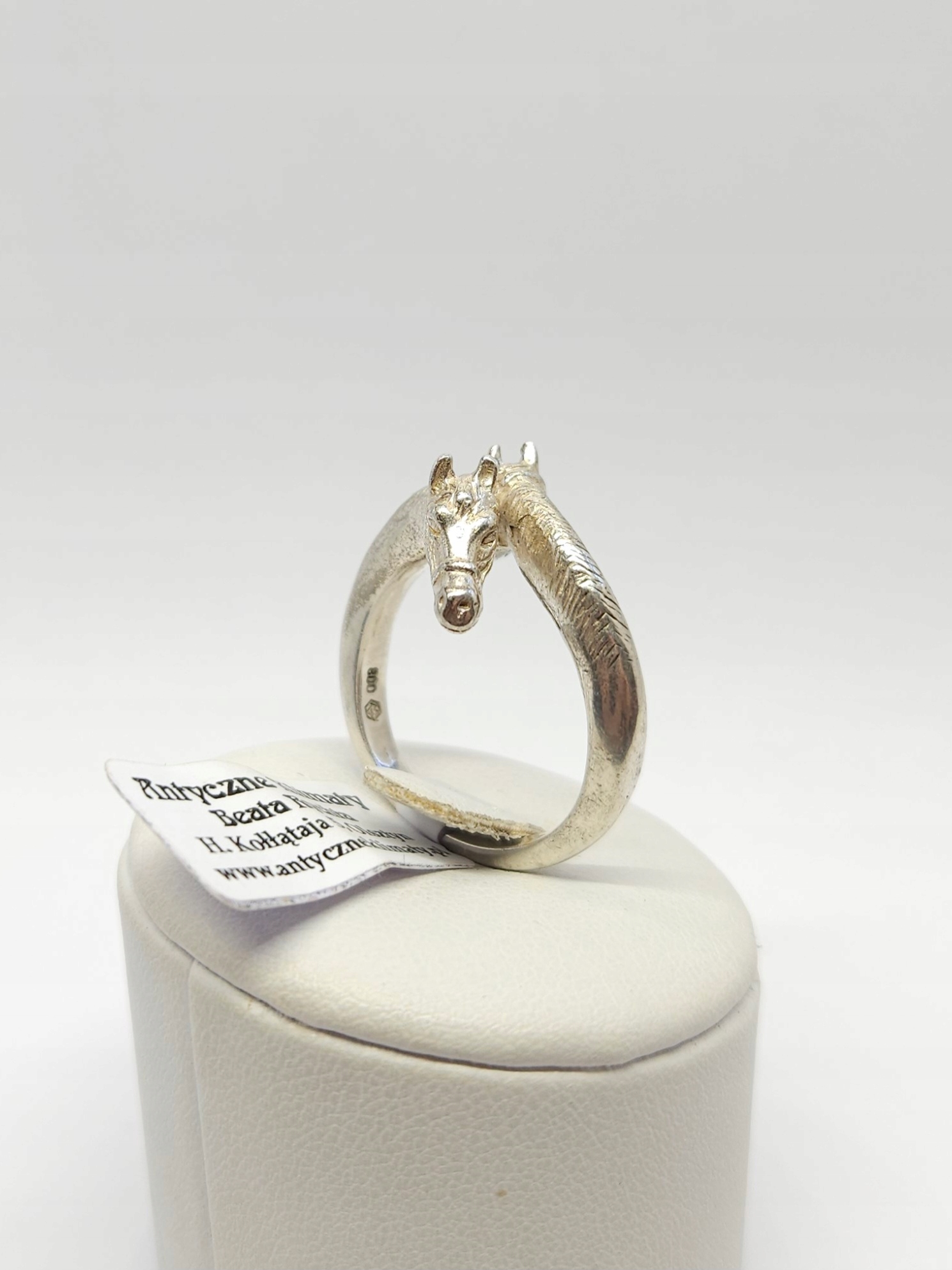 Srebrny, otwarty w górnej części pierścionek, zdobiony motywem dwóch główek koni