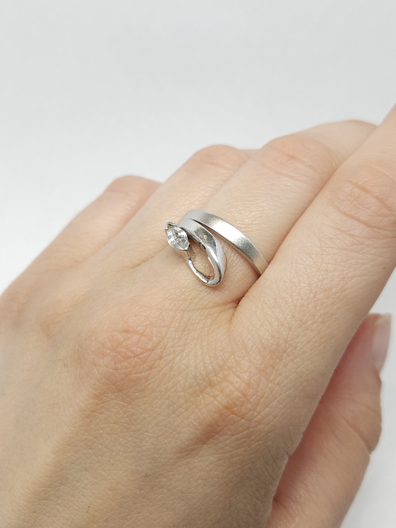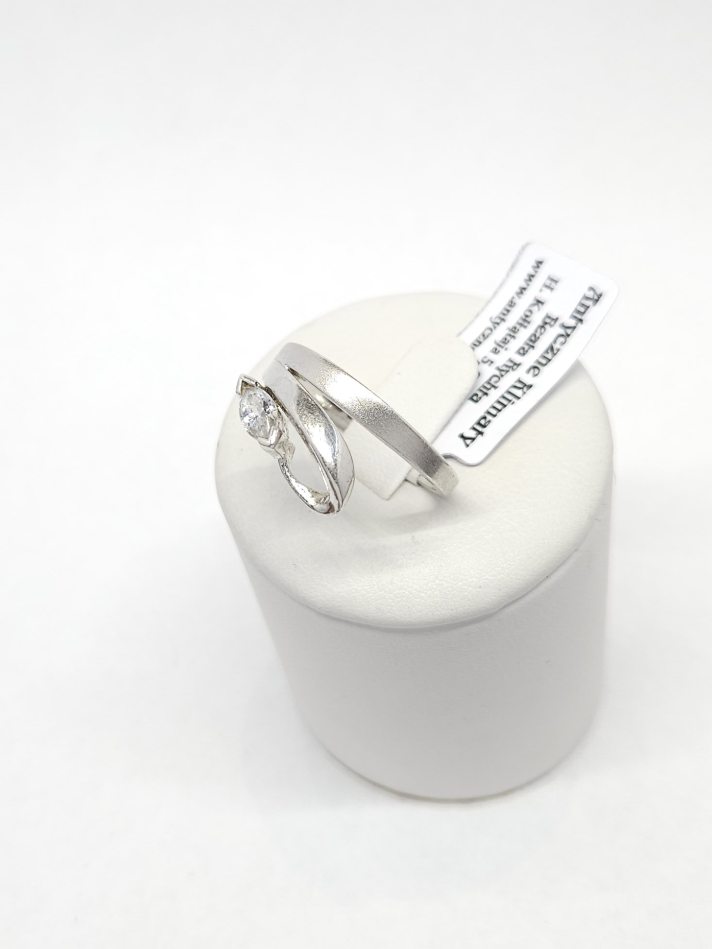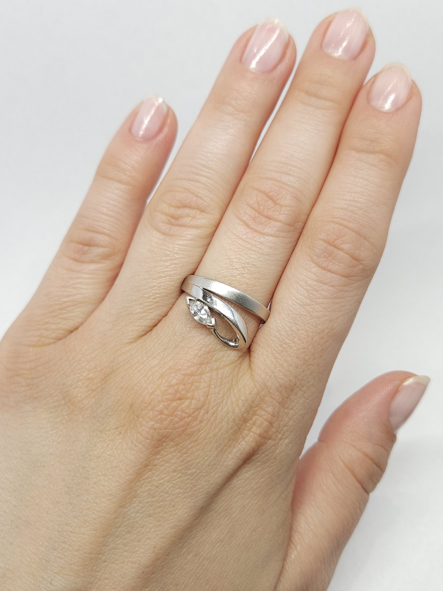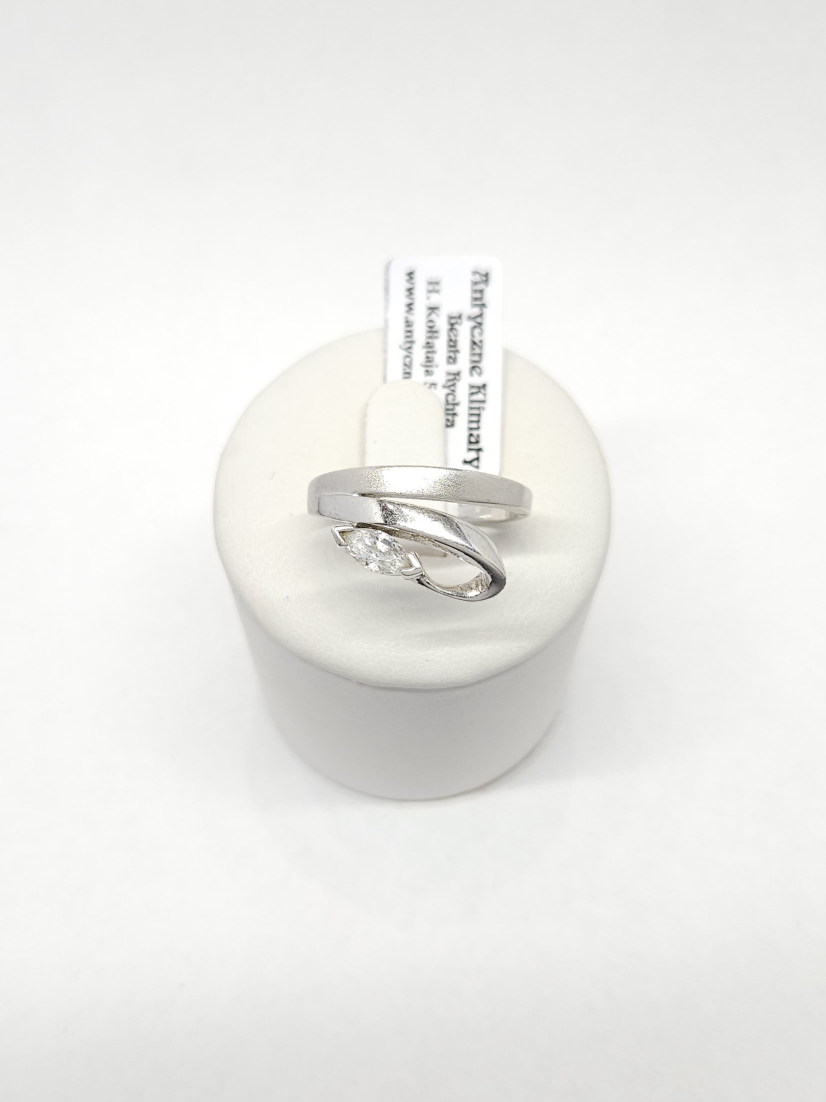 Srebrny pierścionek w roślinnej formie, z pojedynczą cyrkonią, o miejscowo polerowanej i matowionej powierzchni