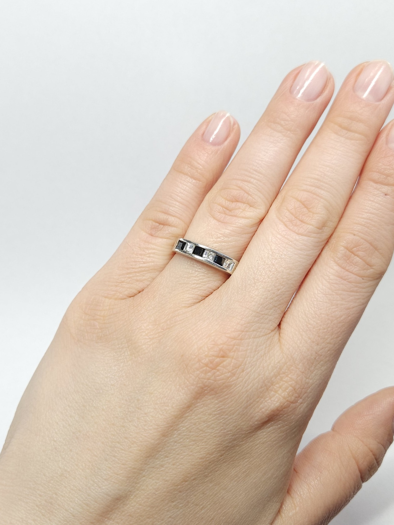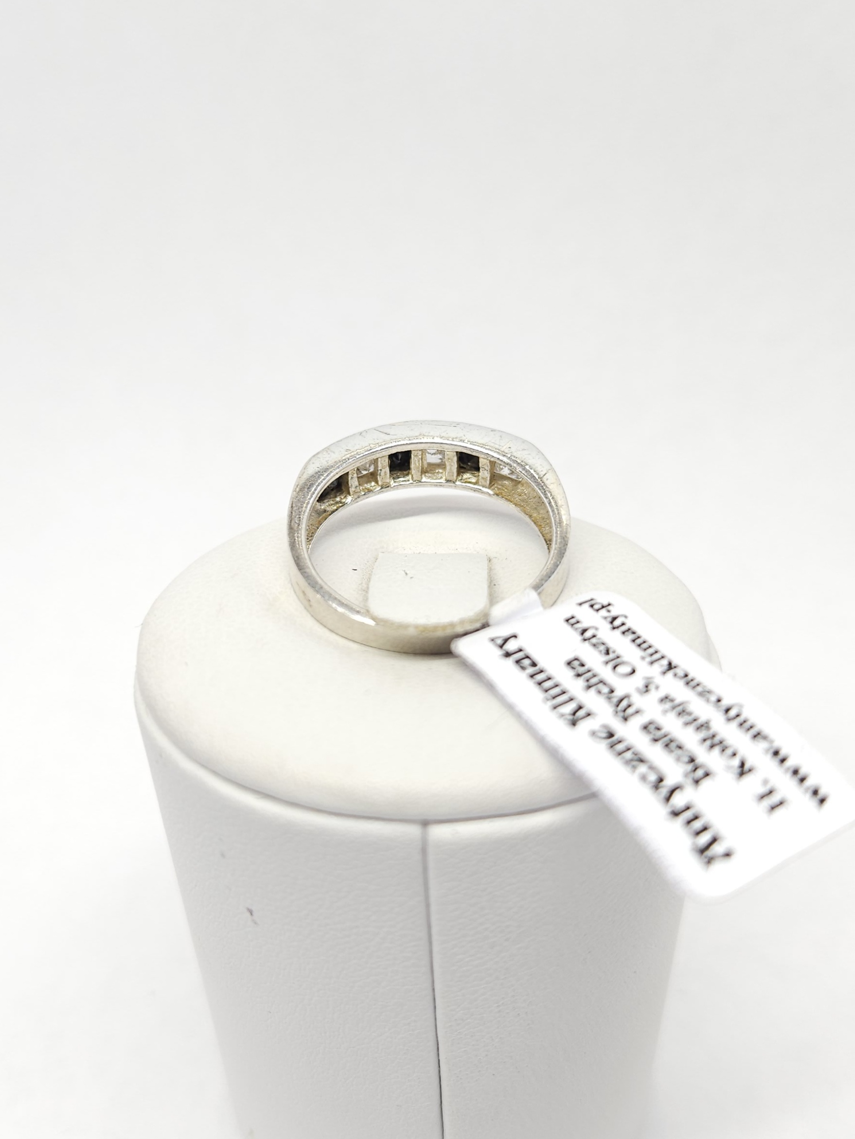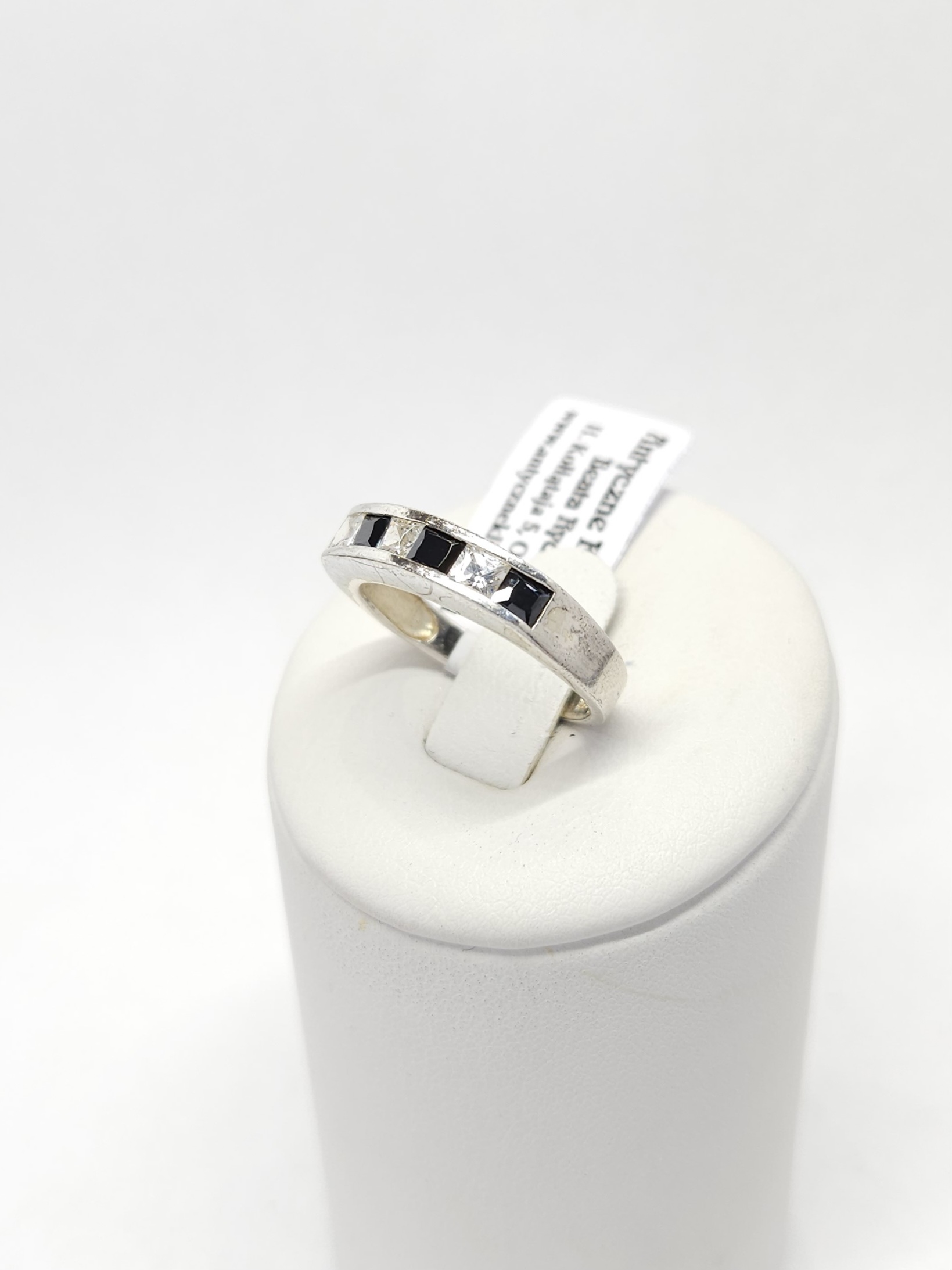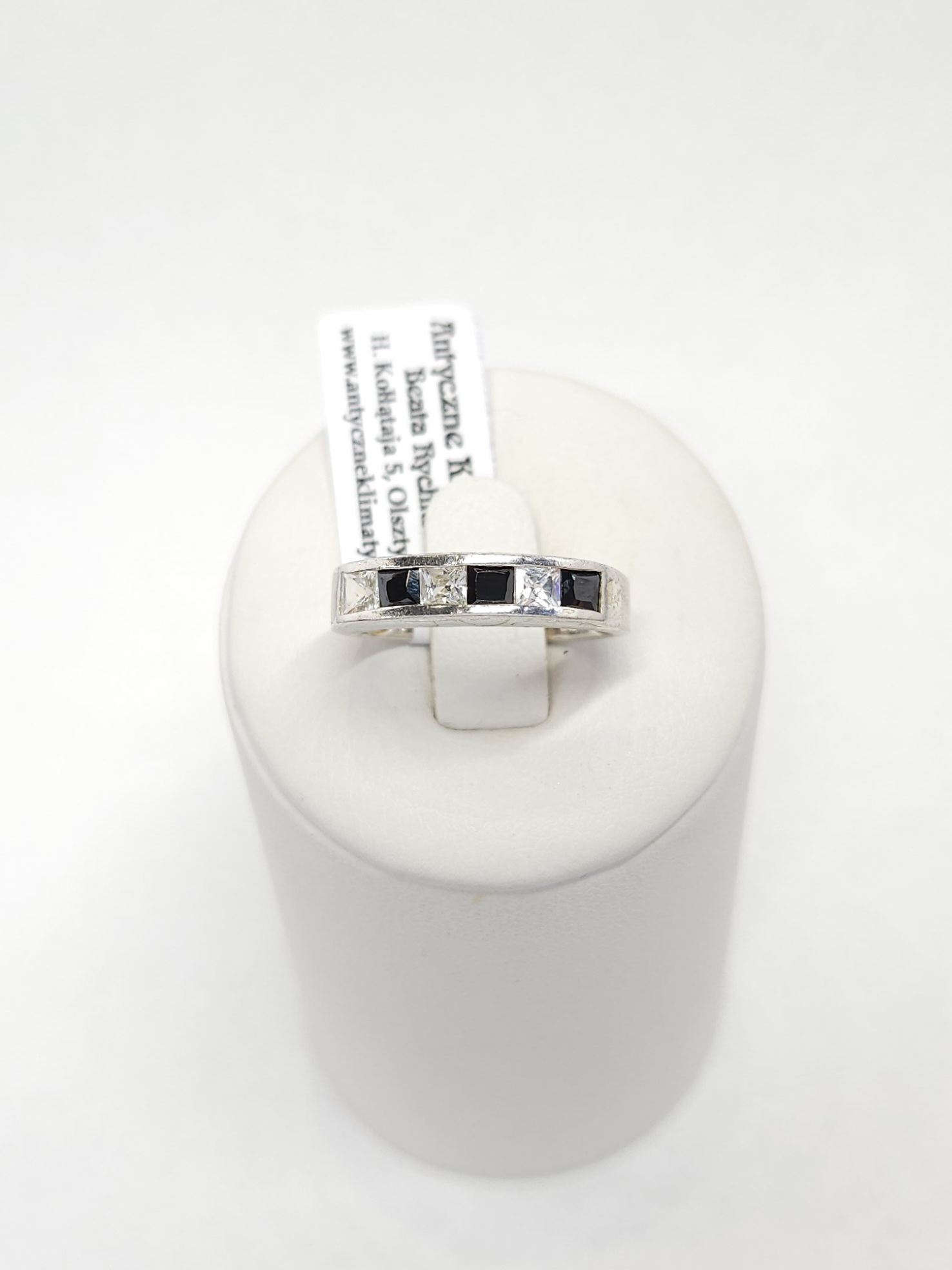 Srebrny pierścionek, wysadzany bezbarwnymi i czarnymi cyrkoniami barwionymi, osadzonymi naprzemiennie