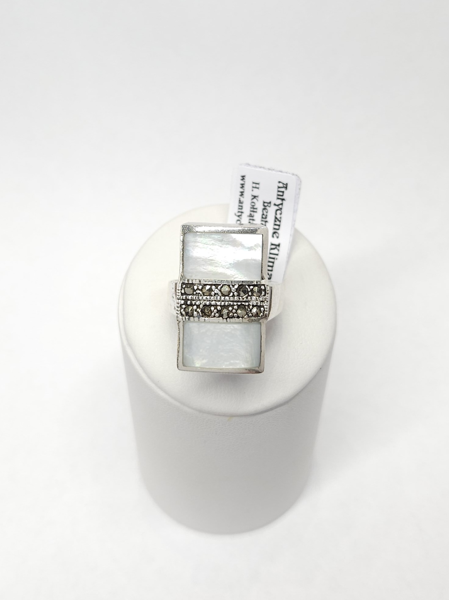 Srebrny pierścionek z prostokątnym elementem ozdobnym, dekorowanym masą perłową i markazytami