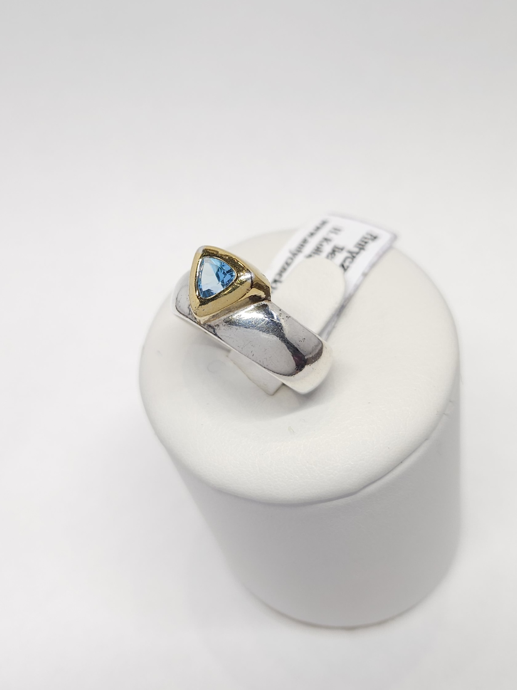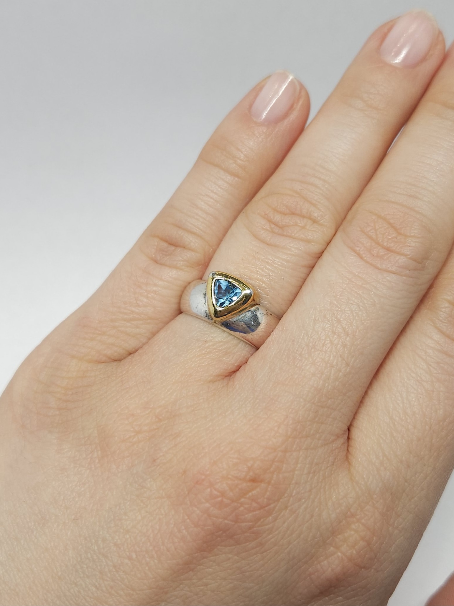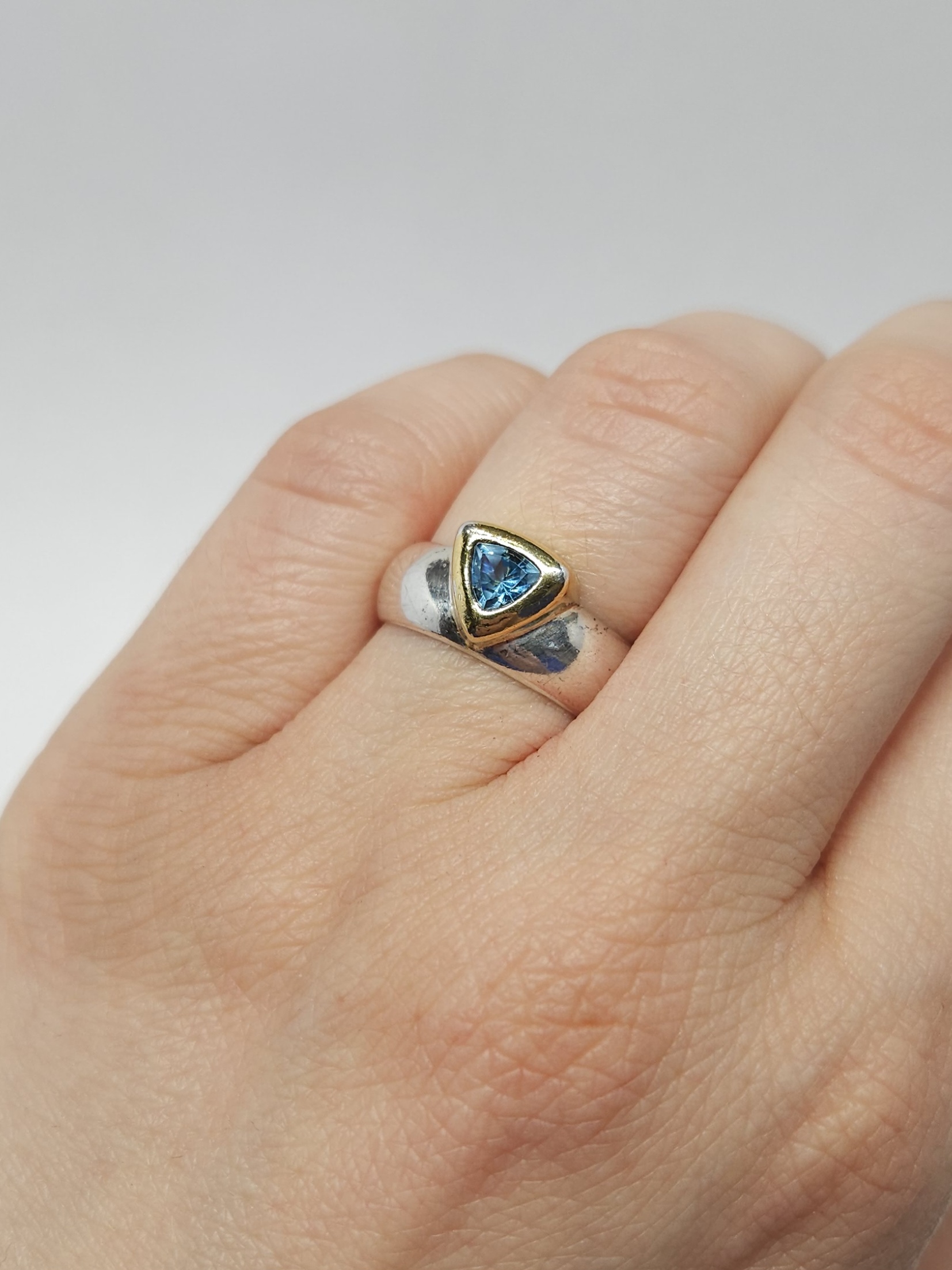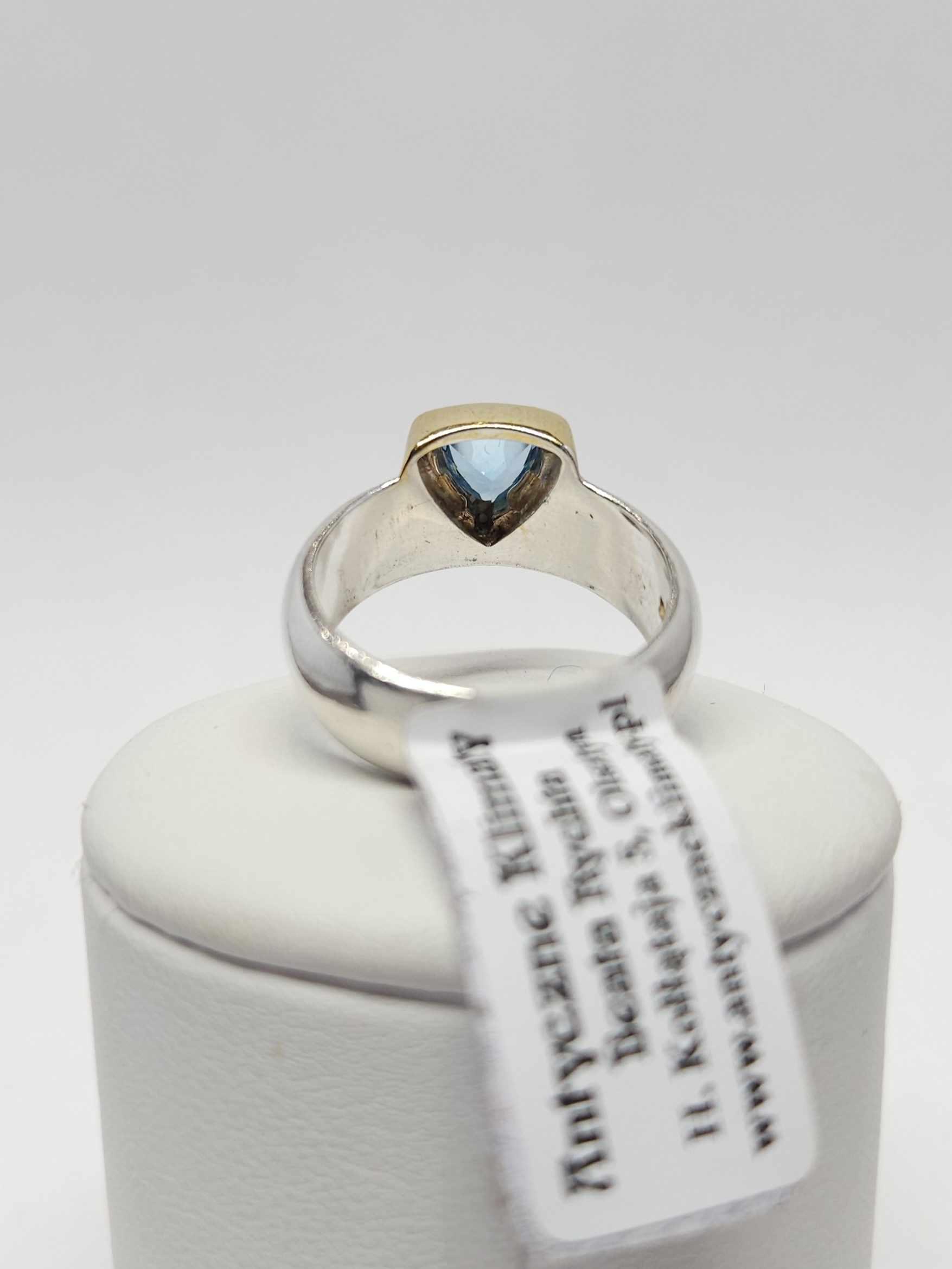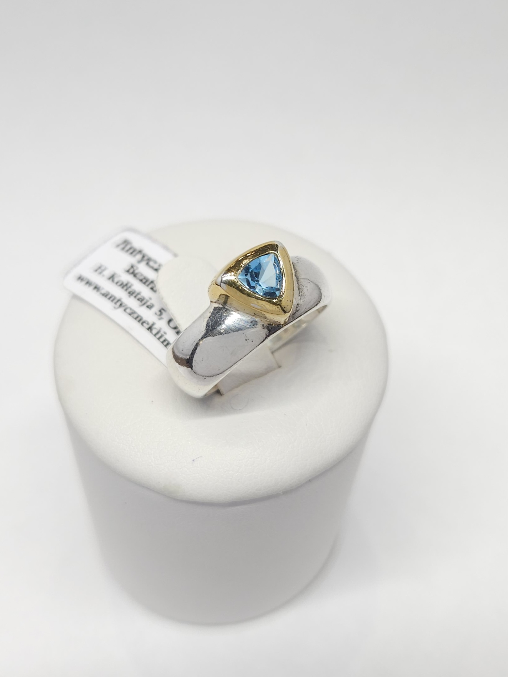 Srebrny, zaokrąglony pierścionek, z trójkątnym, pozłacanym elementem ozdobnym, z niebieskim kamieniem naturalnym