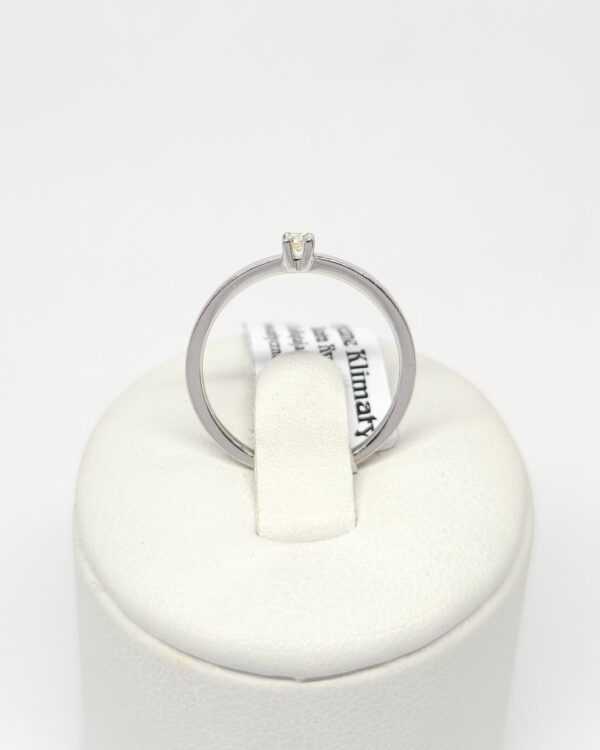 Delikatny pierścionek z białego złota, z pojedynczym diamentem w szlifie brylantowym o masie ~ 0,04ct, barwie i czystości K-L/Si2