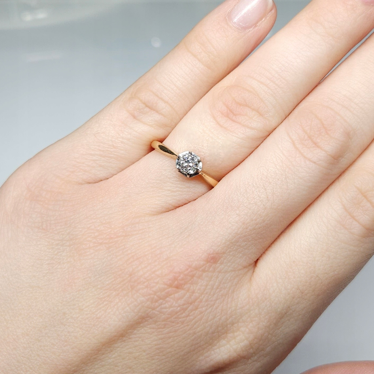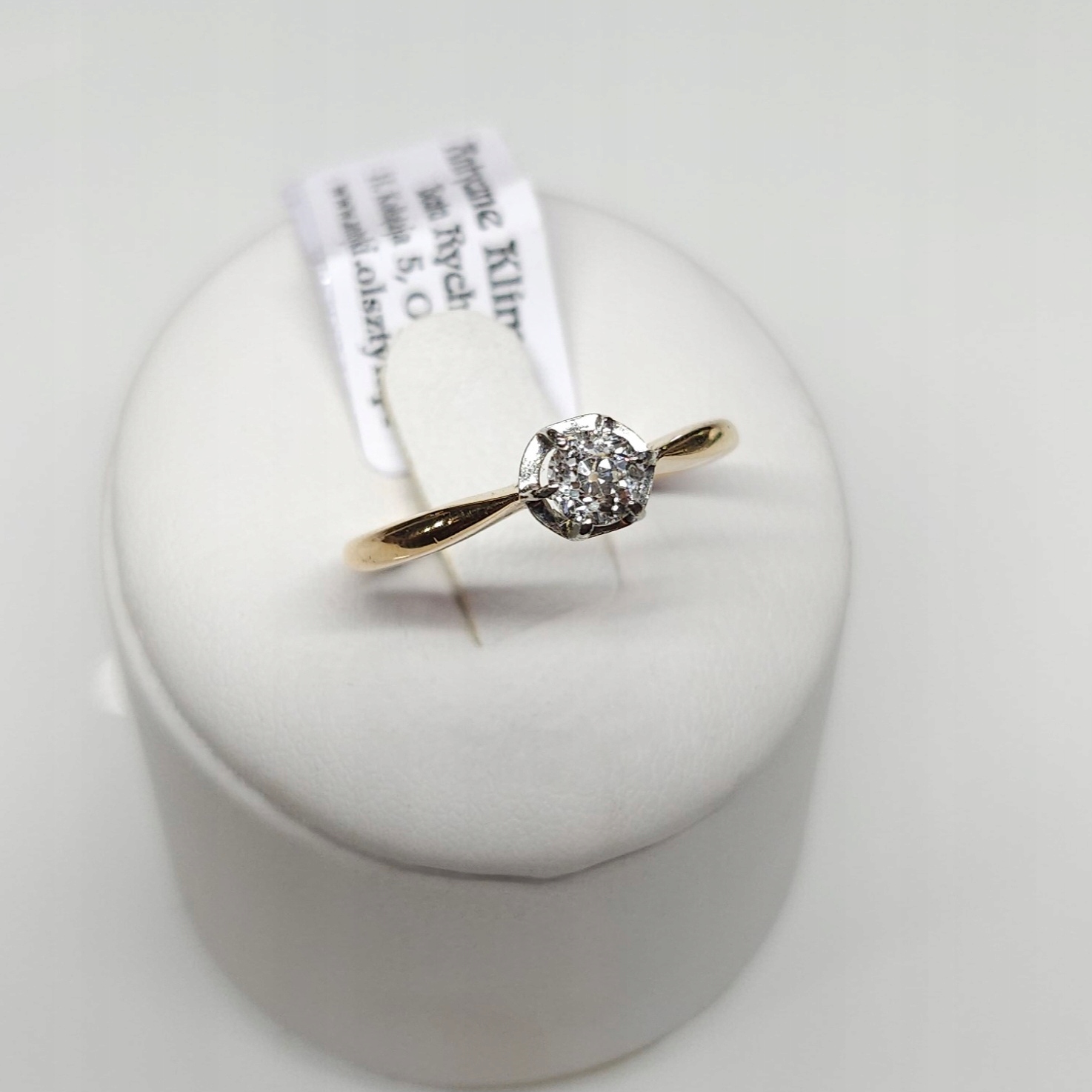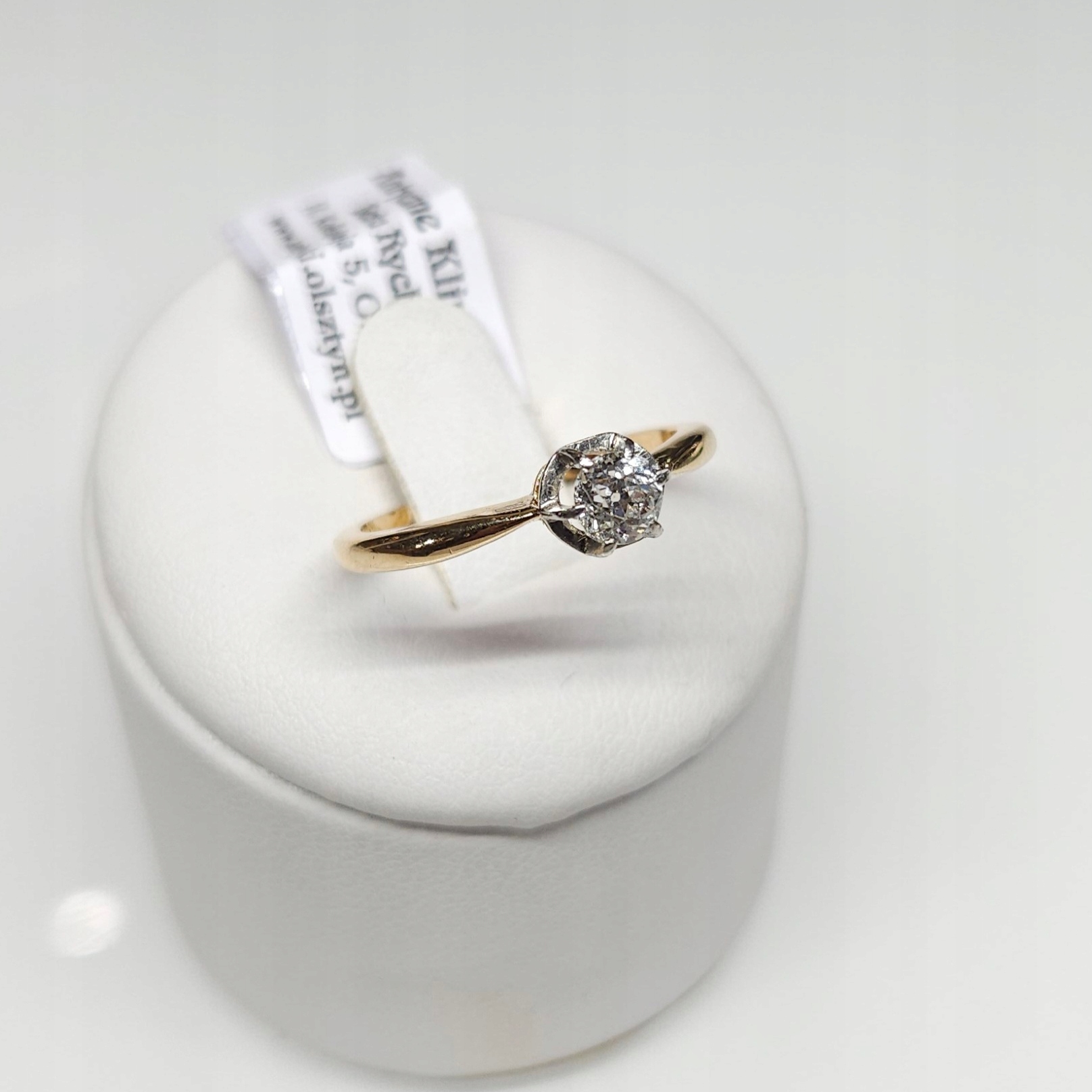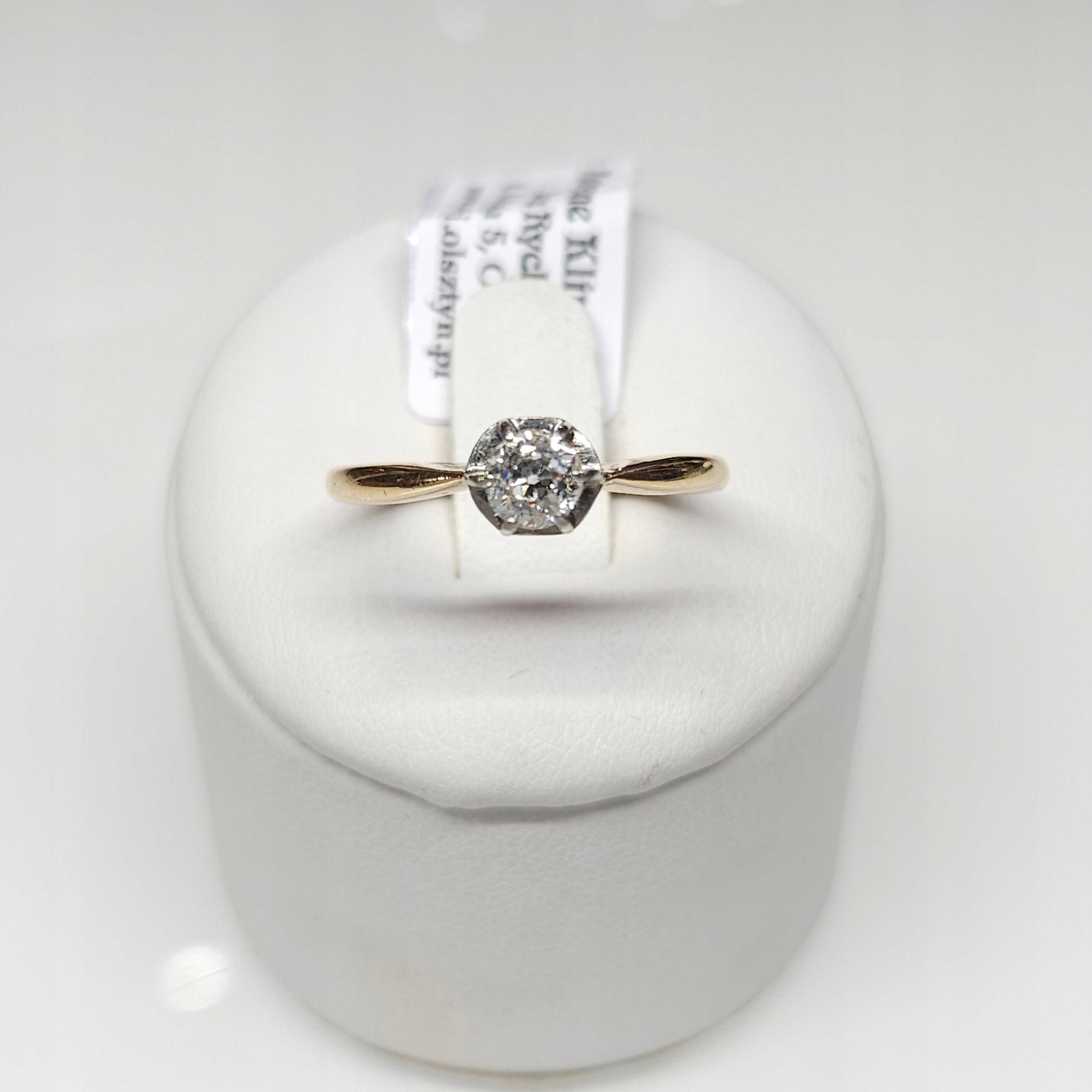 Przedmiotem sprzedaży jest złoty pierścionek z pojedynczym diamentem w starym szlifie brylantowym , w geometrycznej, podwyższonej oprawie