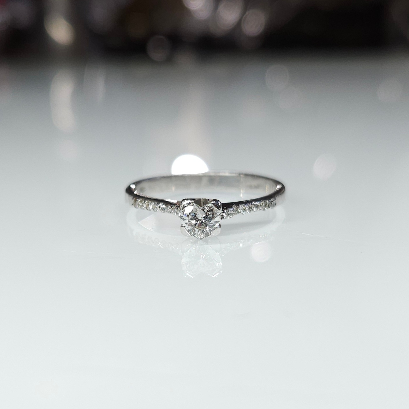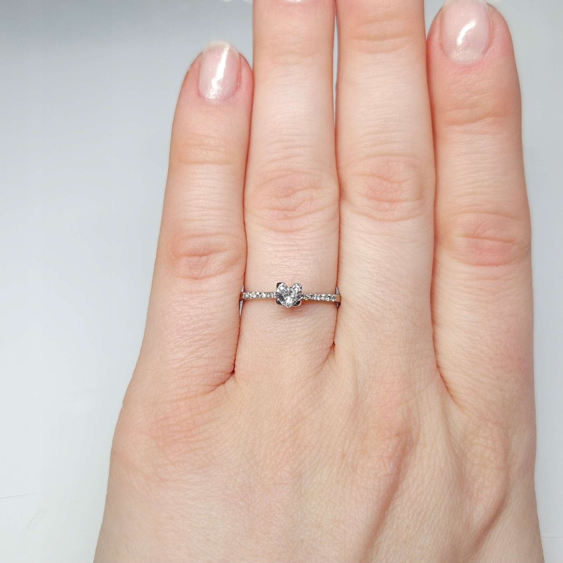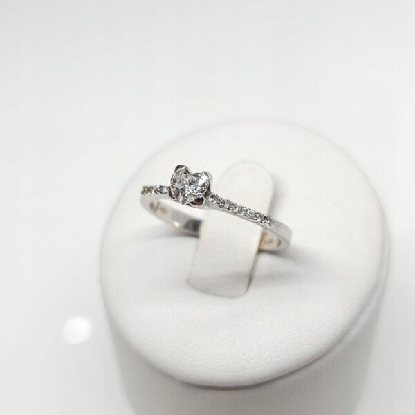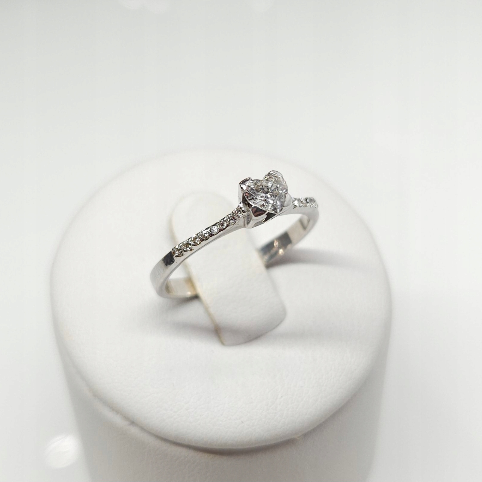 Pierścionek z białego złota, z pojedynczym, centralnym diamentem, szlifowanym w kształcie serca: 1 szt. o masie ~0,20ct, w podwyższonej oprawie oraz mniejszymi diamentami w szlifie brylantowym: 16 szt. o łącznej masie ~ 0,10ct, po 8 szt. po każdej stronie