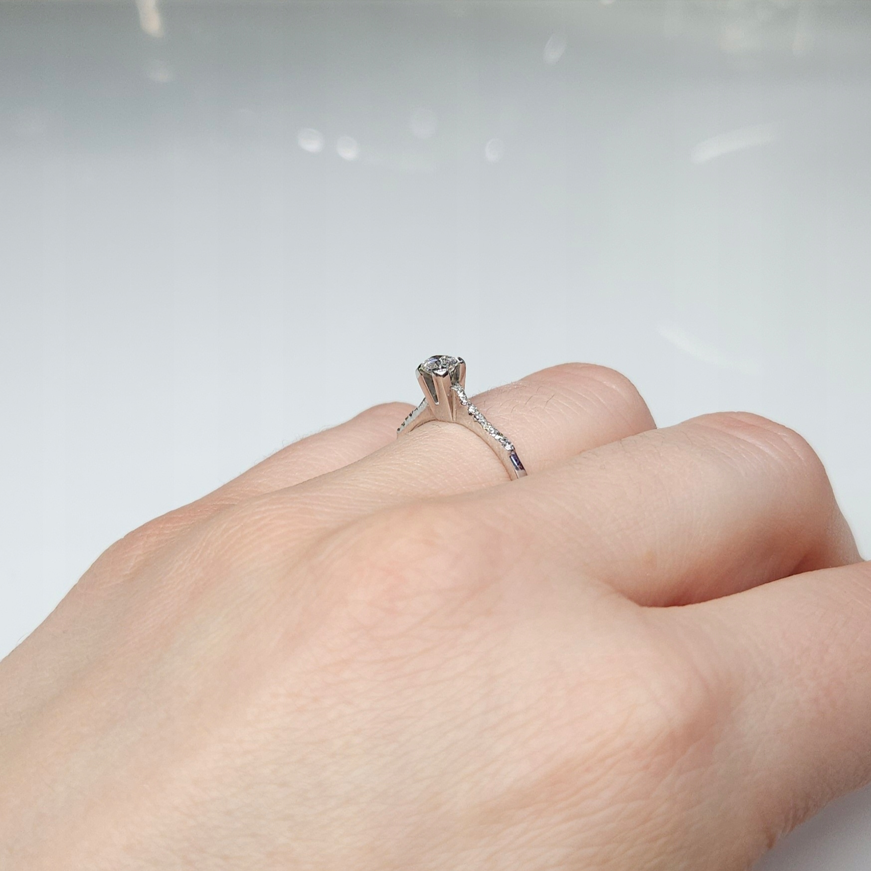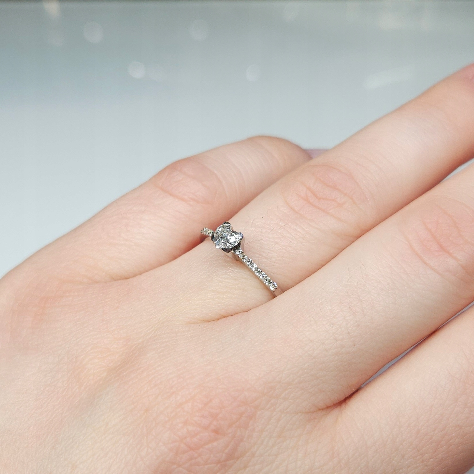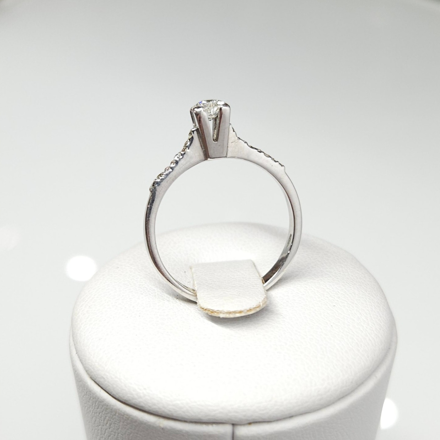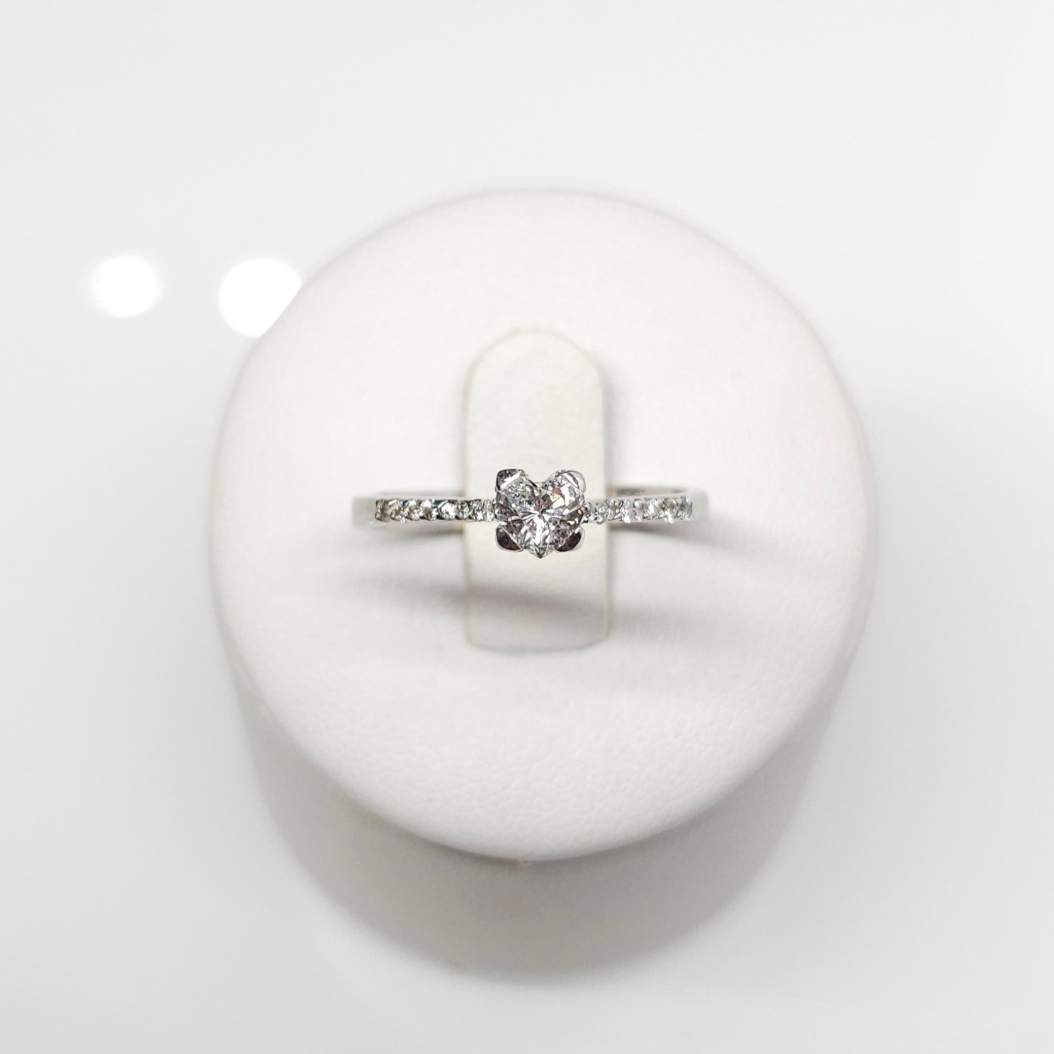 Pierścionek z białego złota, z pojedynczym, centralnym diamentem, szlifowanym w kształcie serca: 1 szt. o masie ~0,20ct, w podwyższonej oprawie oraz mniejszymi diamentami w szlifie brylantowym: 16 szt. o łącznej masie ~ 0,10ct, po 8 szt. po każdej stronie