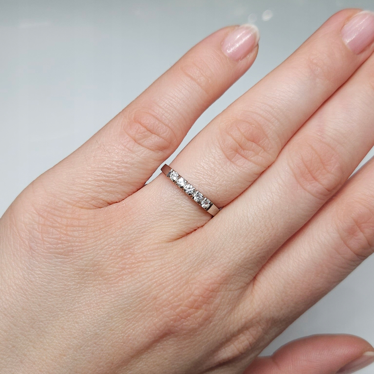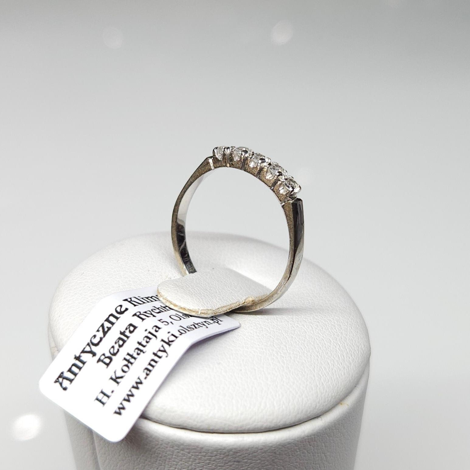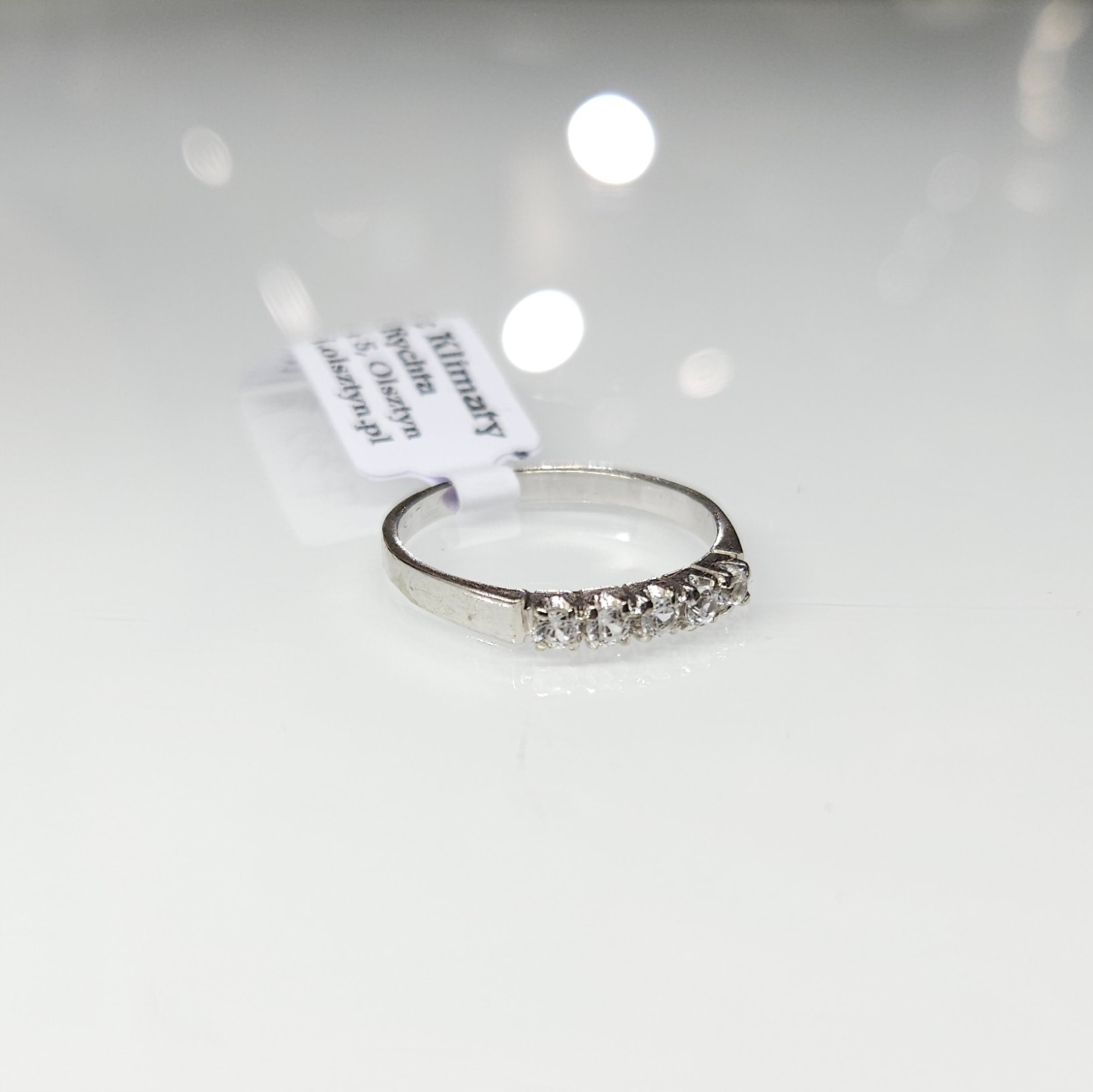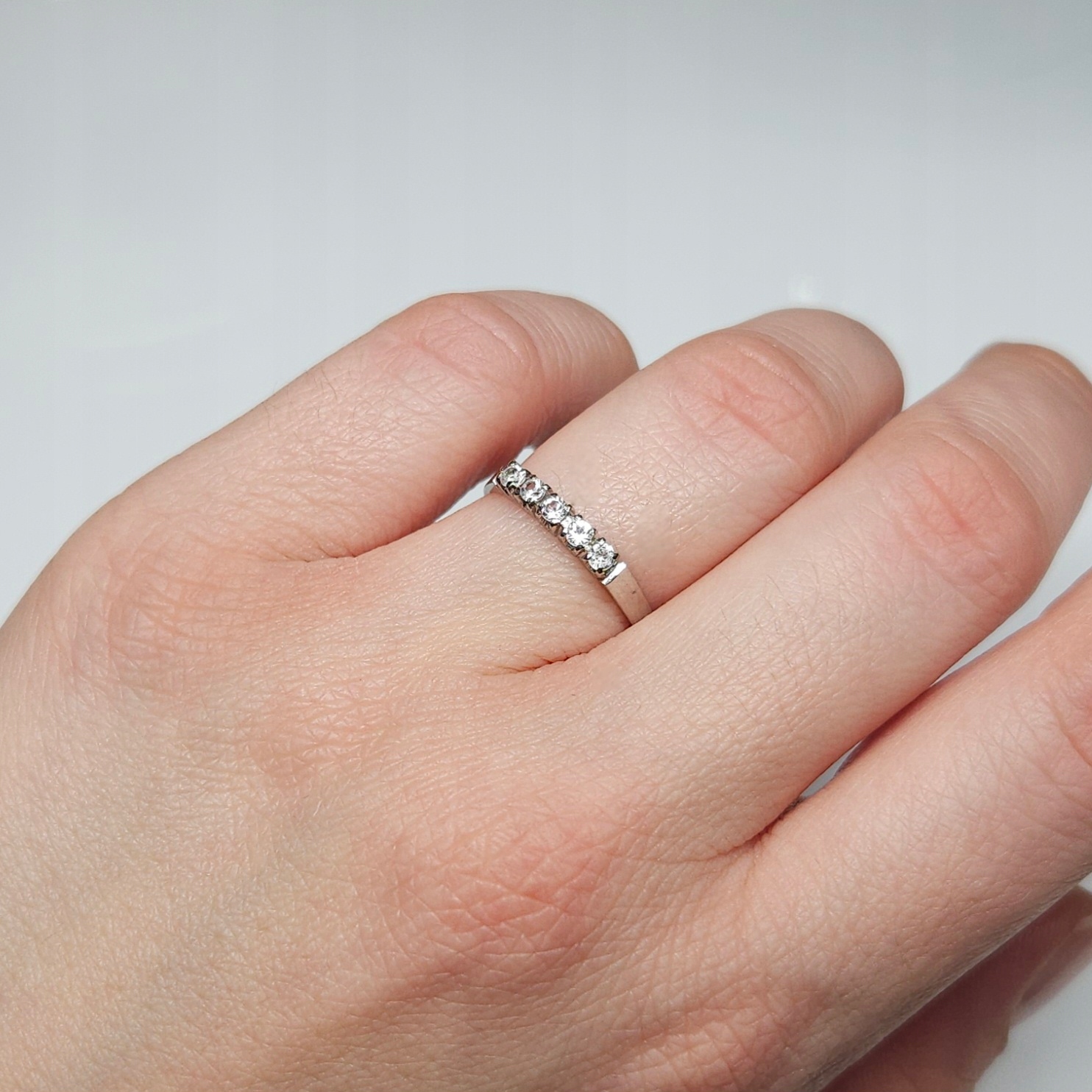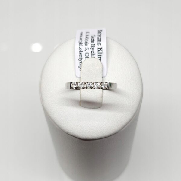 Delikatny pierścionek – obrączka z białego złota, zdobiony pięcioma bezbarwnymi kamieniami naturalnymi