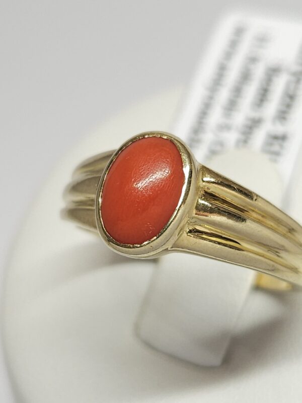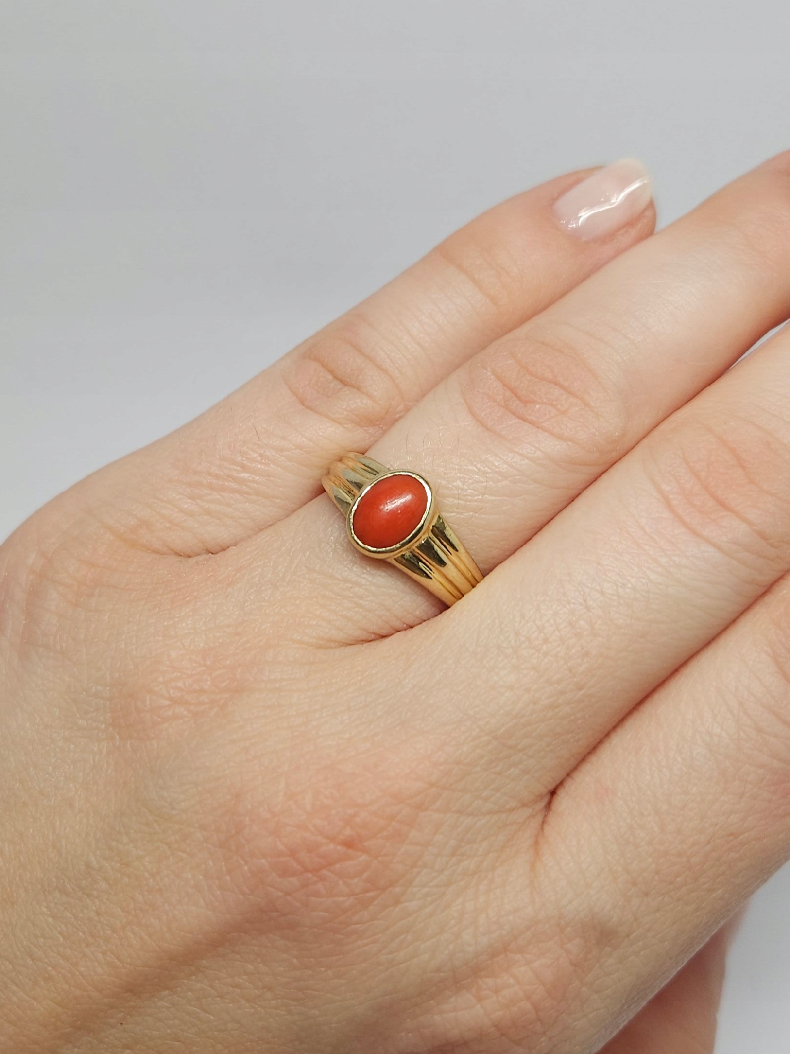 Złoty pierścionek z owalnym koralem w szlifie kaboszonowym