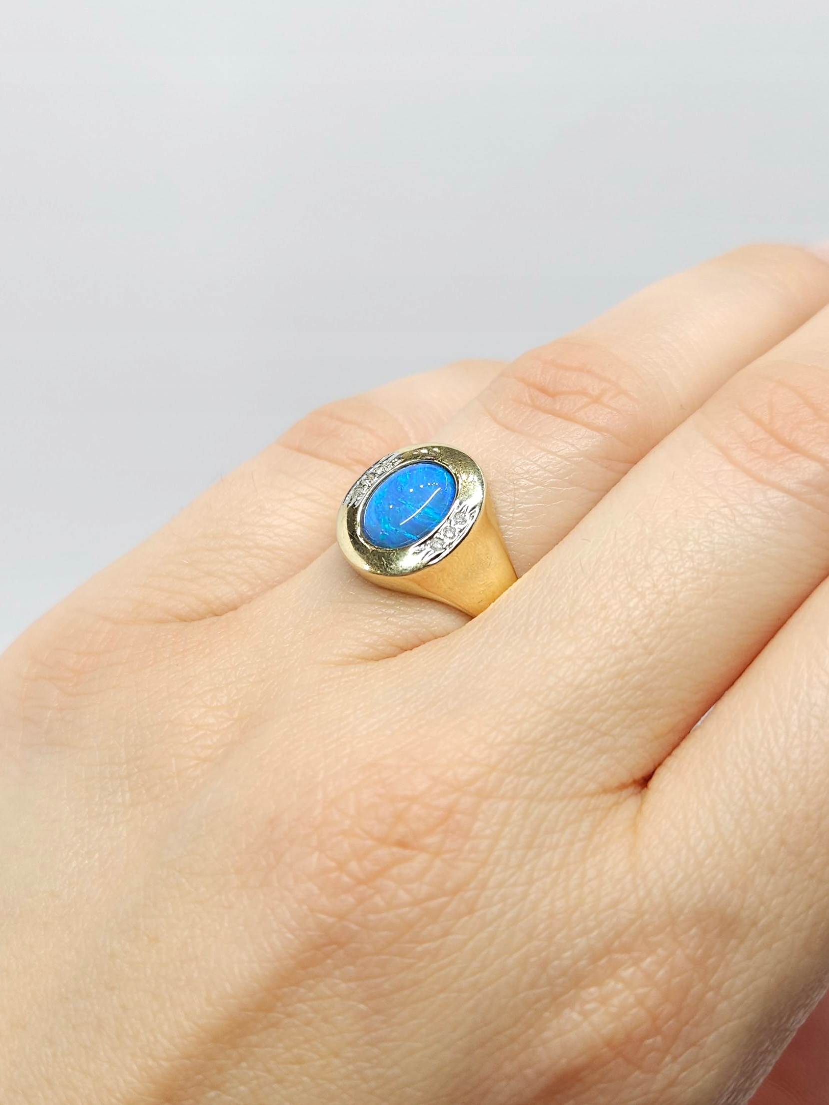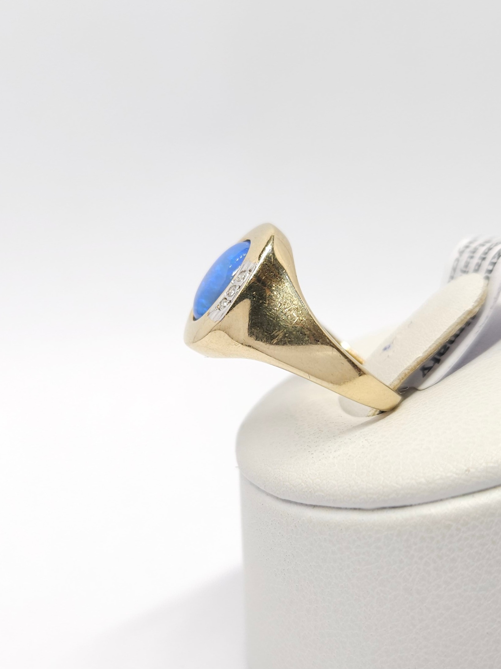 Złoty pierścionek z owalnym opalem w dublecie (opal pod bezbarwnym kamieniem w szlifie kaboszonowym) oraz diamentami w szlifie brylantowym: 6szt. o łącznej masie ~0,024ct