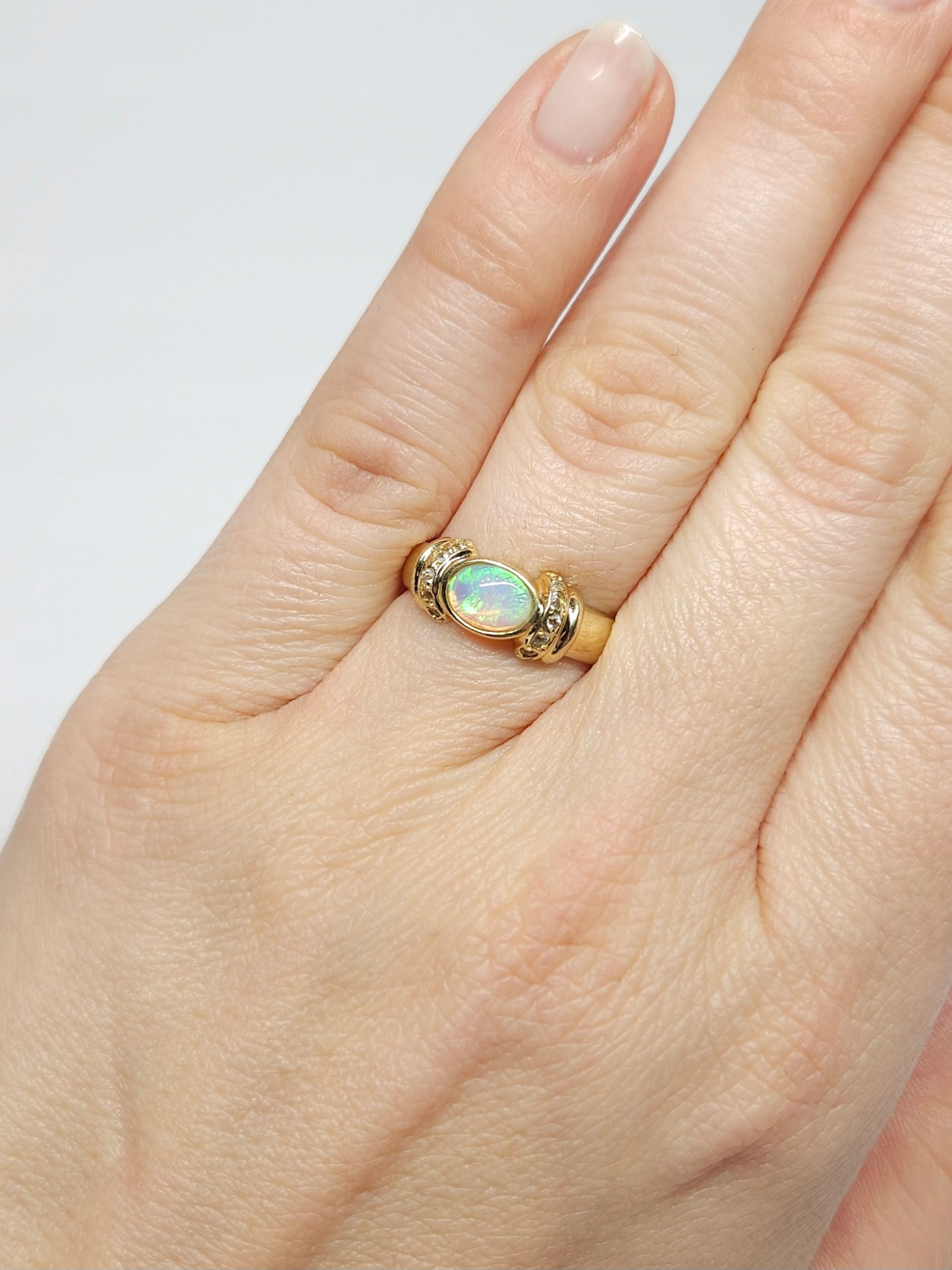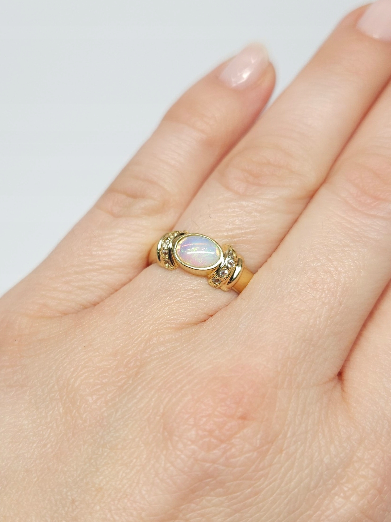 Złoty pierścionek z owalnym opalem w szlifie kaboszonowym oraz diamentami: 10szt. o łącznej masie ~0,07ct
