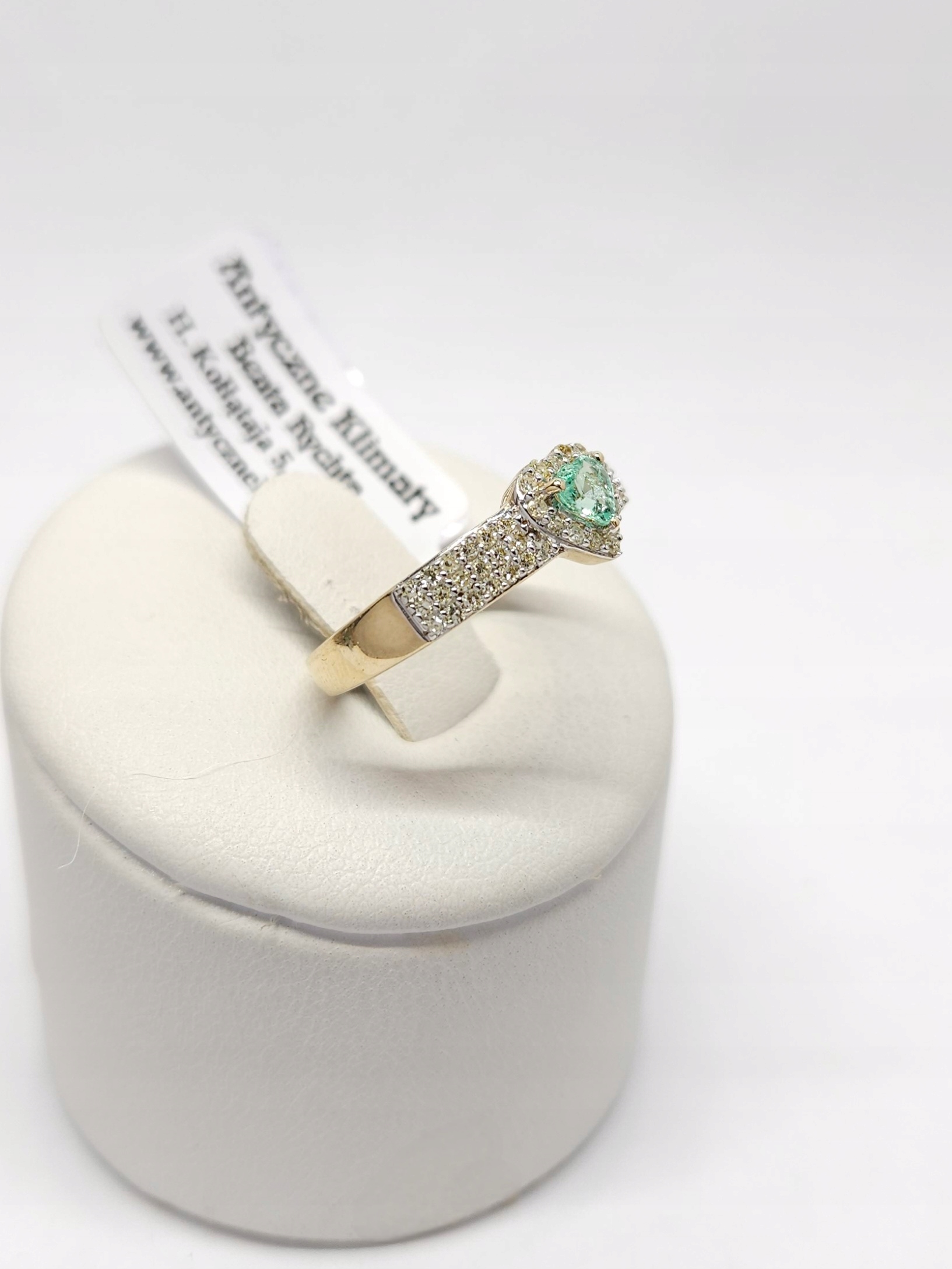 Złoty pierścionek z centralnie osadzonym, jasnozielonym kamieniem naturalnym w szlifie serca oraz diamentami: 52szt. o łącznej masie ~0,20ct