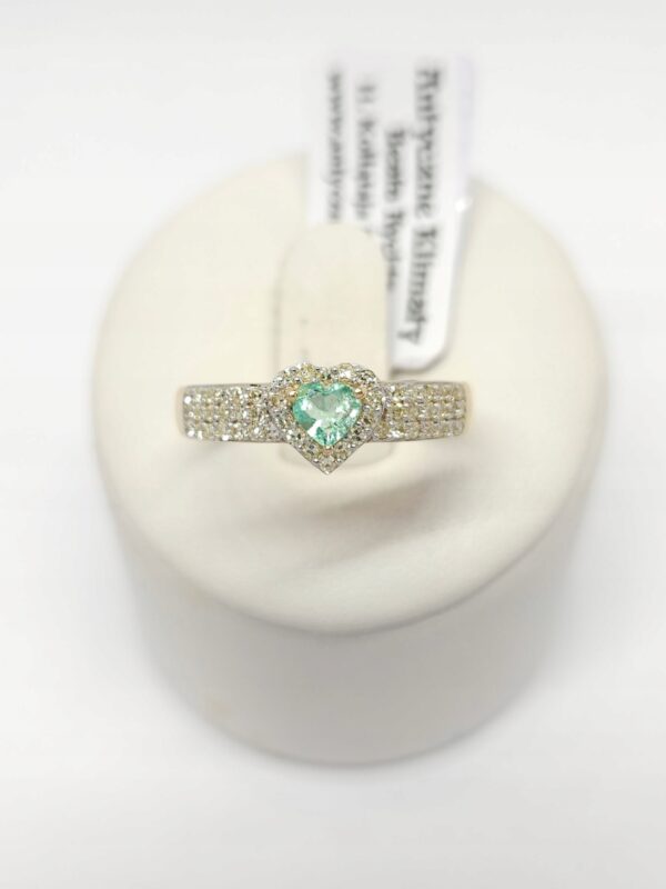 Złoty pierścionek z zielonym kamieniem – serce i diamentami, złoto 0,585