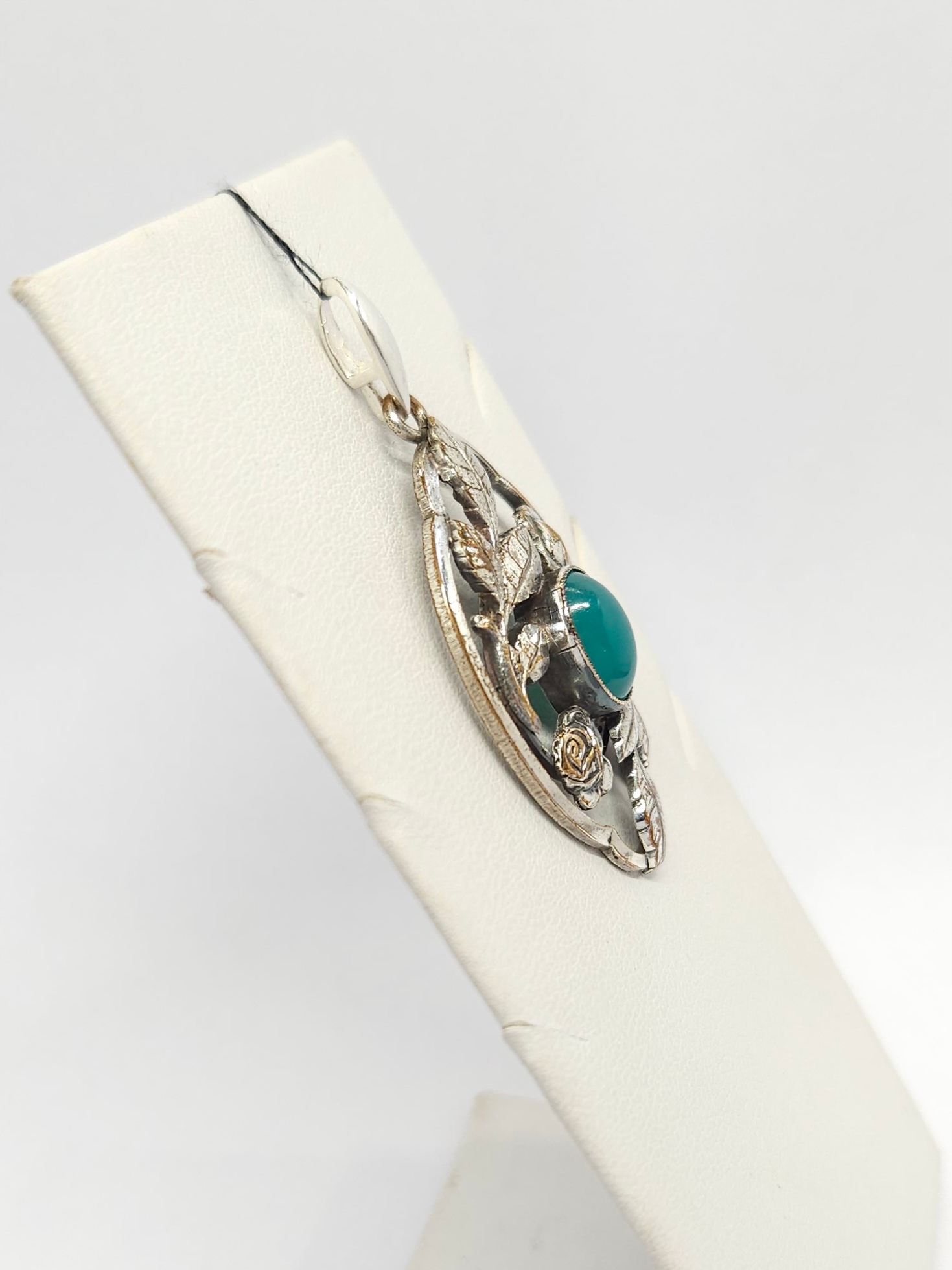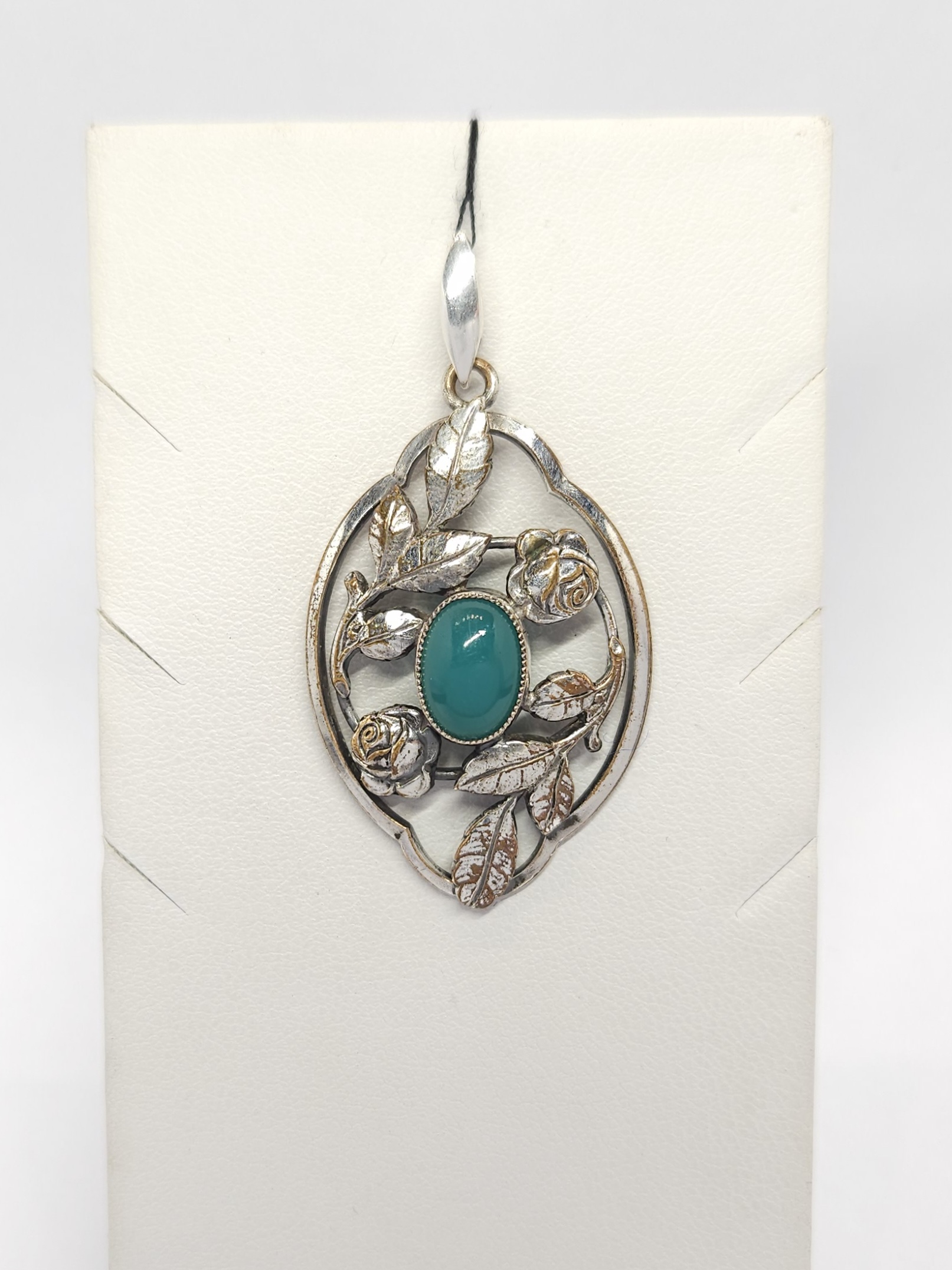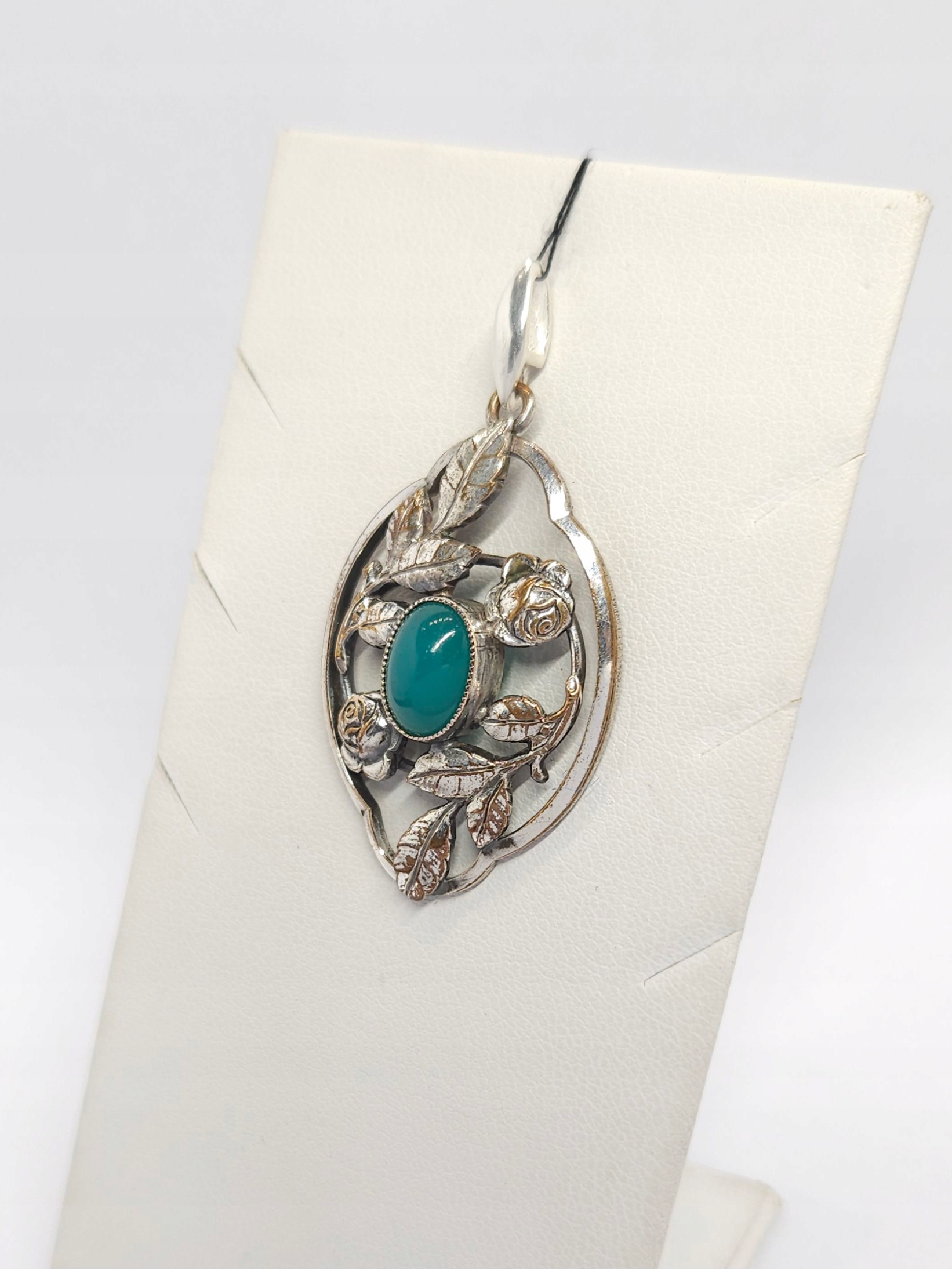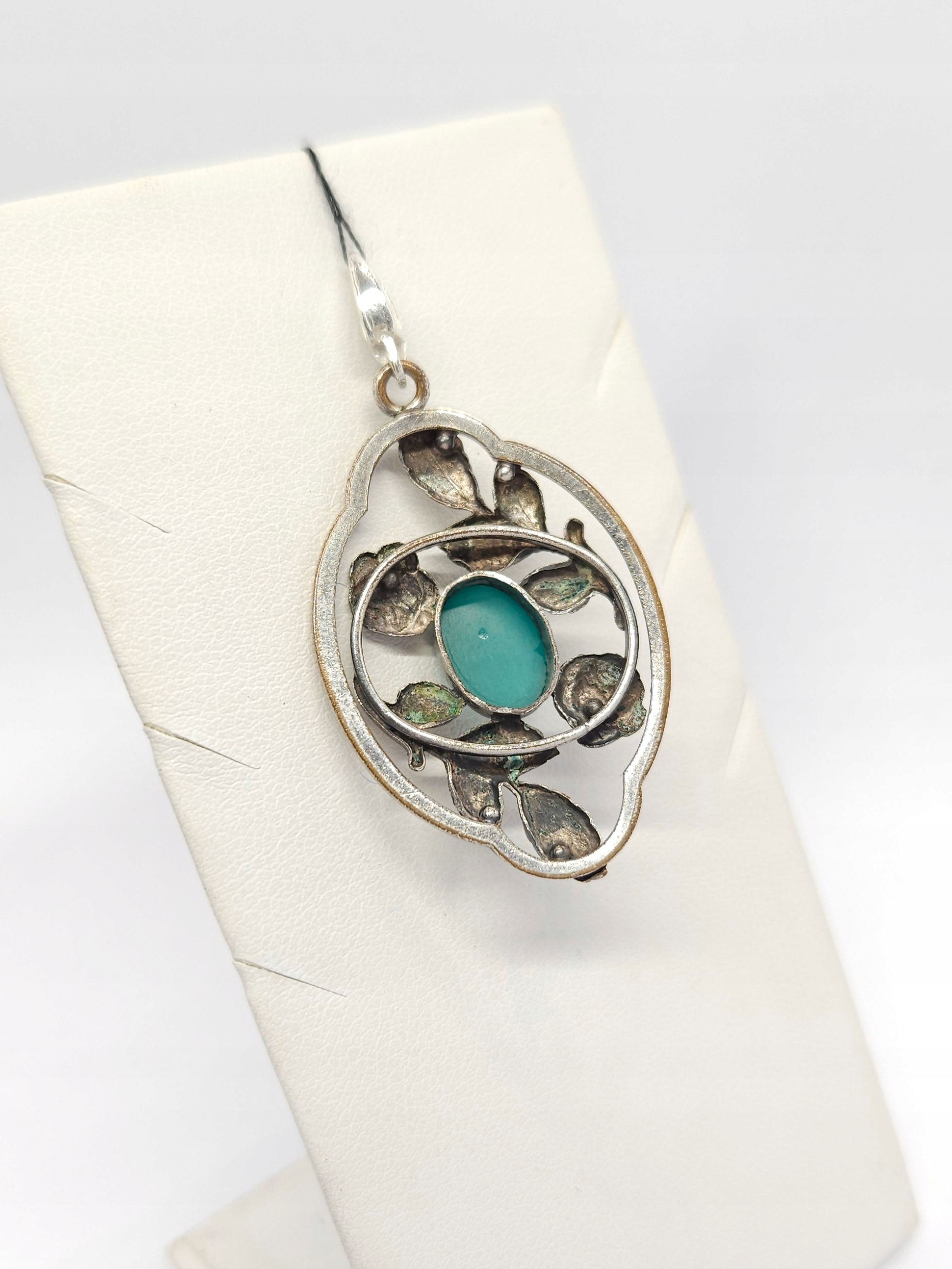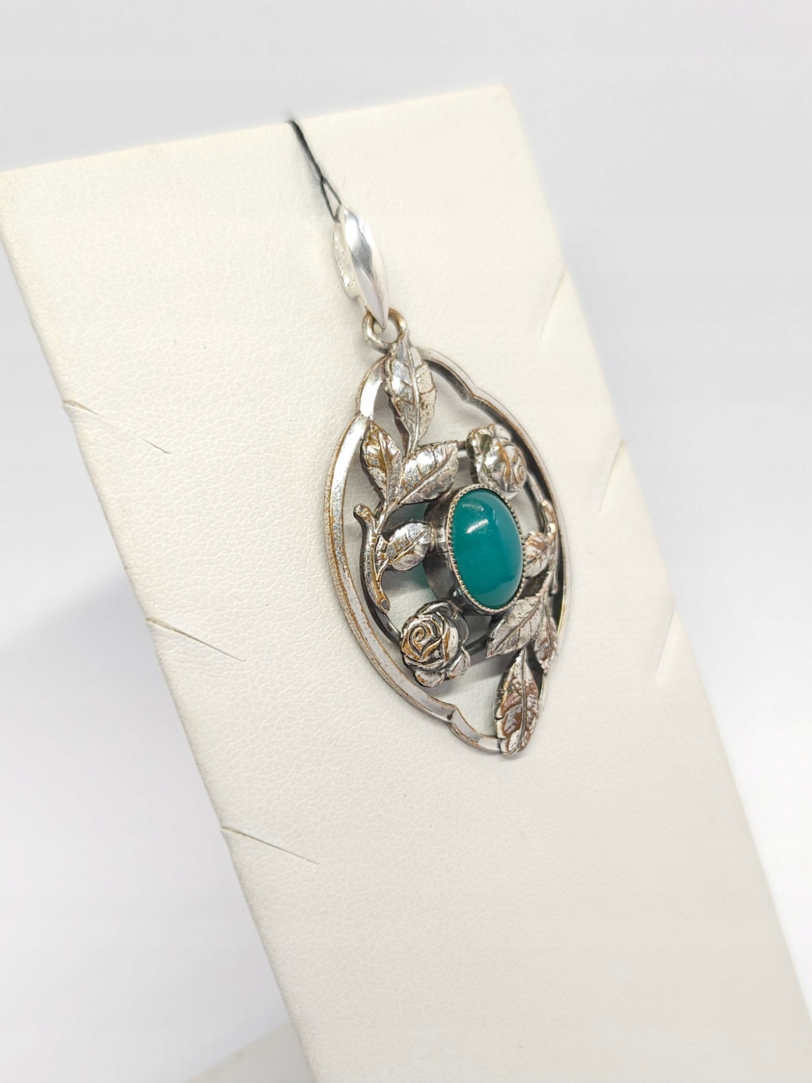 Posrebrzany wisiorek z zielonym kamieniem, mosiądz srebrzony, róże
