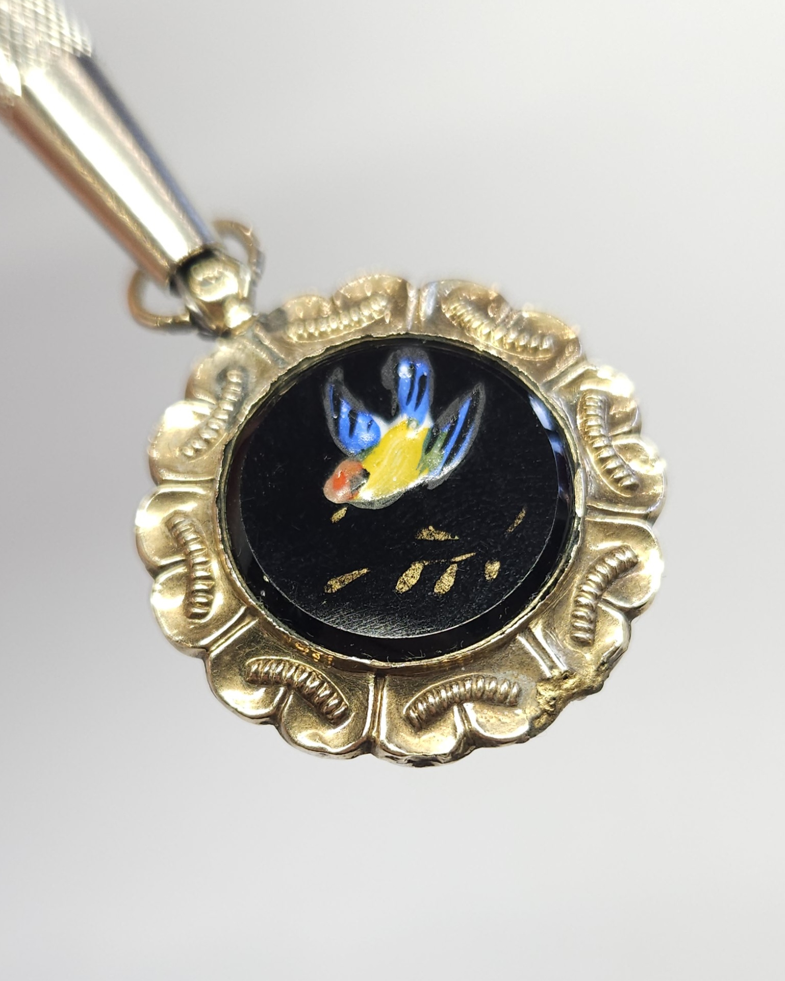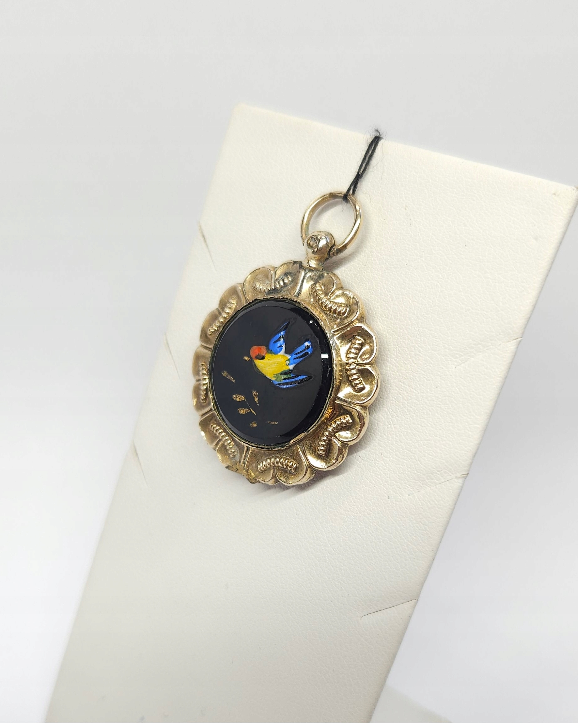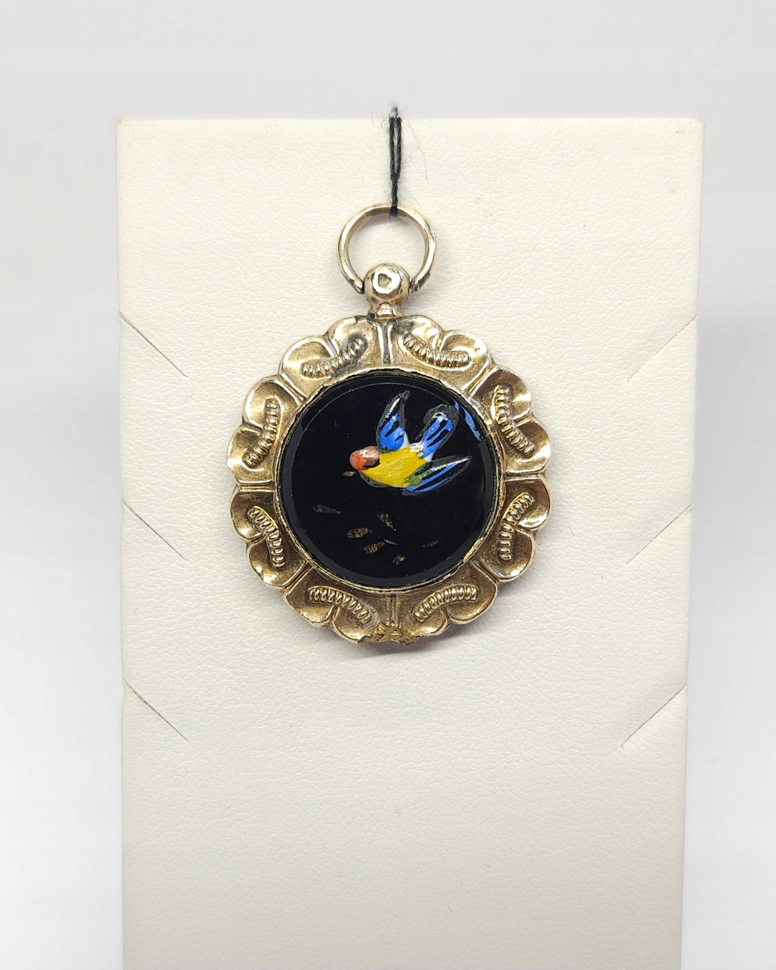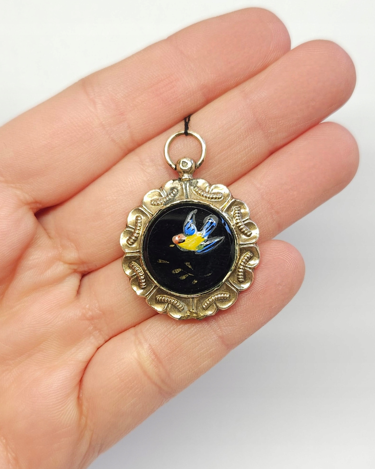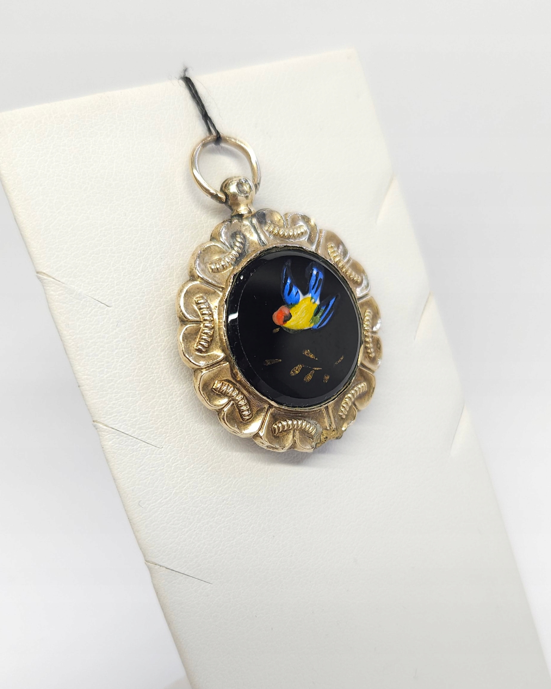 Okrągły wisiorek z kon. XIXw. – sekretnik z miejscem na zdjęcie, wykonany z mosiądzu złoconego, z czarnym onyksem, ręcznie malowanym emalią, z motywem ptaszka