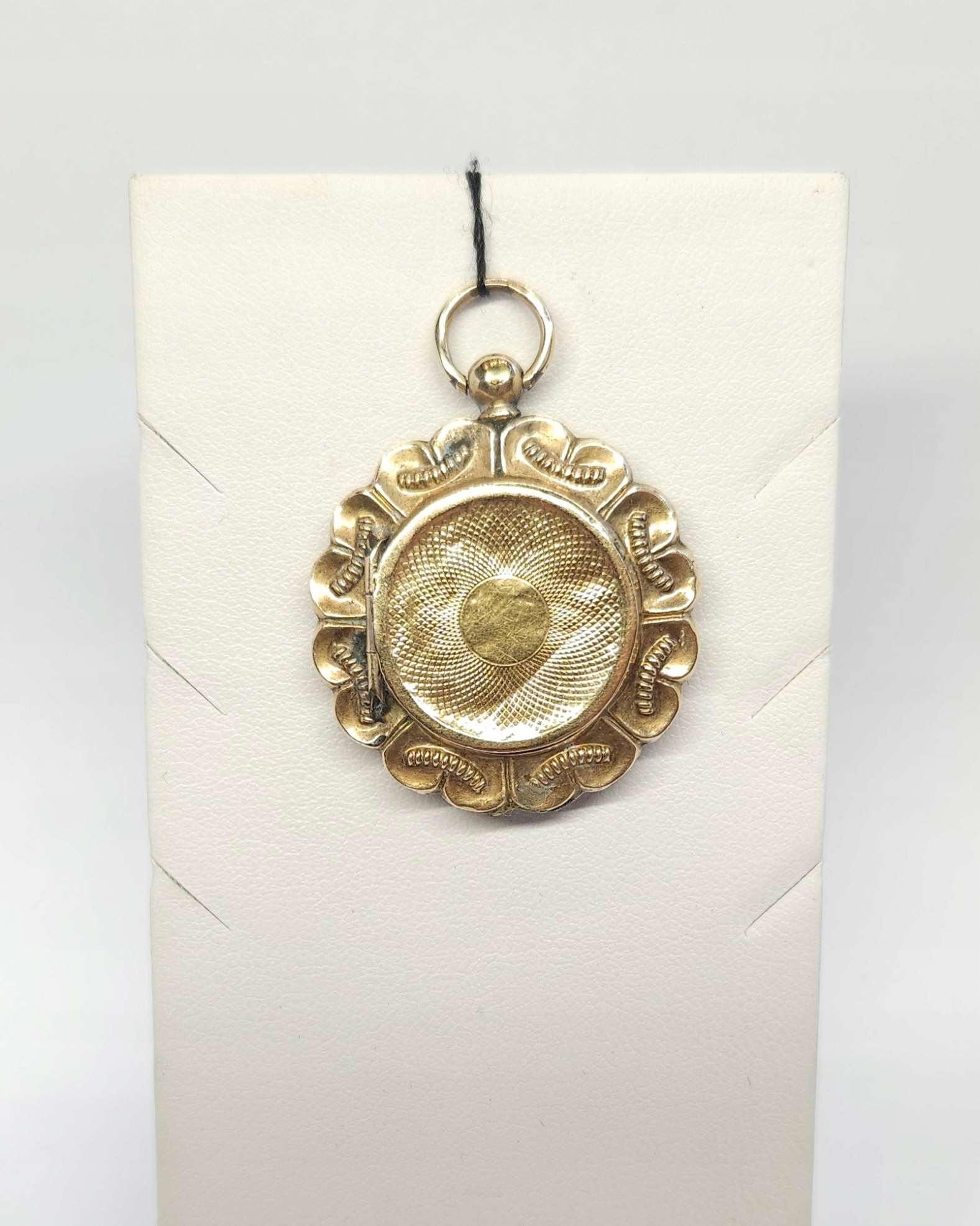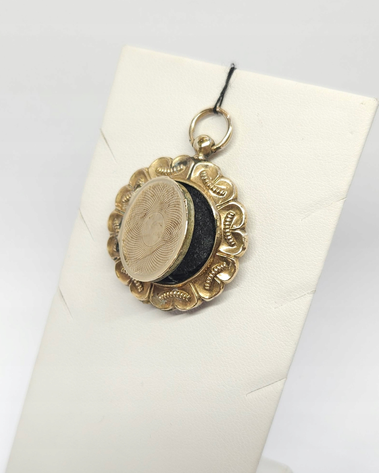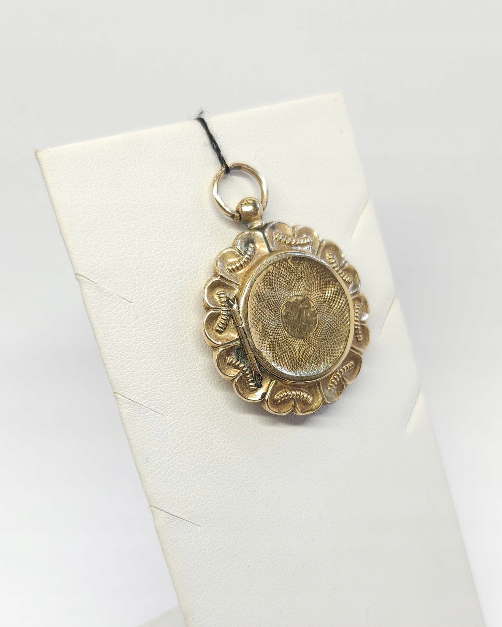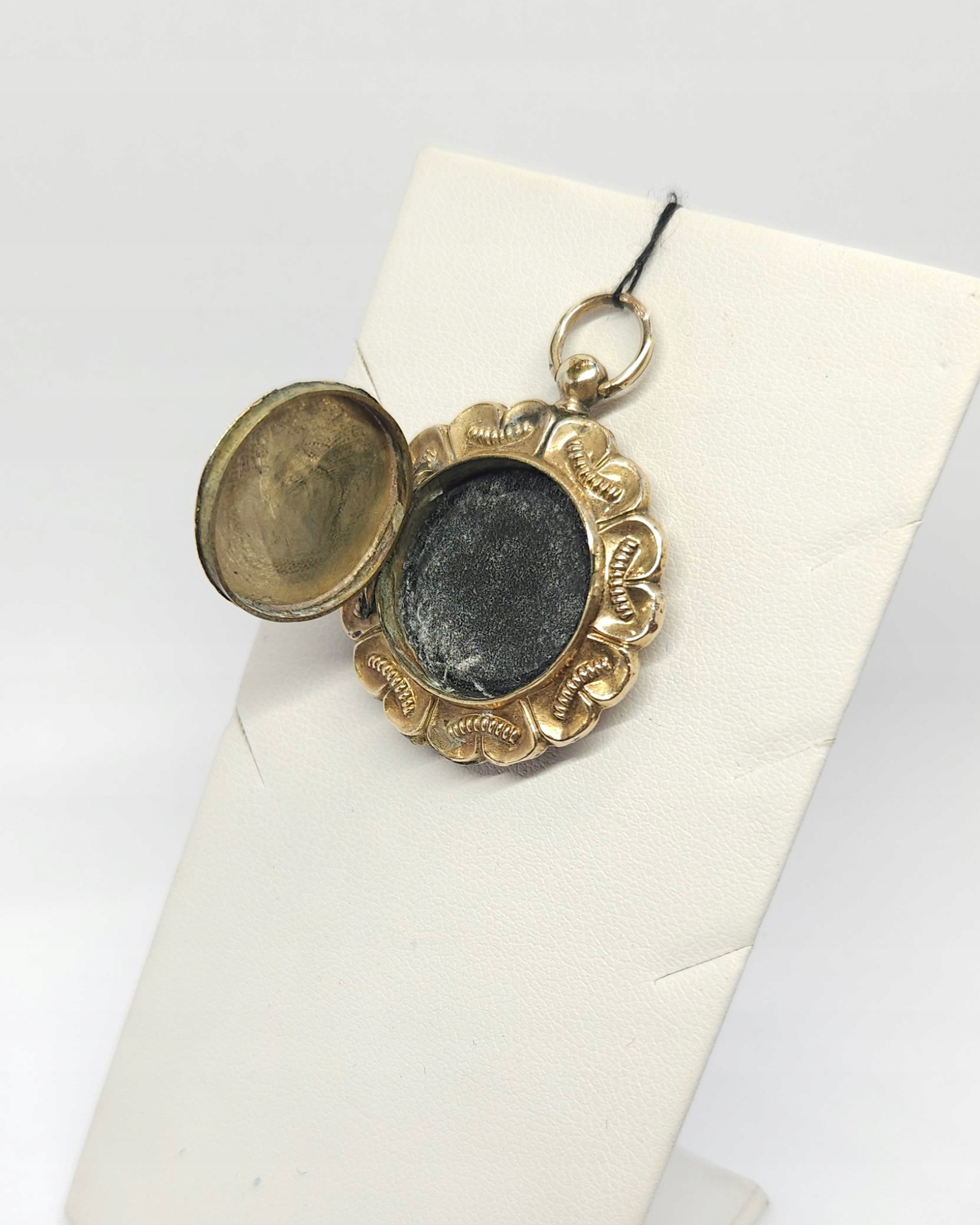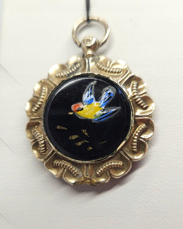 Okrągły wisiorek z kon. XIXw. – sekretnik z miejscem na zdjęcie, wykonany z mosiądzu złoconego, z czarnym onyksem, ręcznie malowanym emalią, z motywem ptaszka