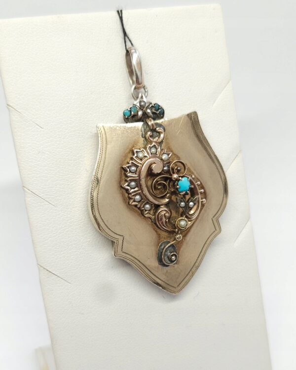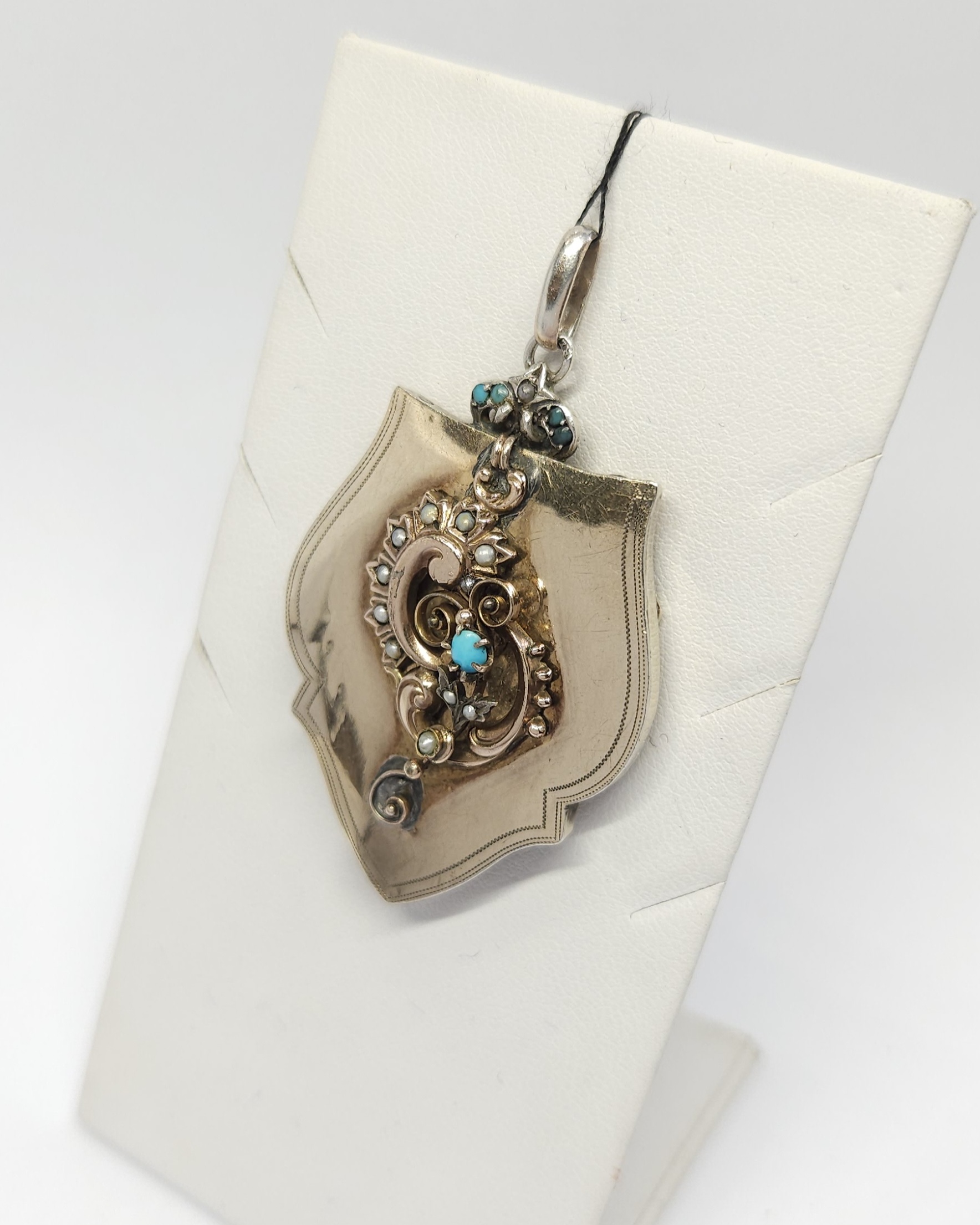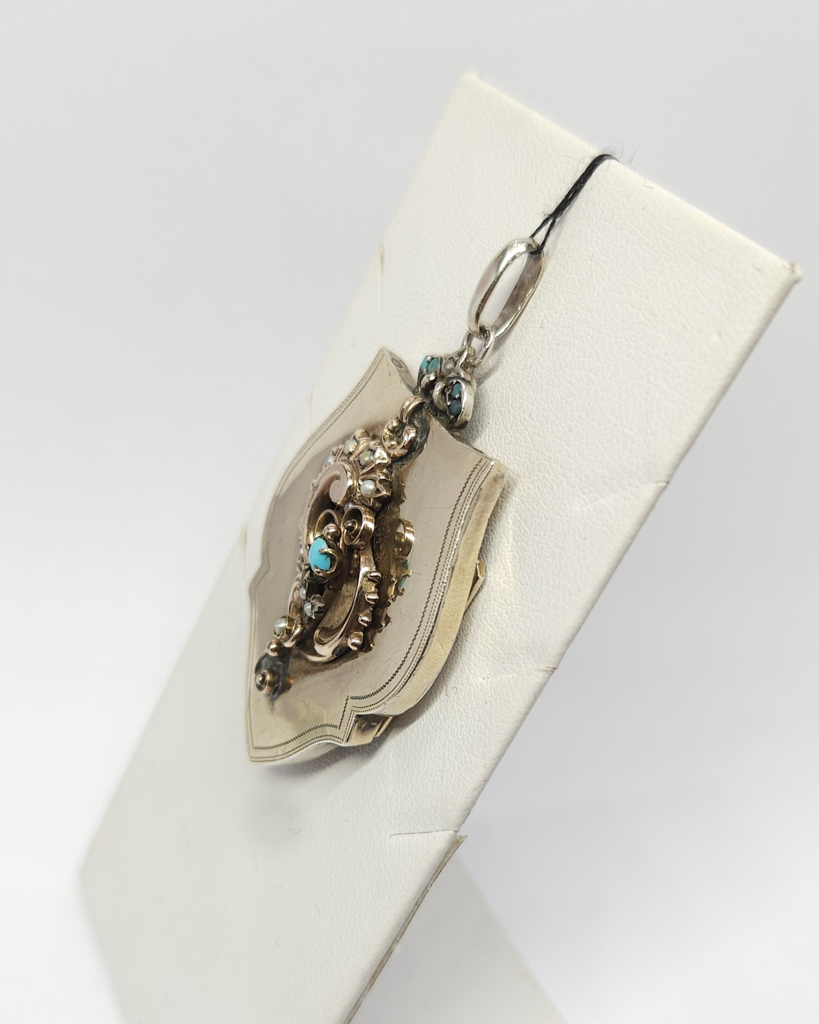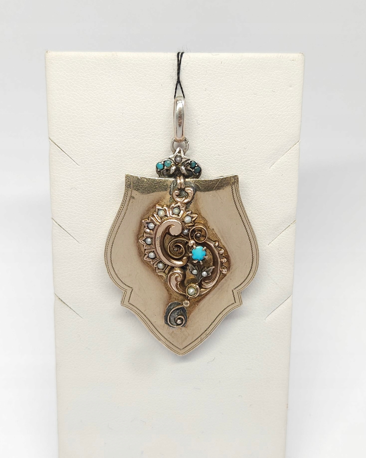 Strona główna » Sklep » Pozłacany sekretnik XIXw. wisiorek na zdjęcie mosiądz złocony turkusy perły