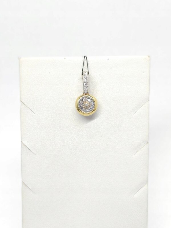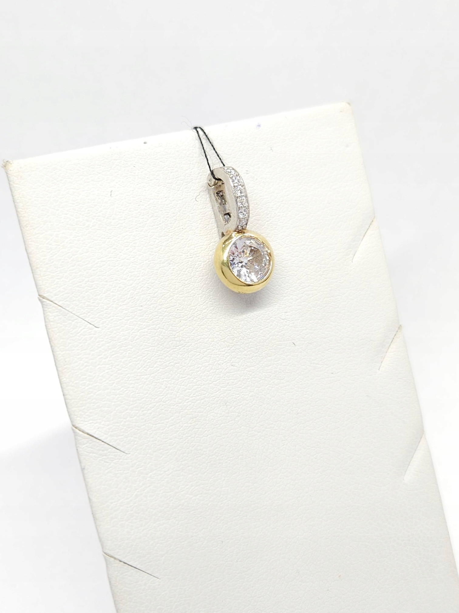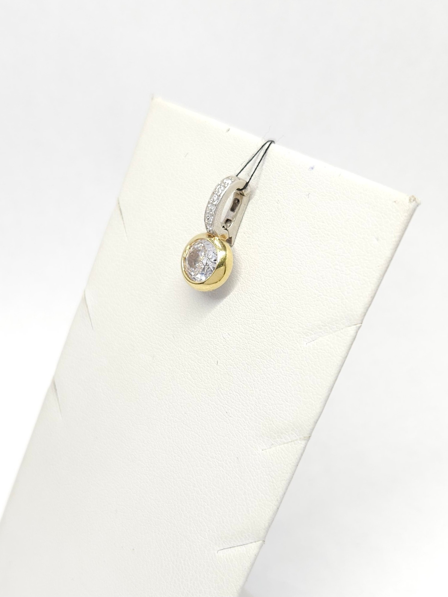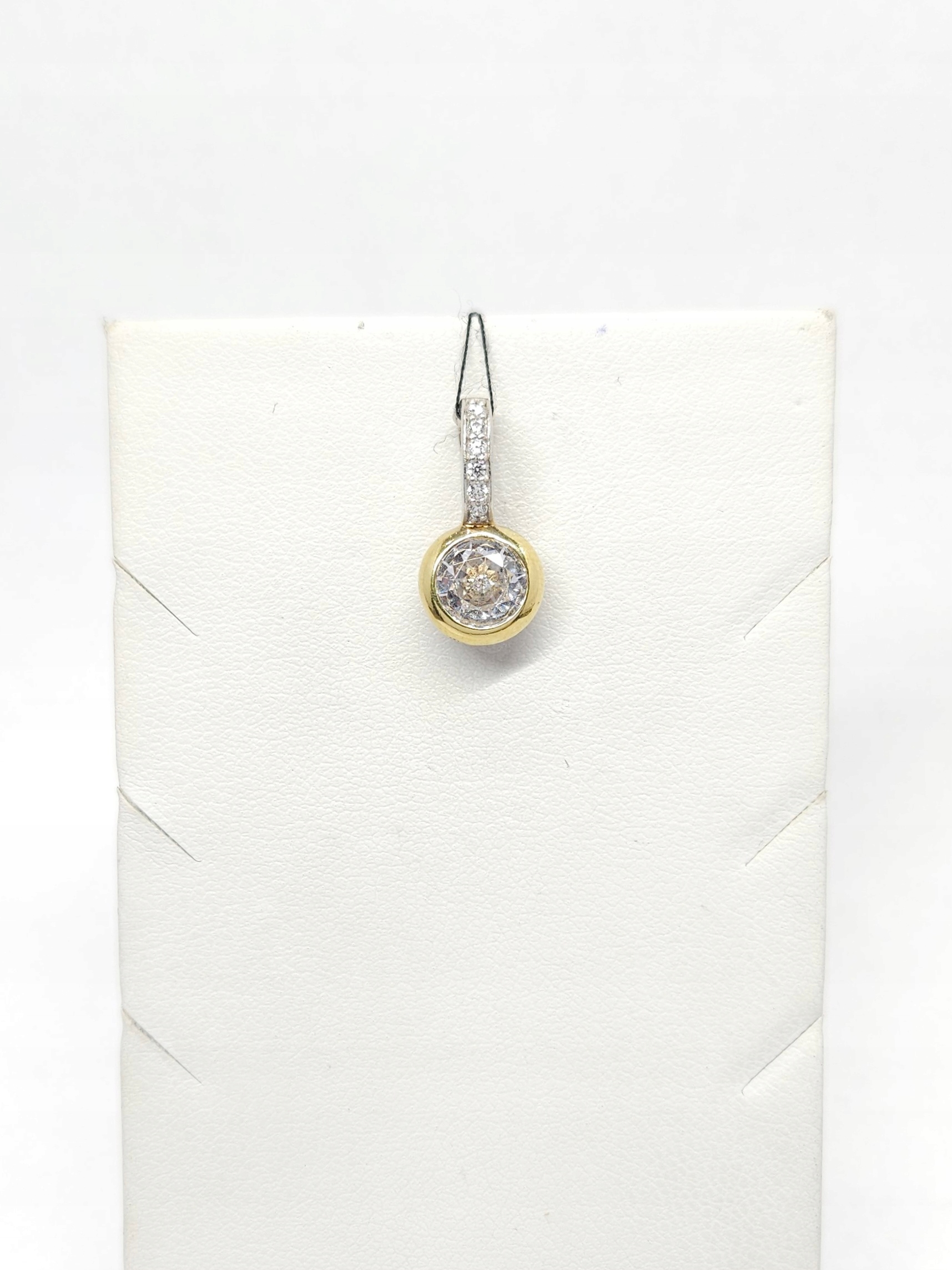 Wisiorek – przypinka, wykonany ze srebra złoconego, z pojedynczym, bezbarwnym kamieniem naturalnym i cyrkoniami; zawieszka zapinana na mocny zatrzask