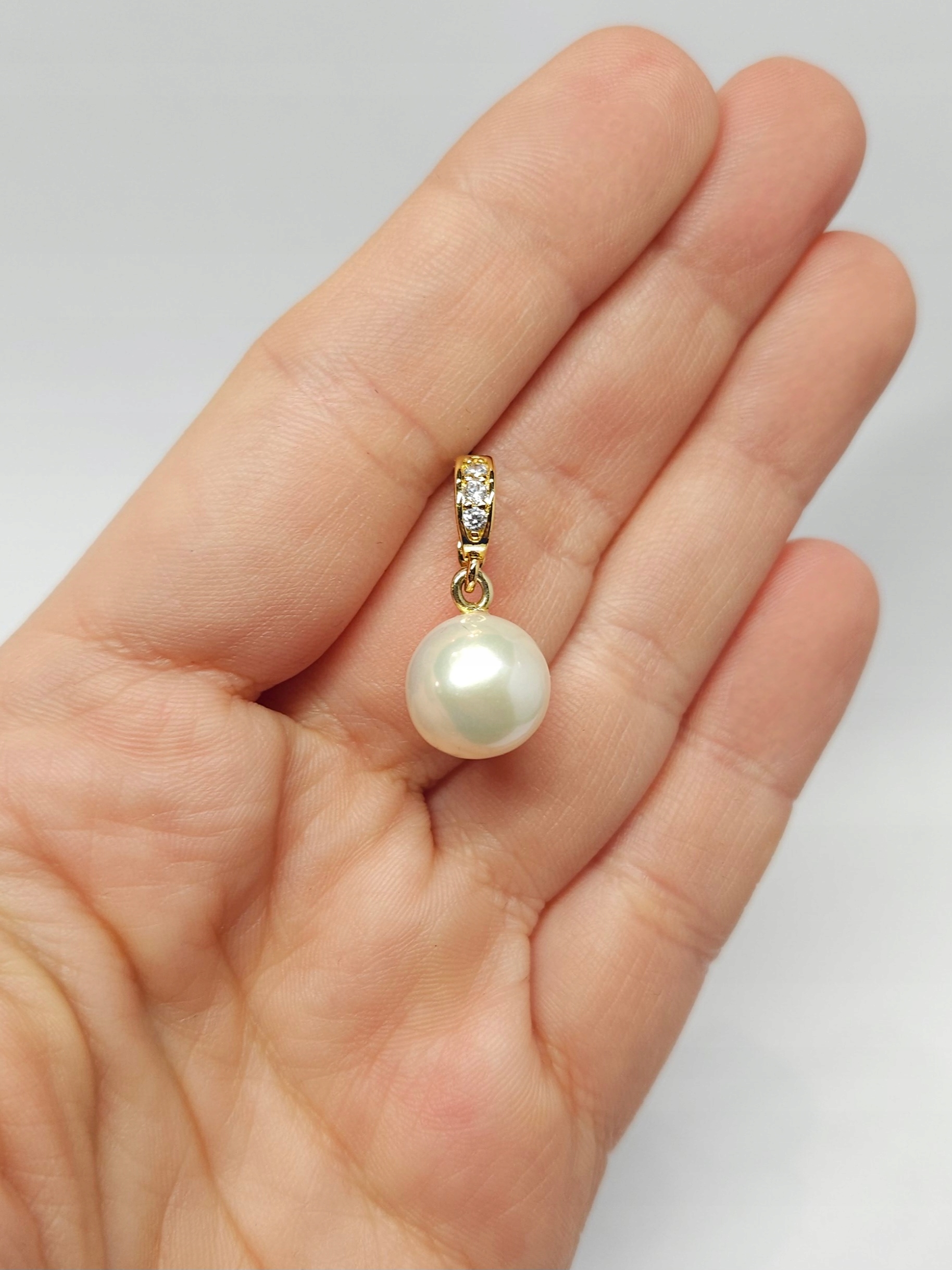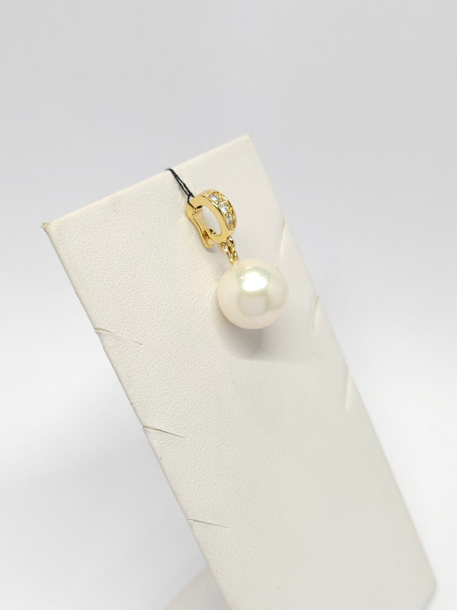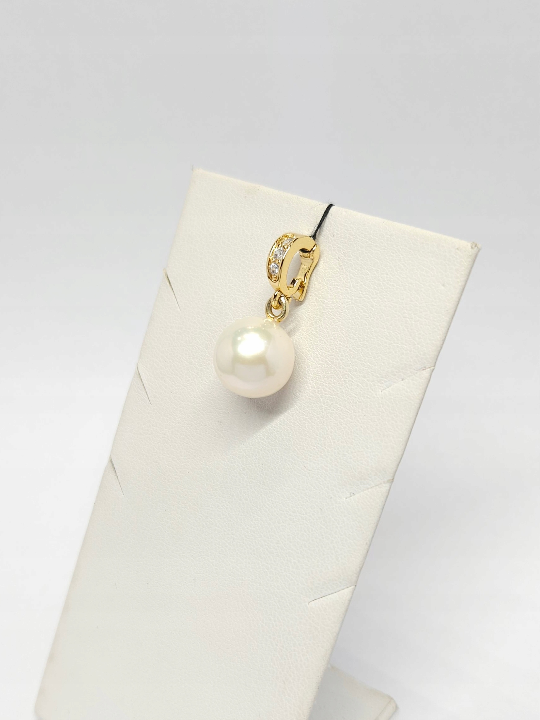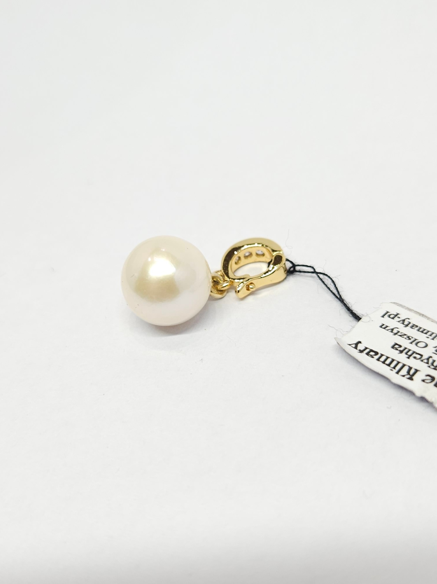 Wisiorek – przypinka, wykonany ze srebra złoconego, z kremowo-białą perłą hodowaną słodkowodną, z zawieszką zdobioną cyrkoniami; zawieszka zapinana na mocny zatrzask