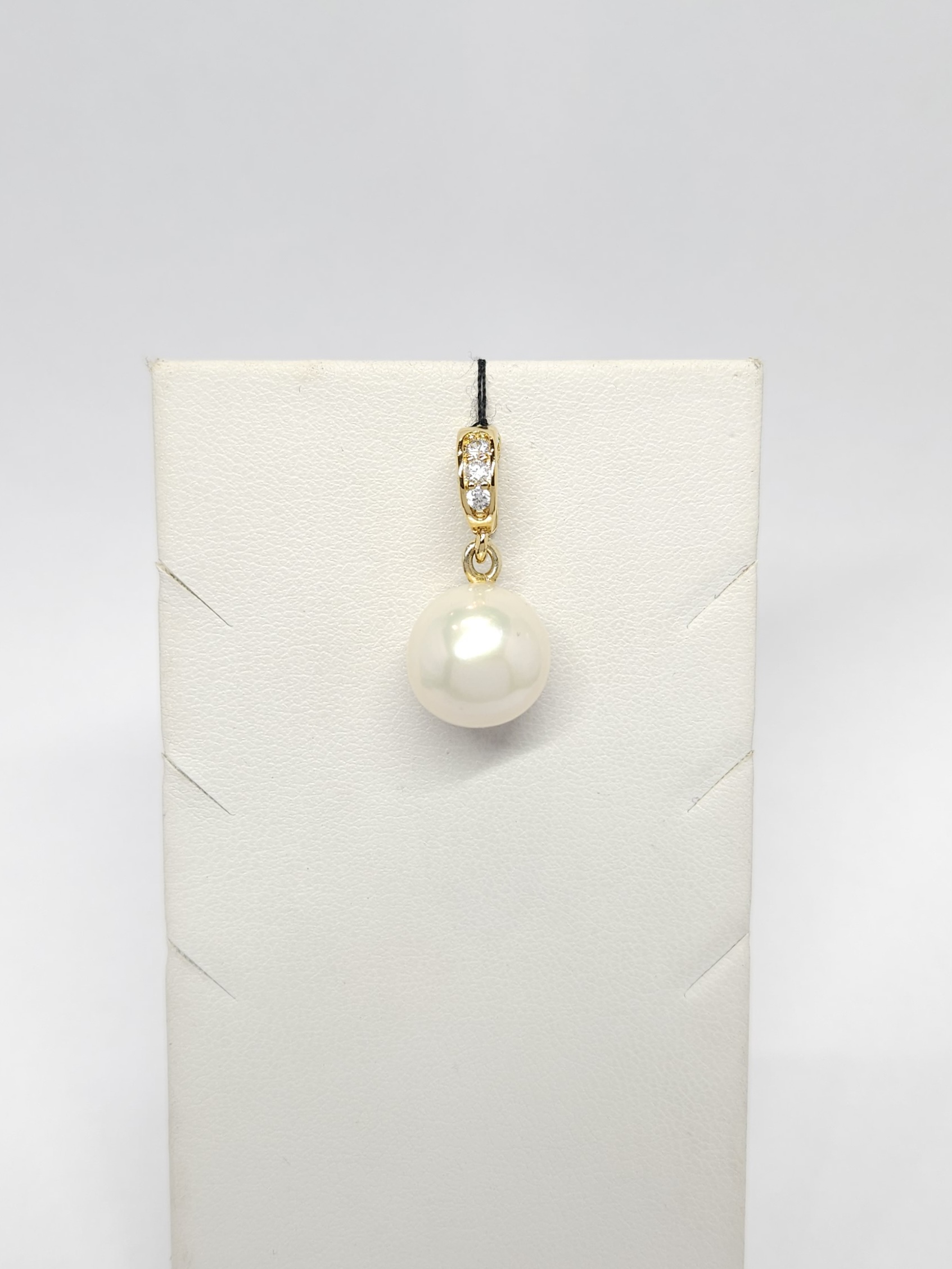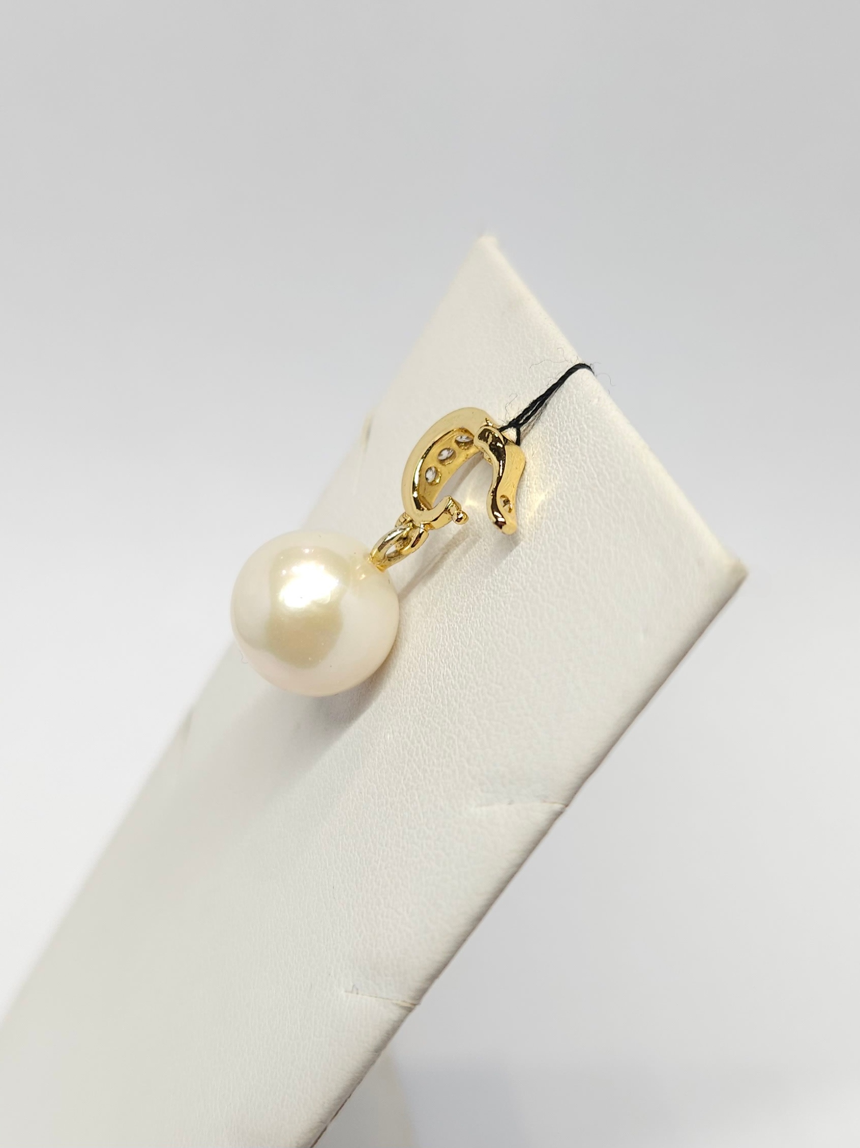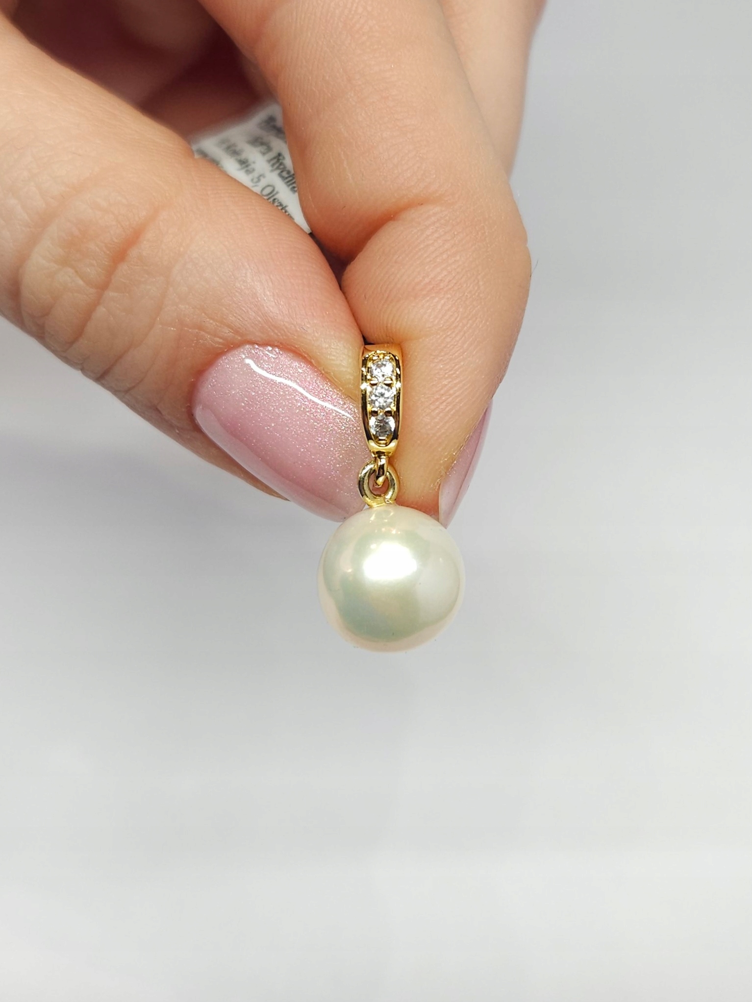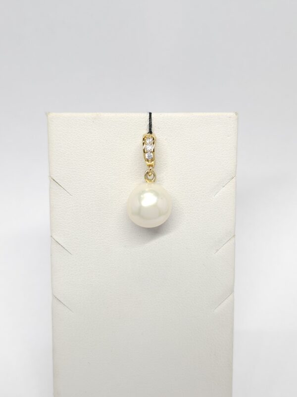 Wisiorek – przypinka, wykonany ze srebra złoconego, z kremowo-białą perłą hodowaną słodkowodną, z zawieszką zdobioną cyrkoniami; zawieszka zapinana na mocny zatrzask