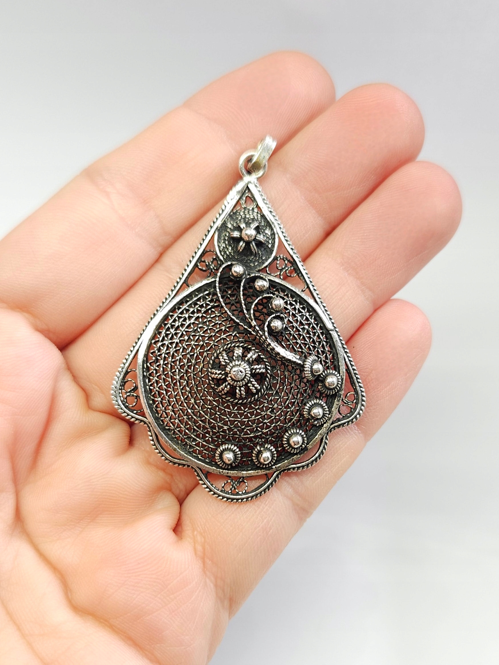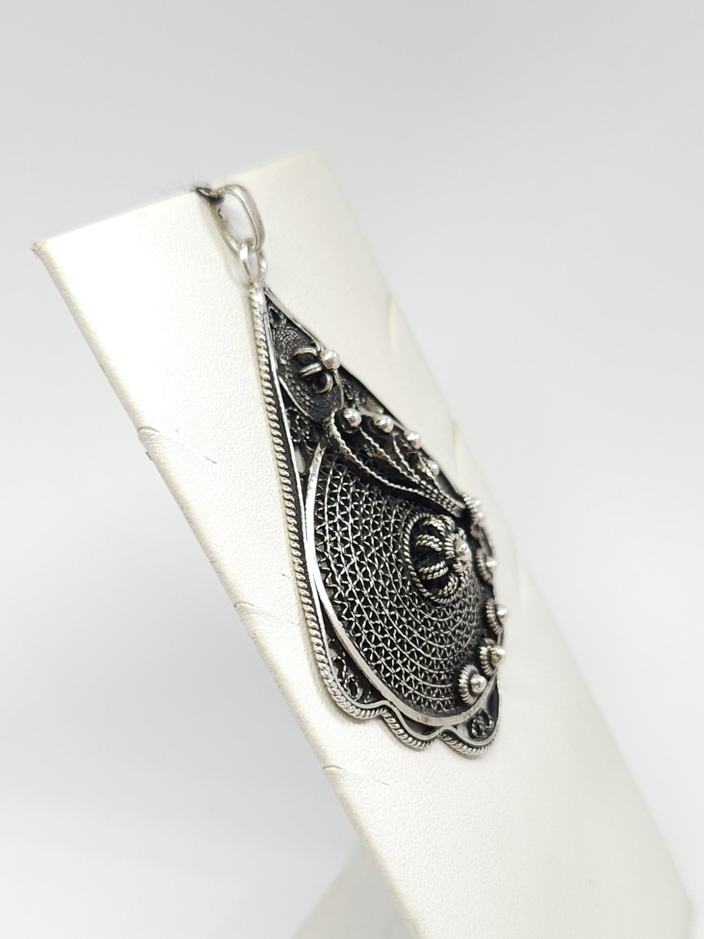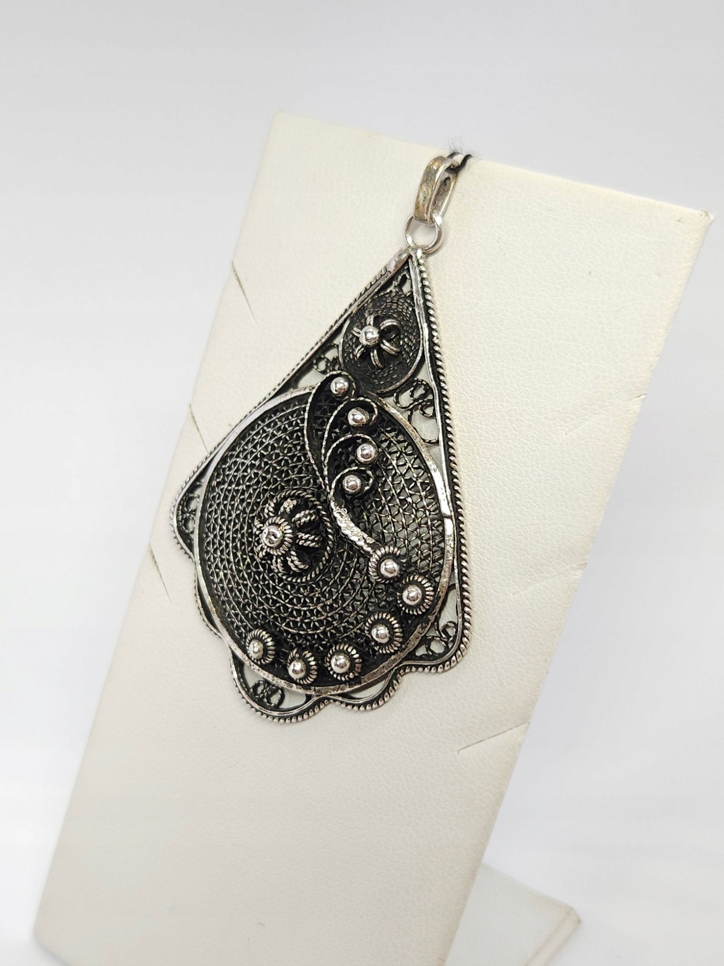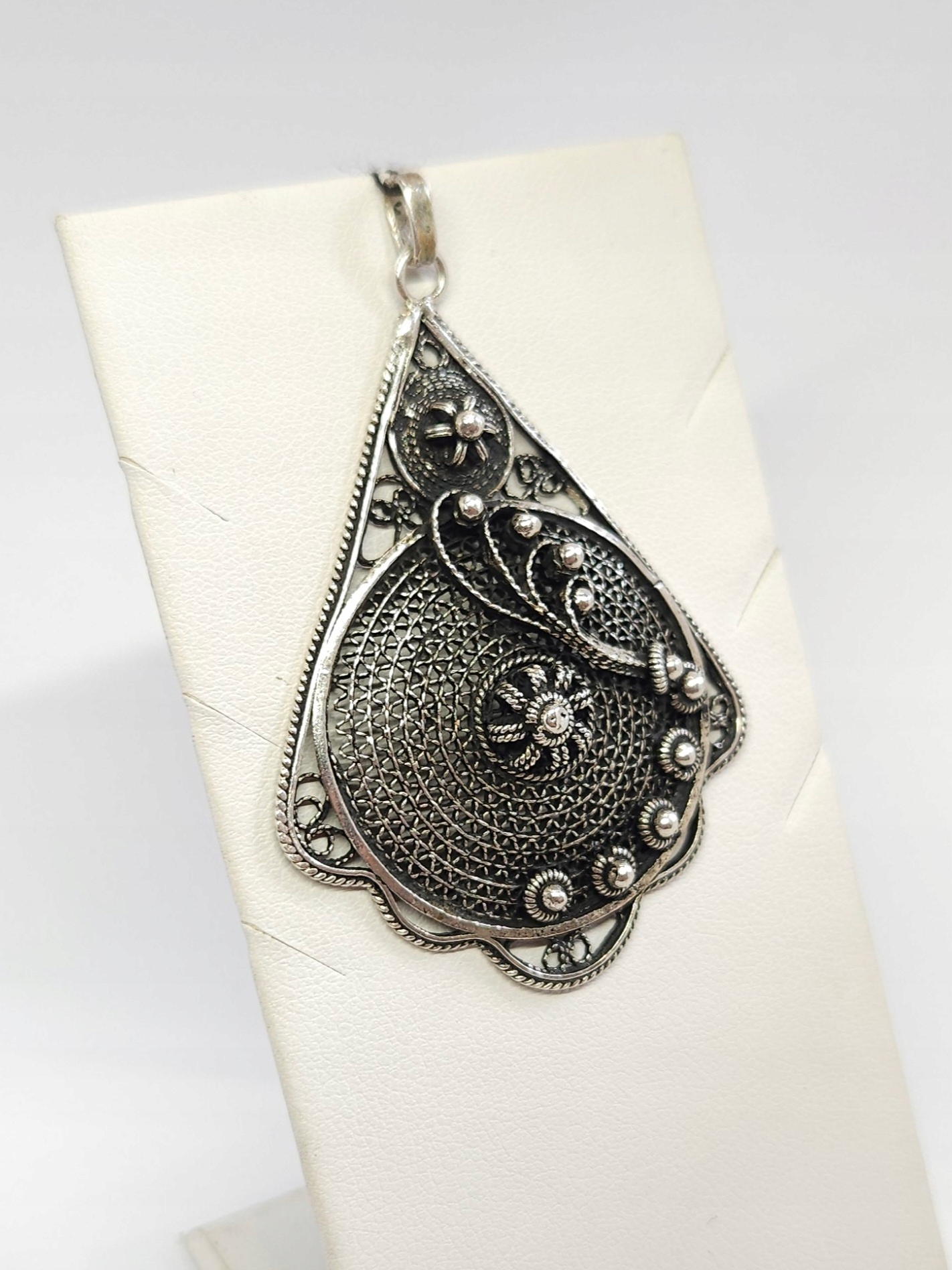 Srebrny wisiorek,wykonany w technice filigranu, w kształcie zbliżonym do kropli, z ozbodbymi kulkami