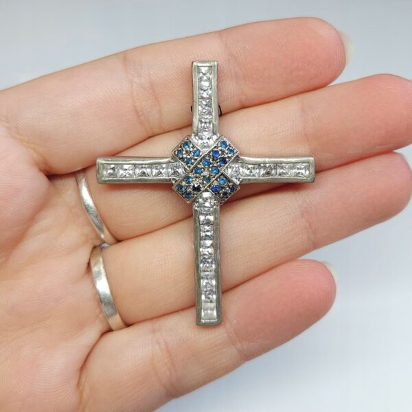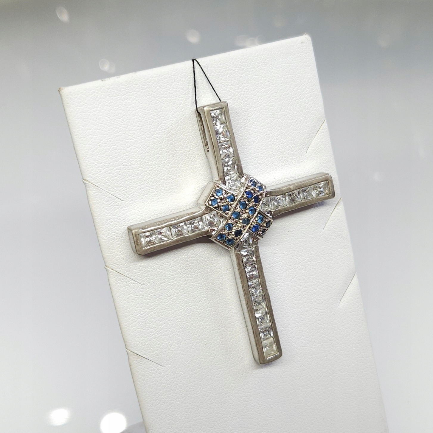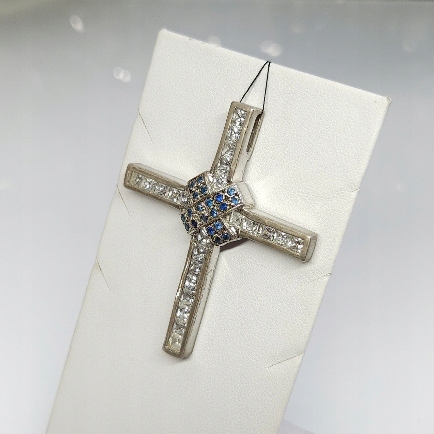 Srebrny wisiorek – duży krzyż…krzyżyk, wysadzany cyrkoniami i cyrkoniami barwionymi w kolorze szafirów