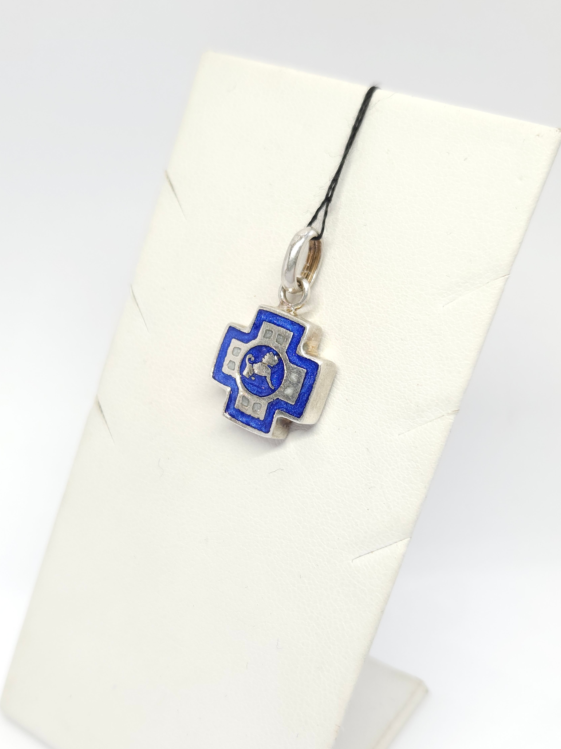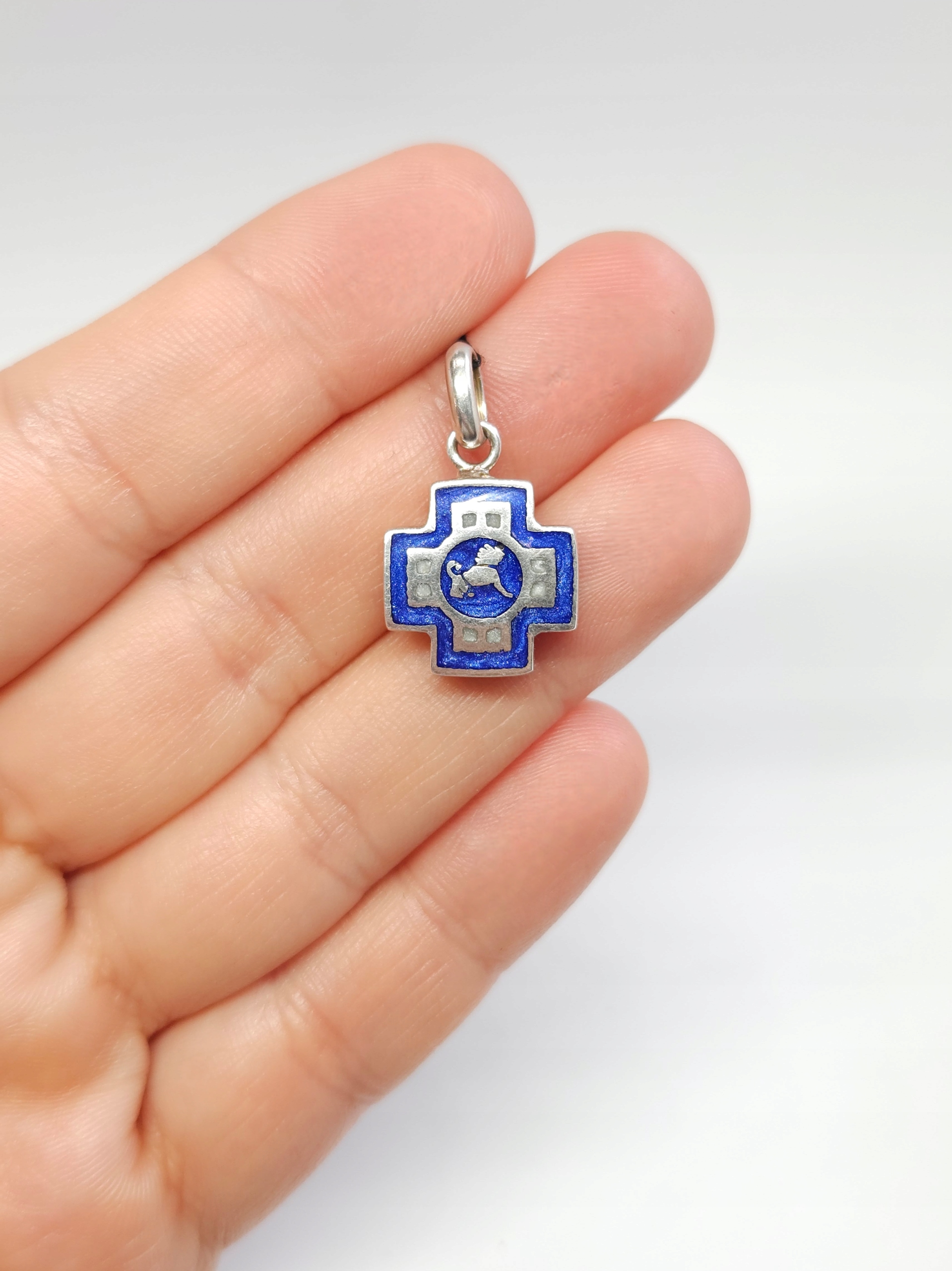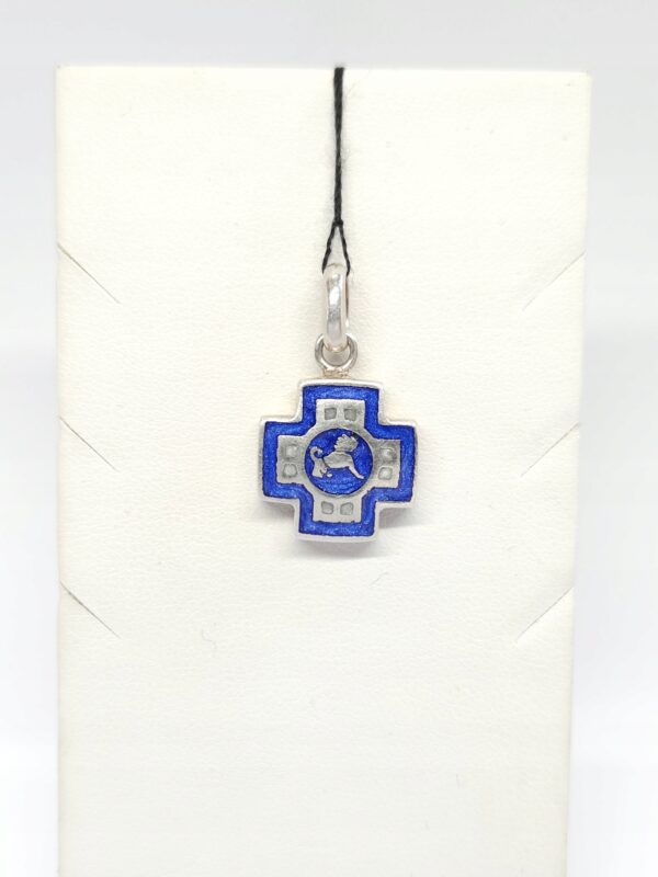 Srebrny wisiorek – krzyż równoramienny z motywem lwa w centralnej części, zdobiony kobaltową emalią