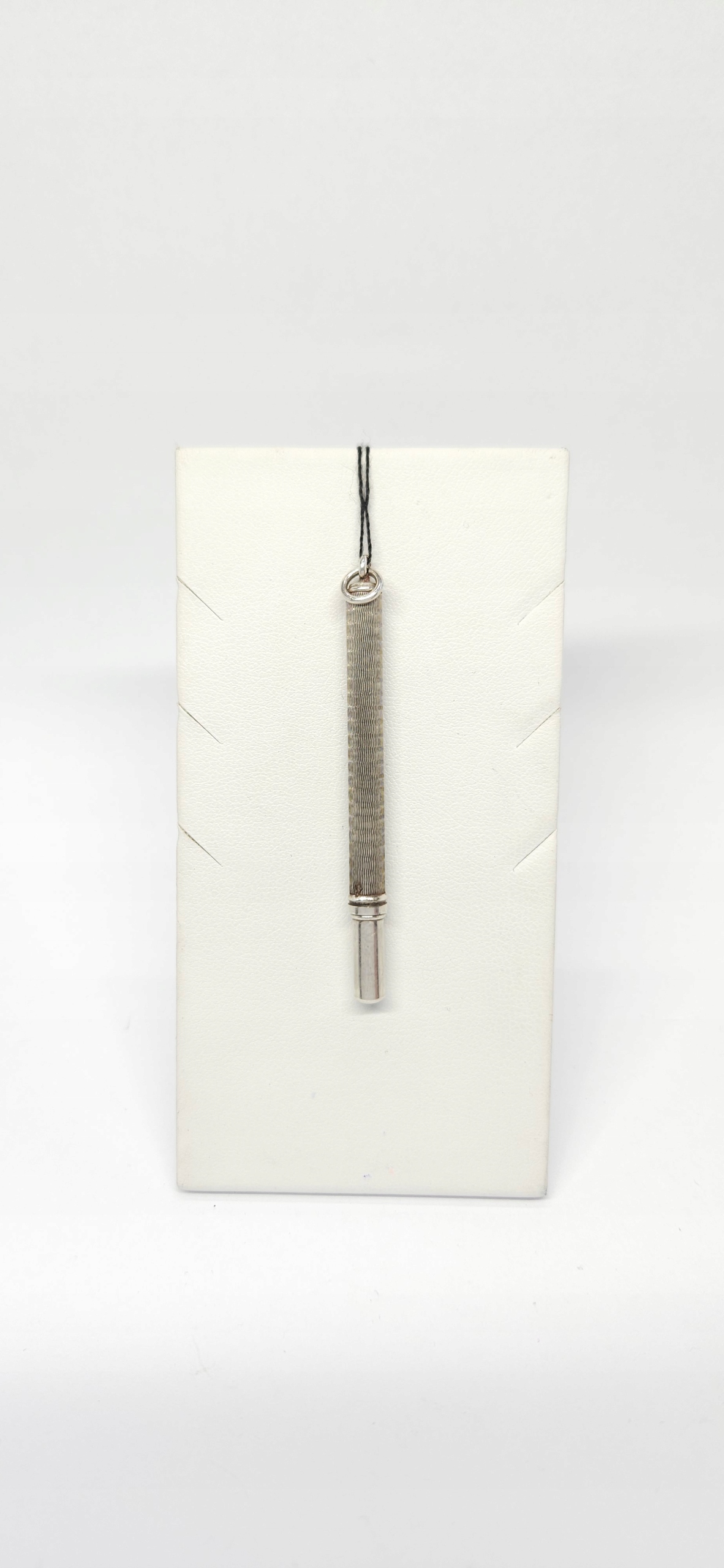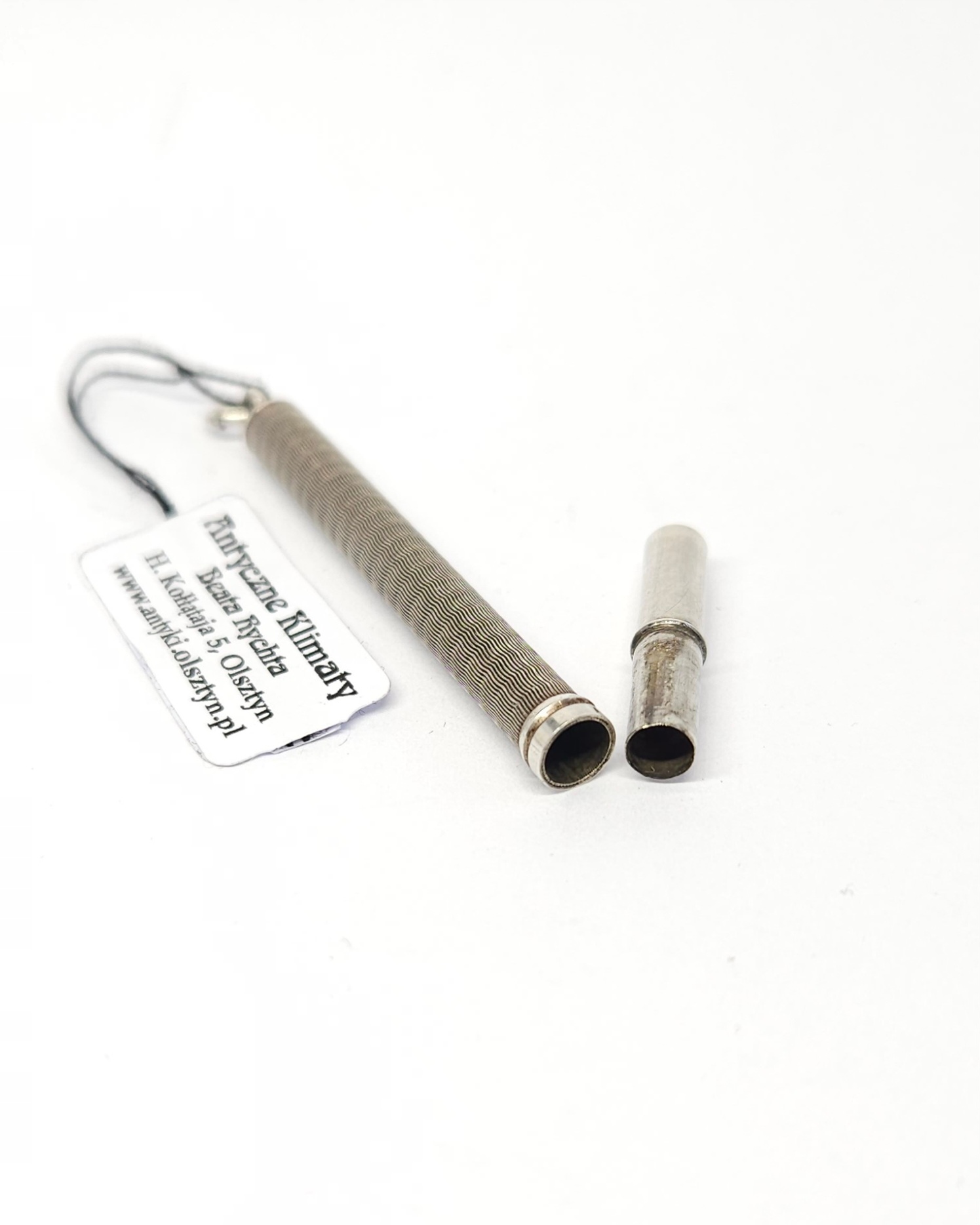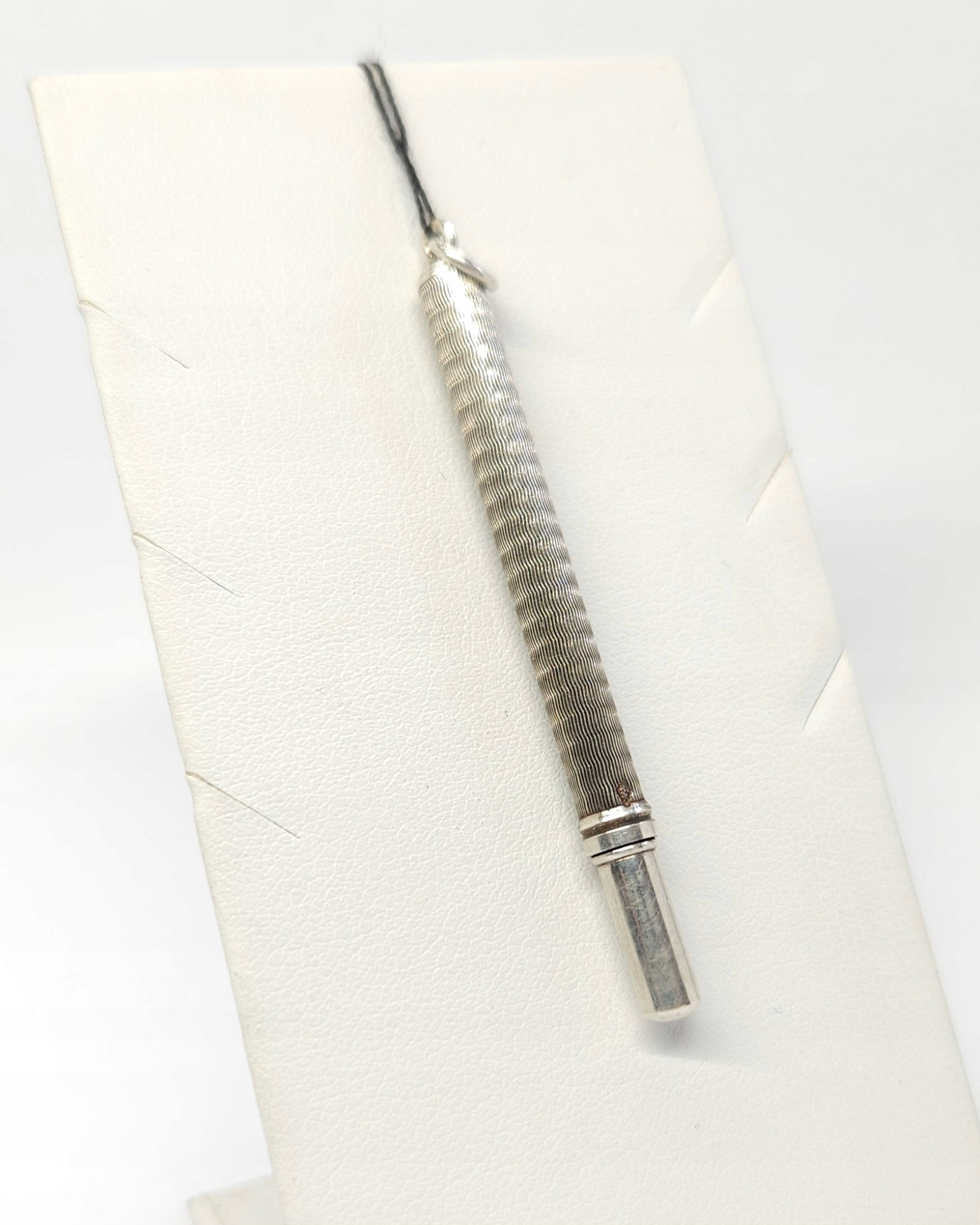Srebrny, podłużny wisiorek – pojemniczek – osłonka do ołówka? igielnik? zdobiony techniką giloszu
