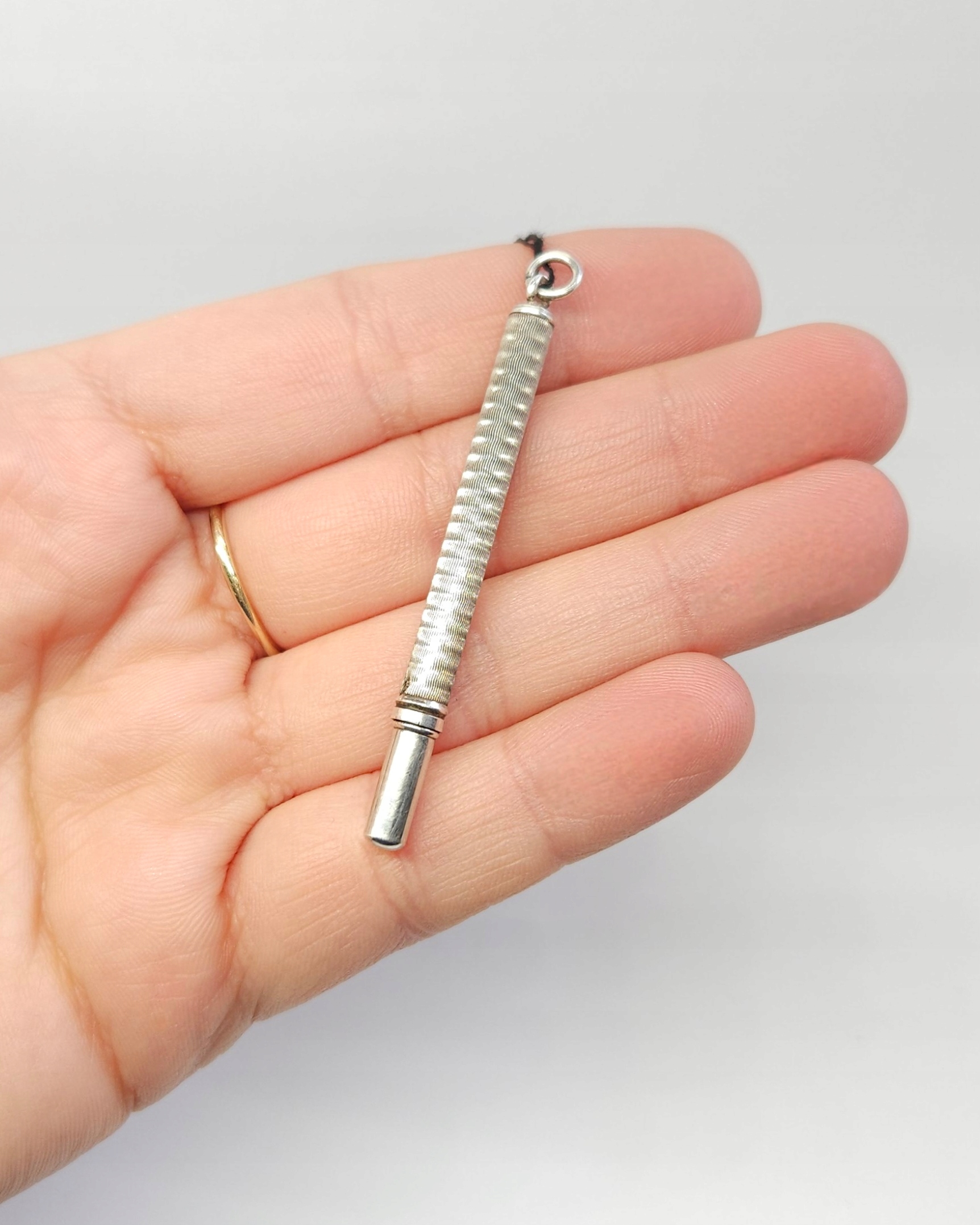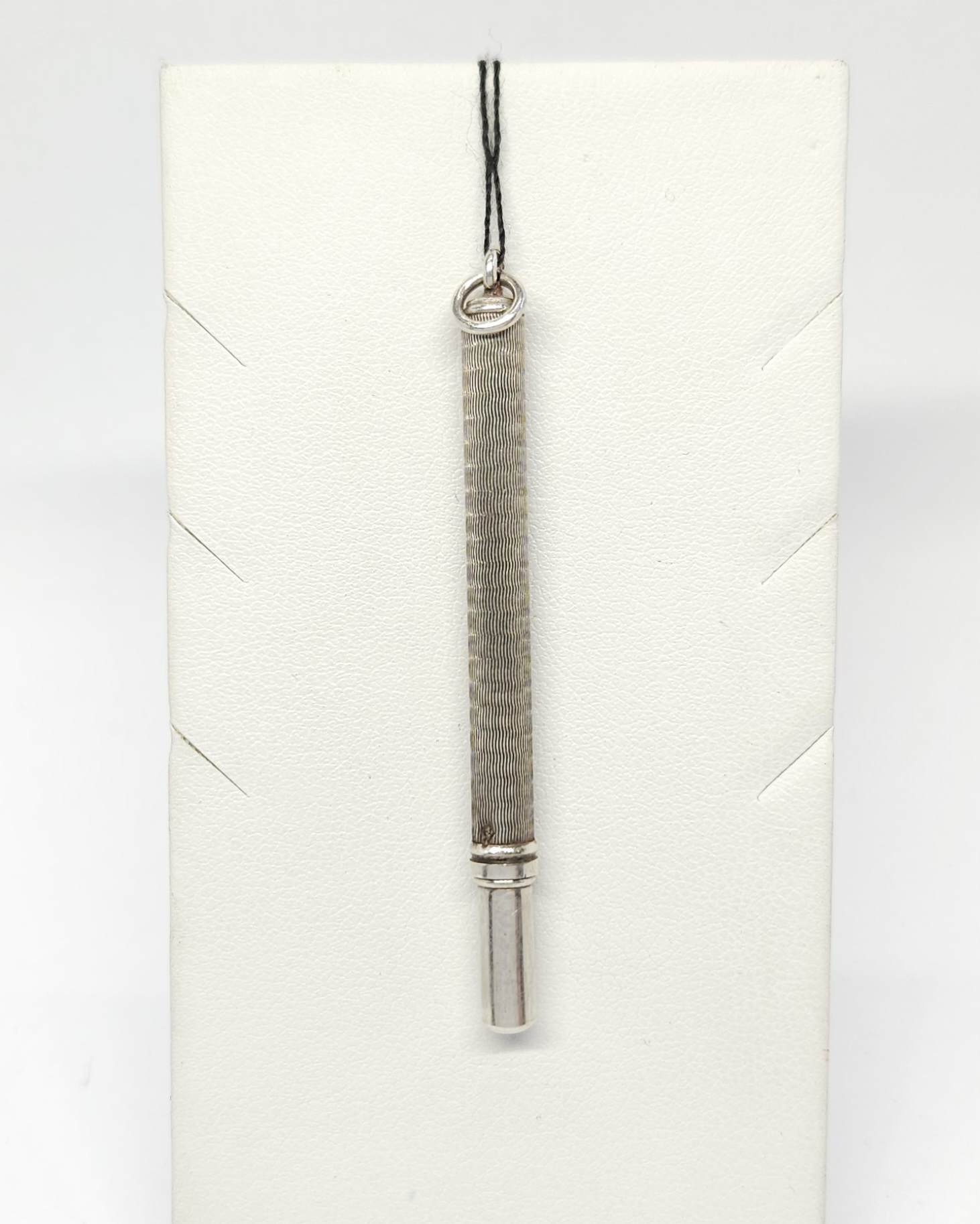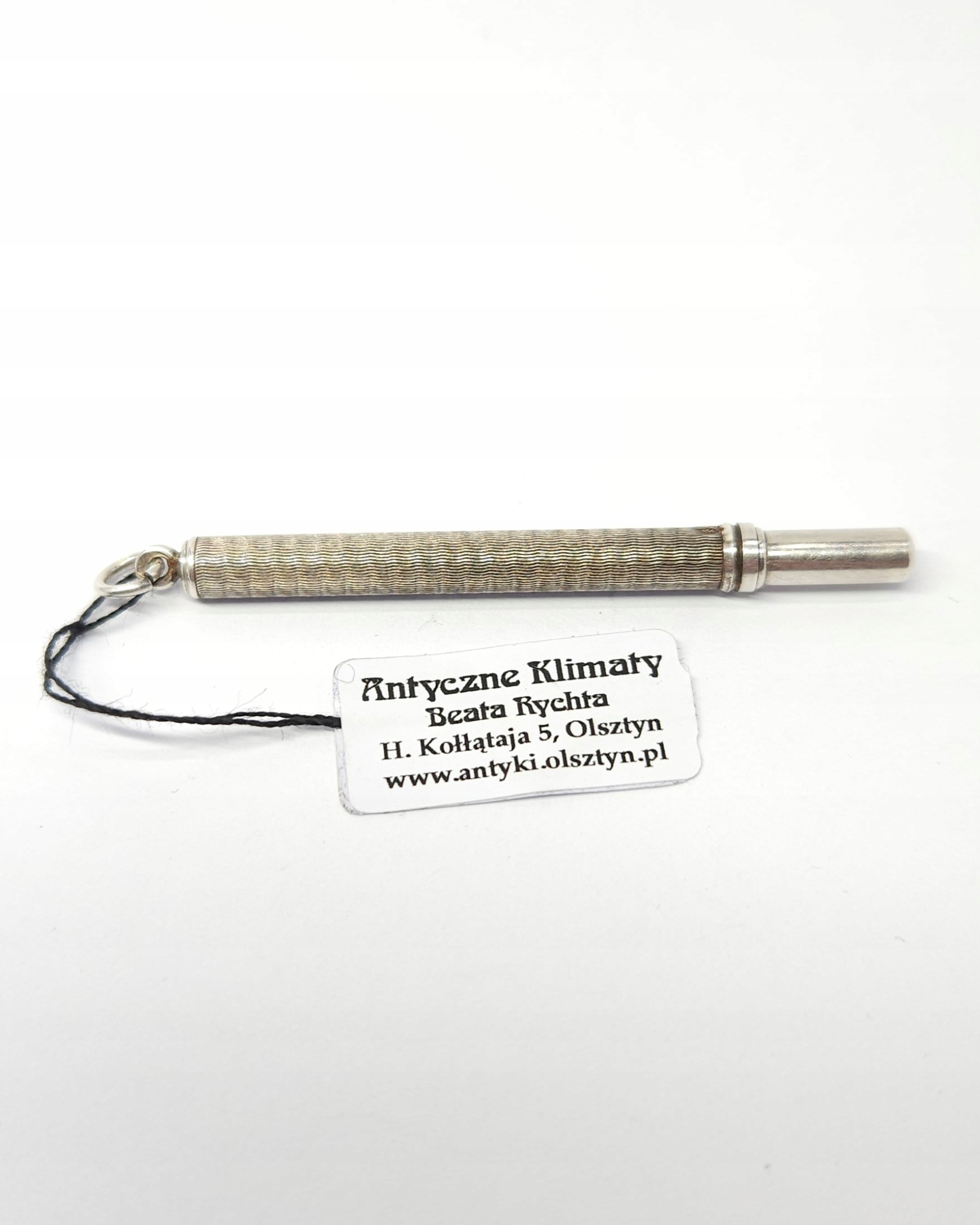 Srebrny, podłużny wisiorek – pojemniczek – osłonka do ołówka? igielnik? zdobiony techniką giloszu
