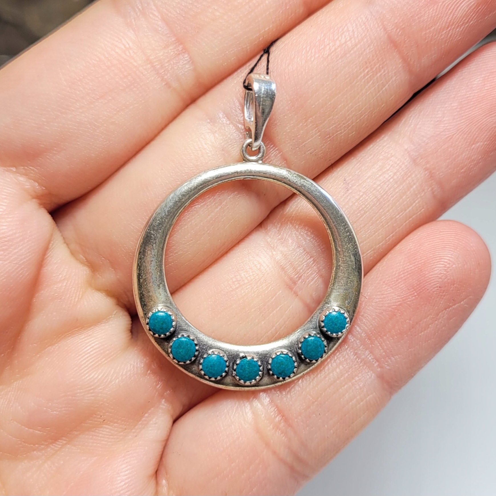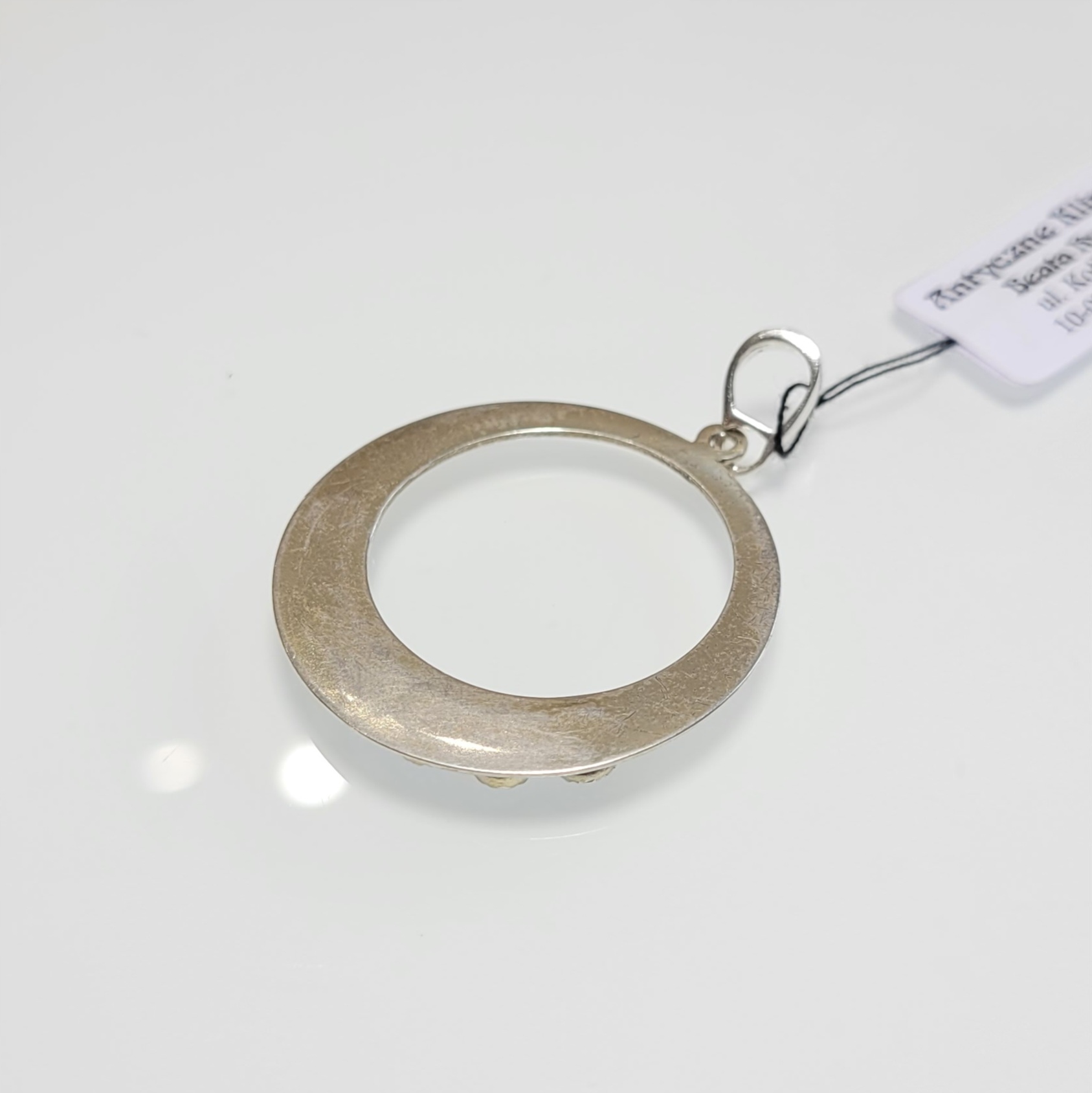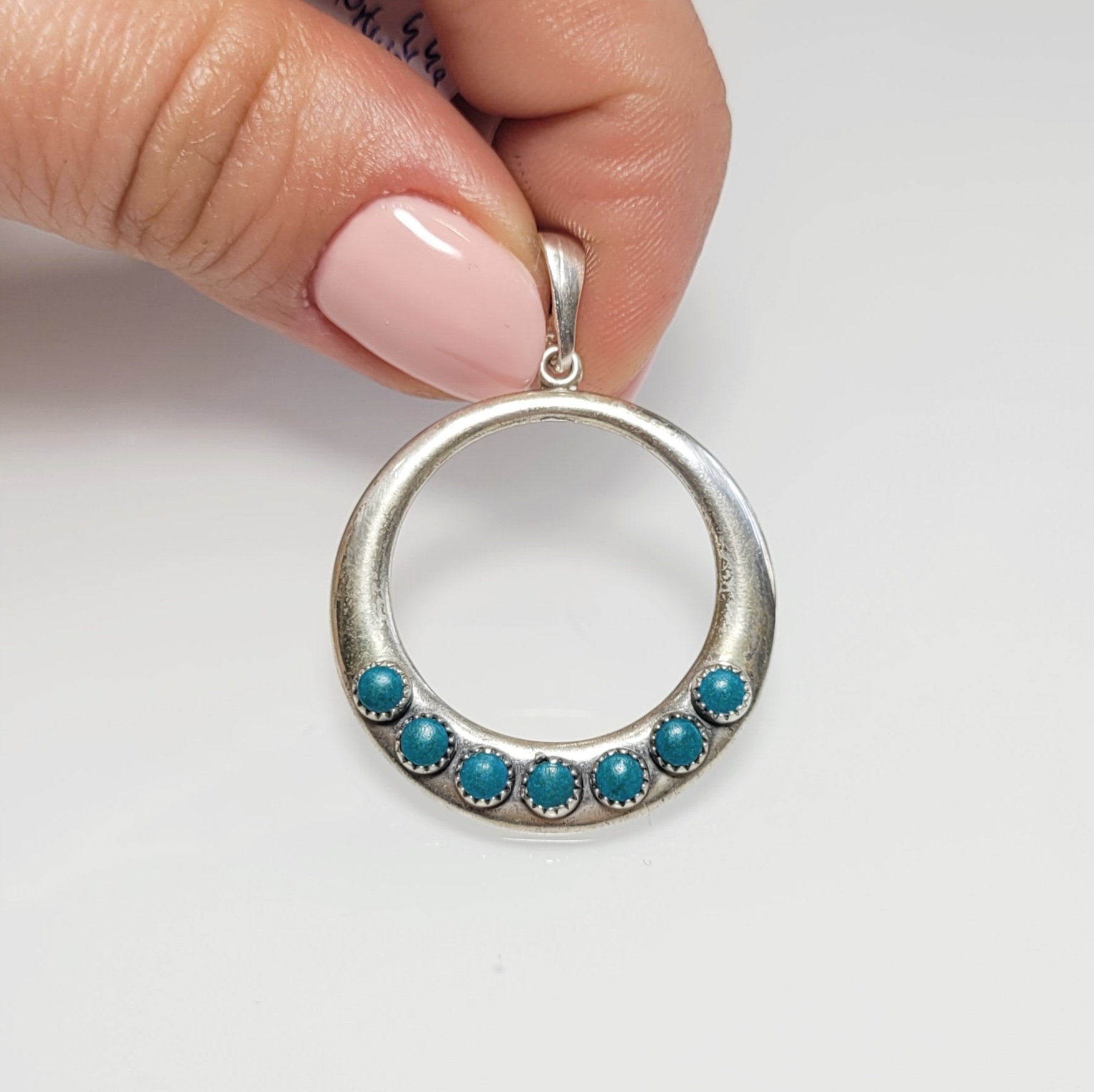 Srebrny, okrągły wisiorek, zdobiony turkusowymi kamieniami z masy jubilerskiej