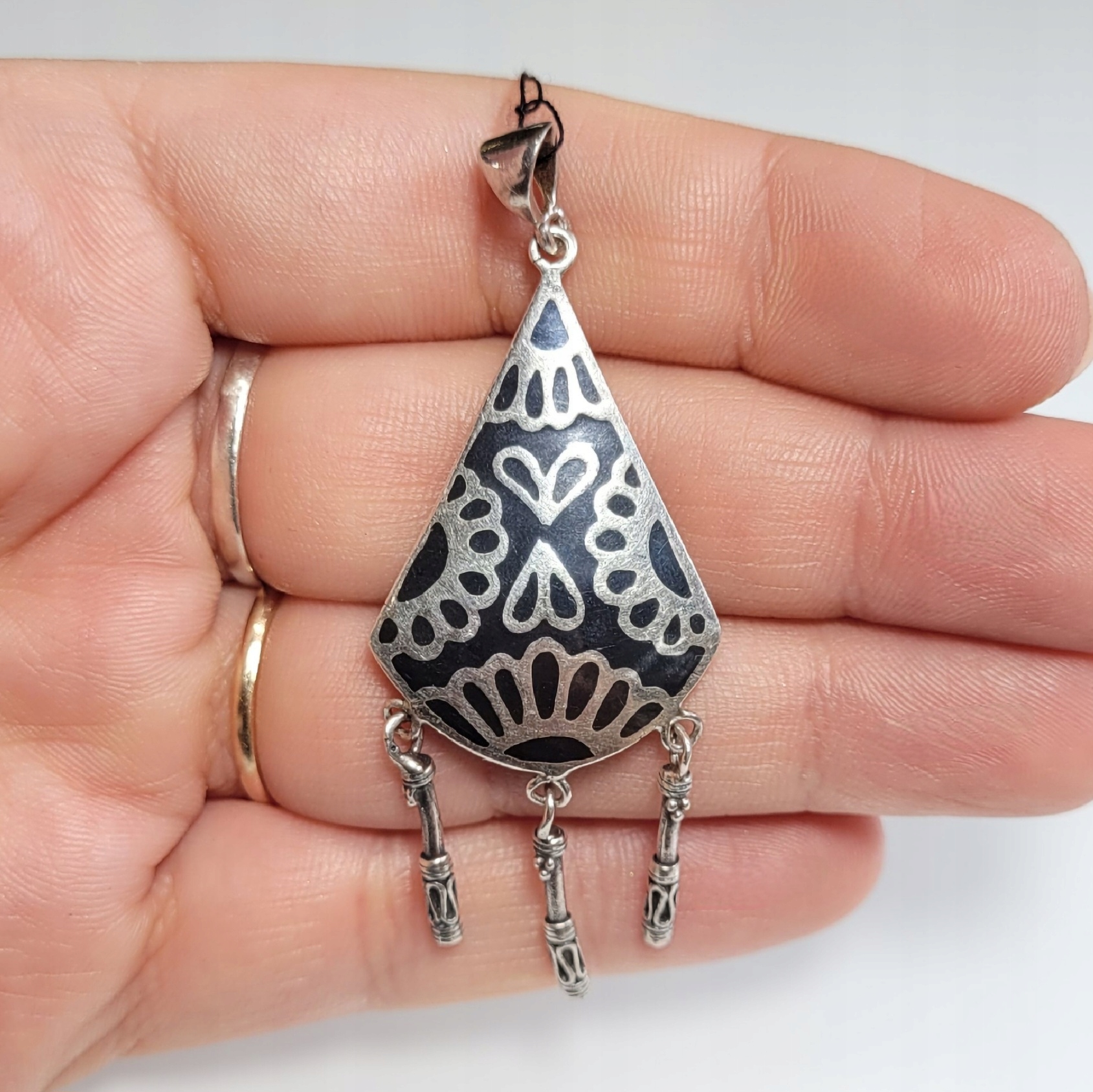 Srebrny wisiorek w stylu boho, zdobiony techniką niello
