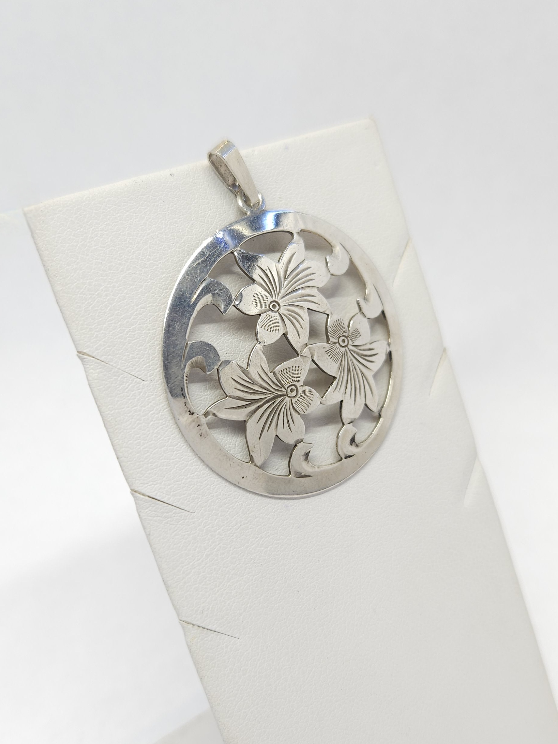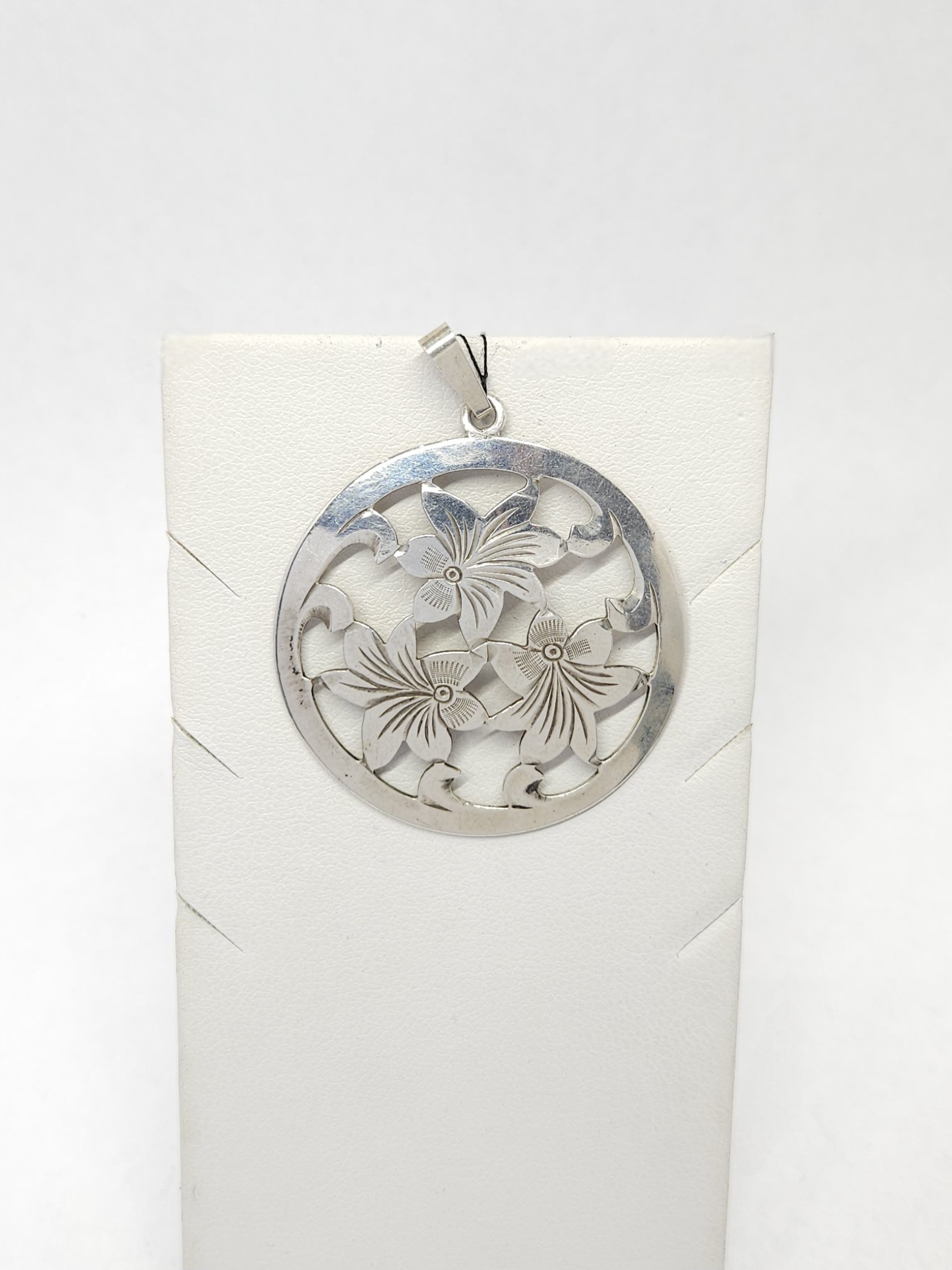 Srebrny, okrągły, ażurowy wisiorek, zdobiony motywem trzech kwiatów o grawerowanej powierzchni