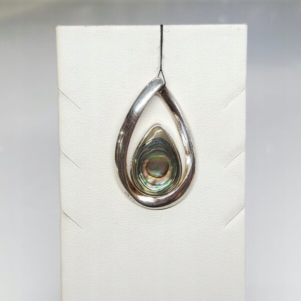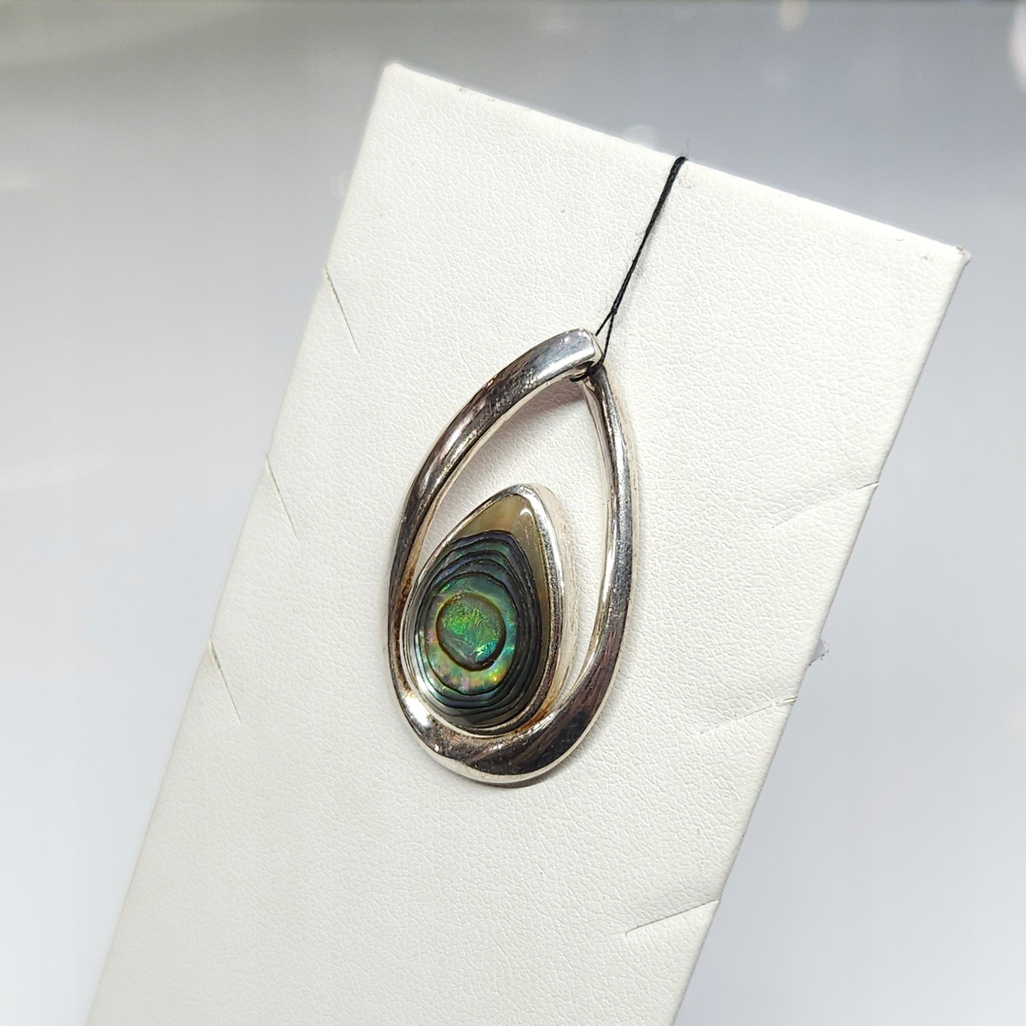 Srebrny wisiorek w kształcie kropli, zdobiony masą perłową