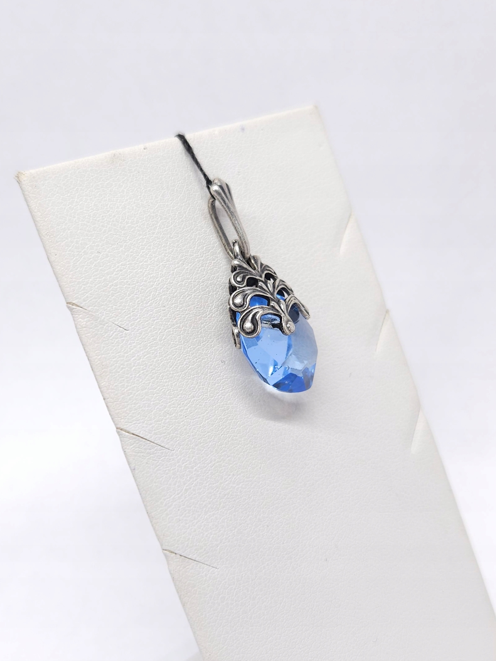 Srebrny wisiorek z niebieskim szkłem barwionym, w ażurowej oprawie