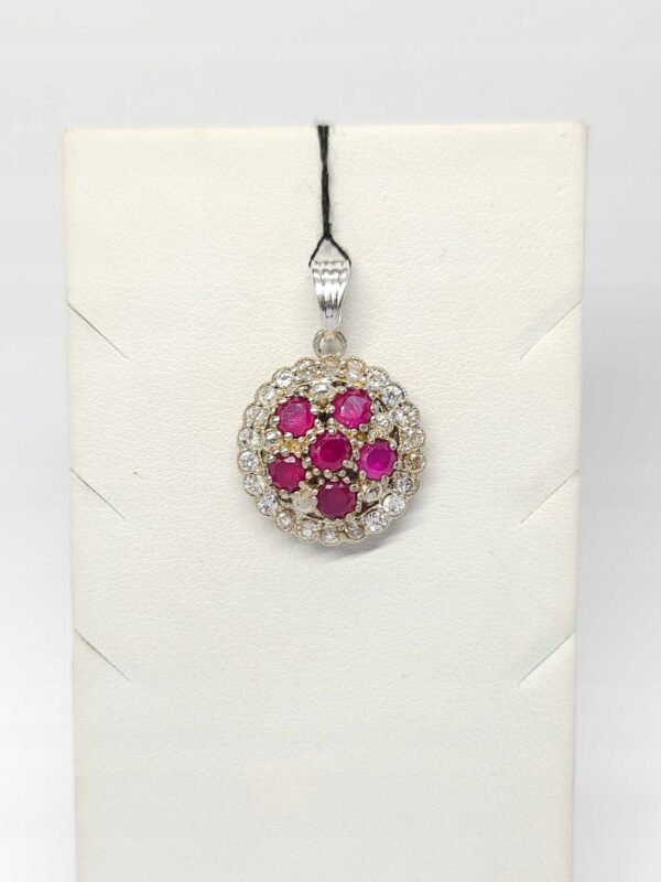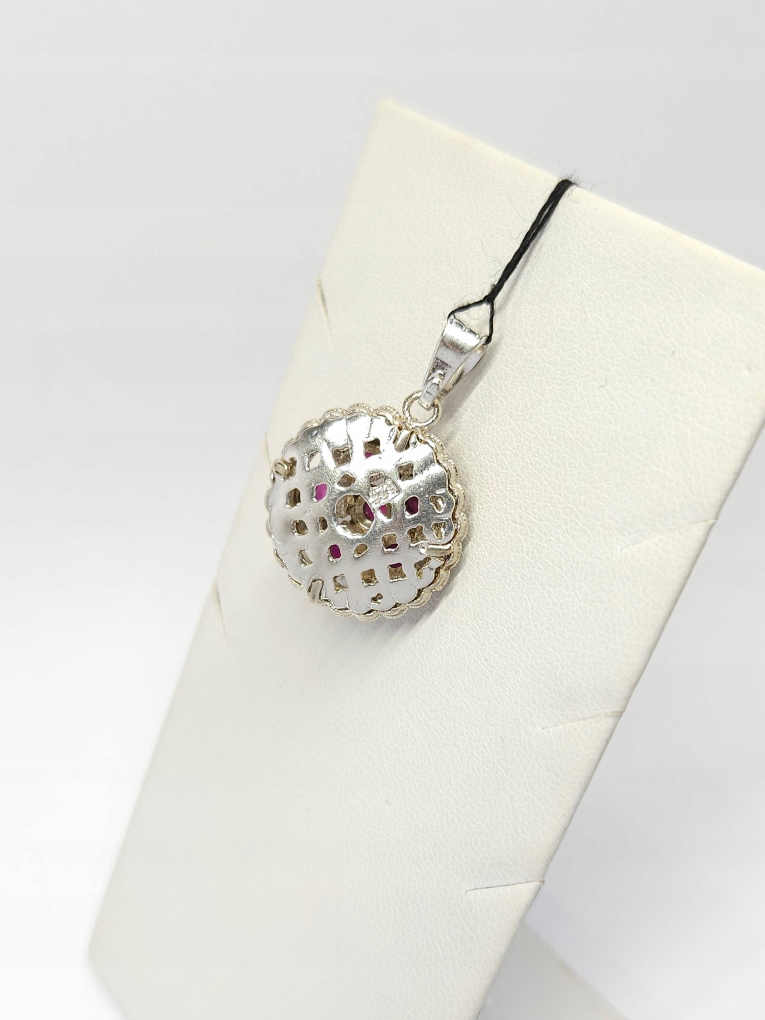 Srebrny wisiorek w formie rozety, wysadzany cyrkoniami i rubinami syntetycznymi