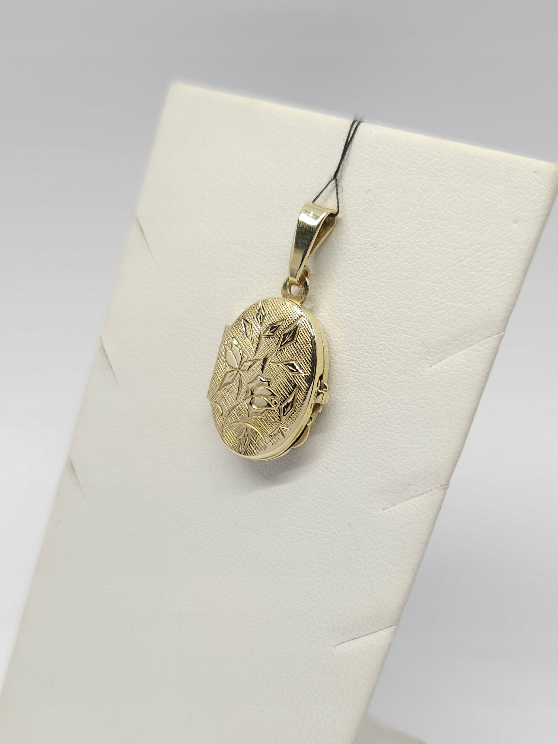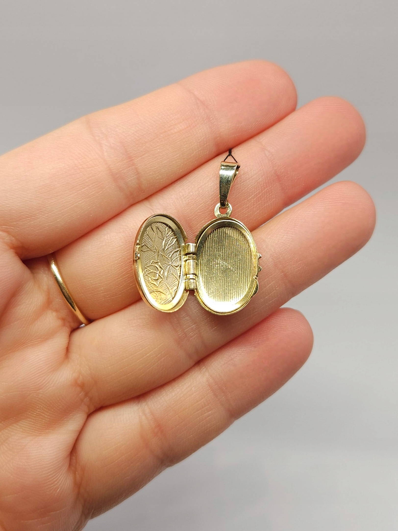 Złoty, owalny sekretnik – wisiorek z miejscem na dwa zdjęcia, z delikatnym zdobieniem z motywem róży