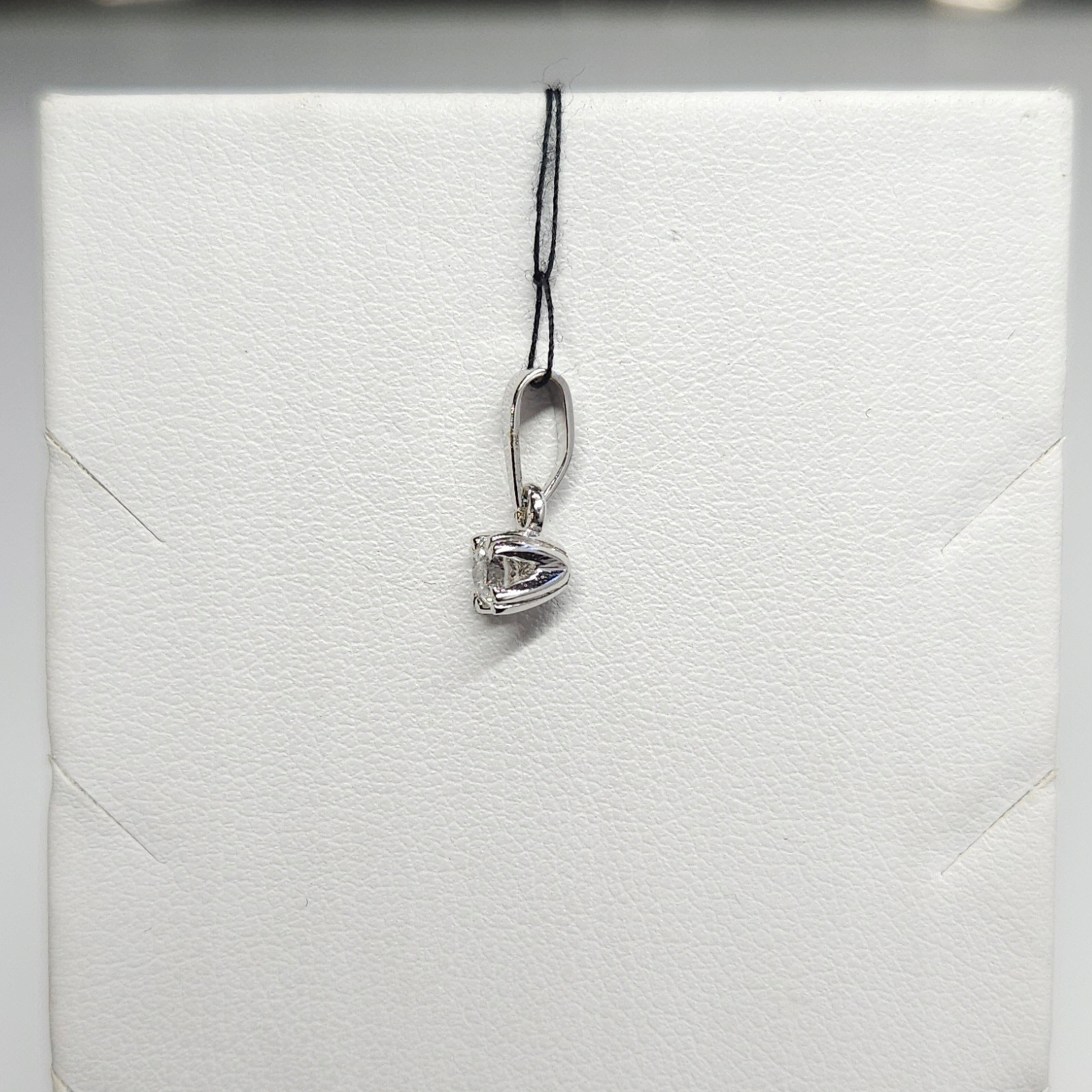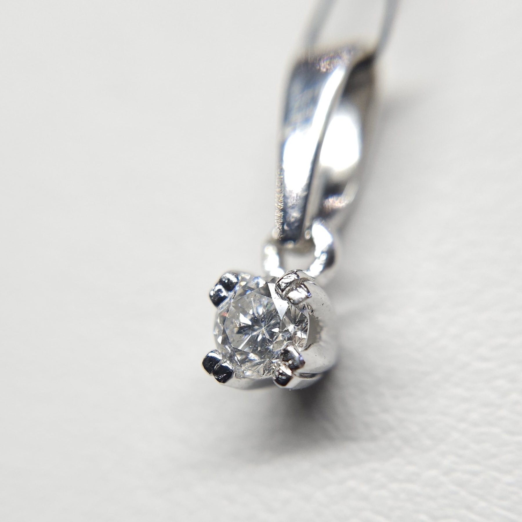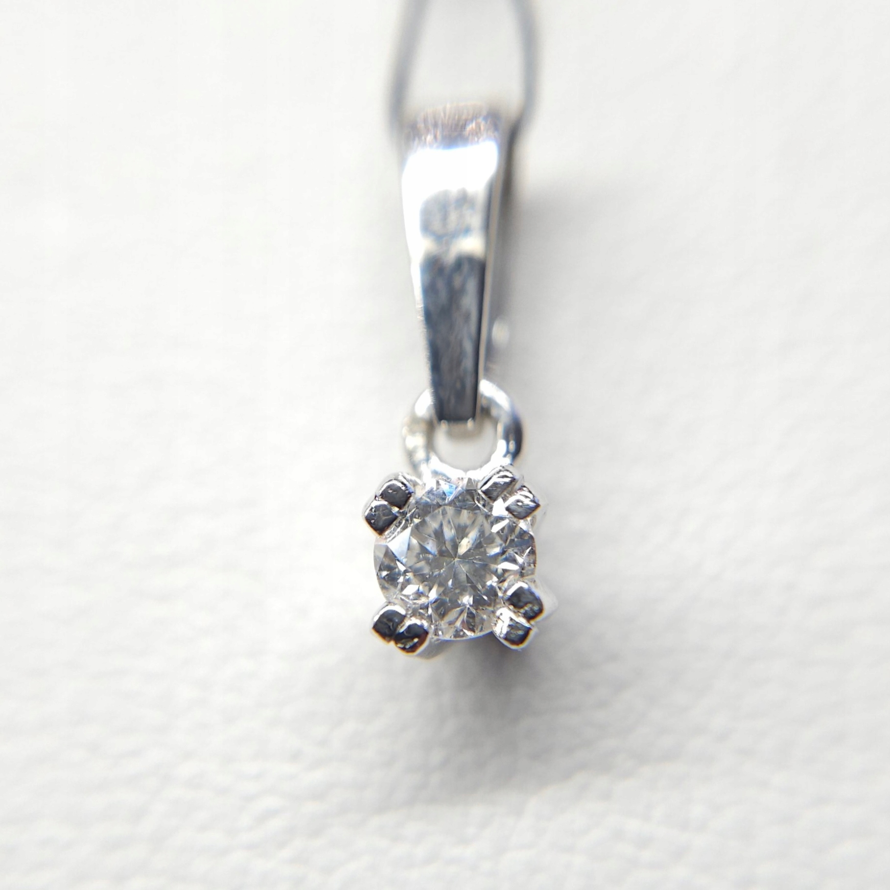 Delikatny wisiorek, wykonany z białego złota, z pojedynczym diamentem w szlifie brylantowym, o masie ~0,17ct