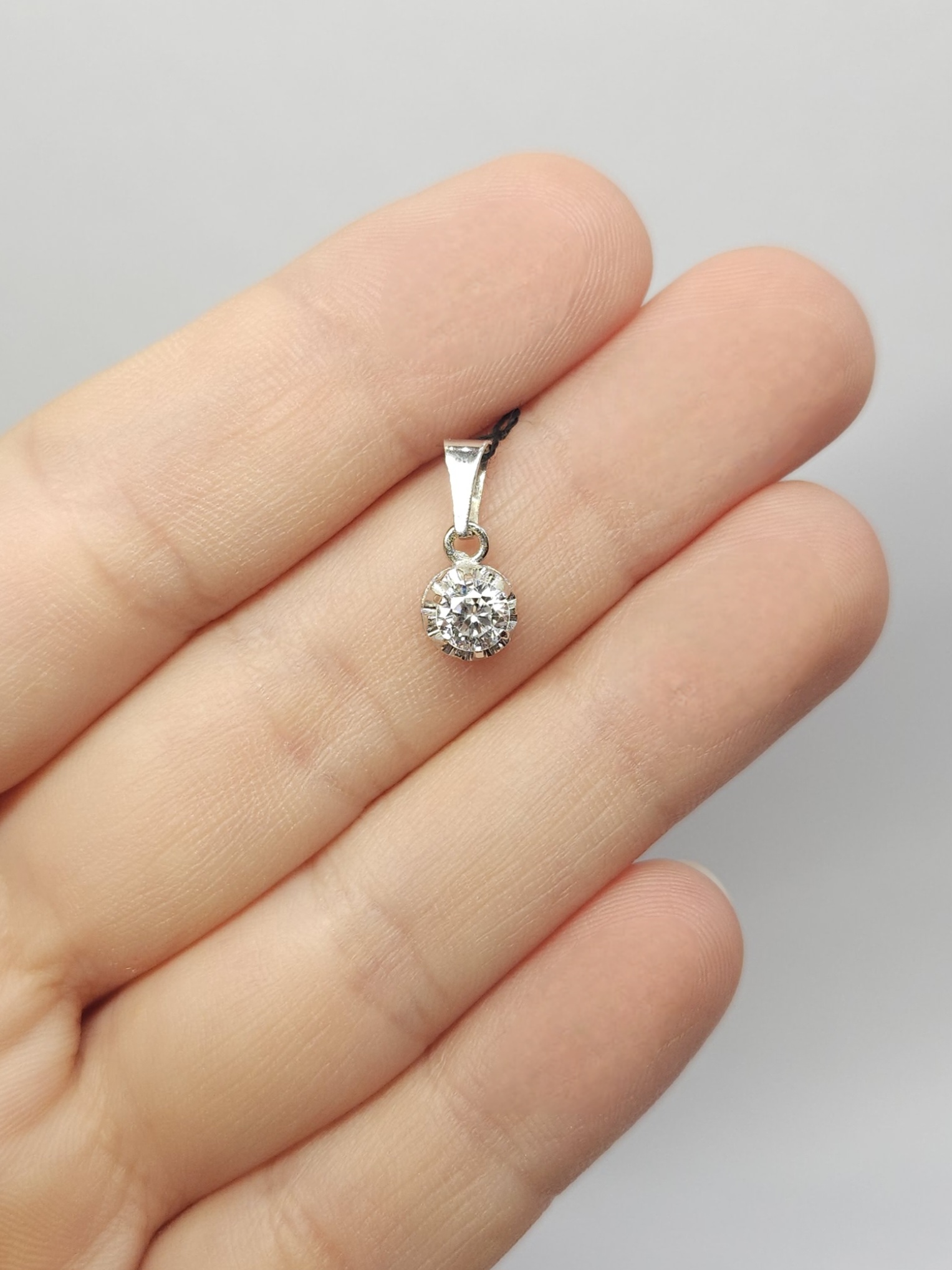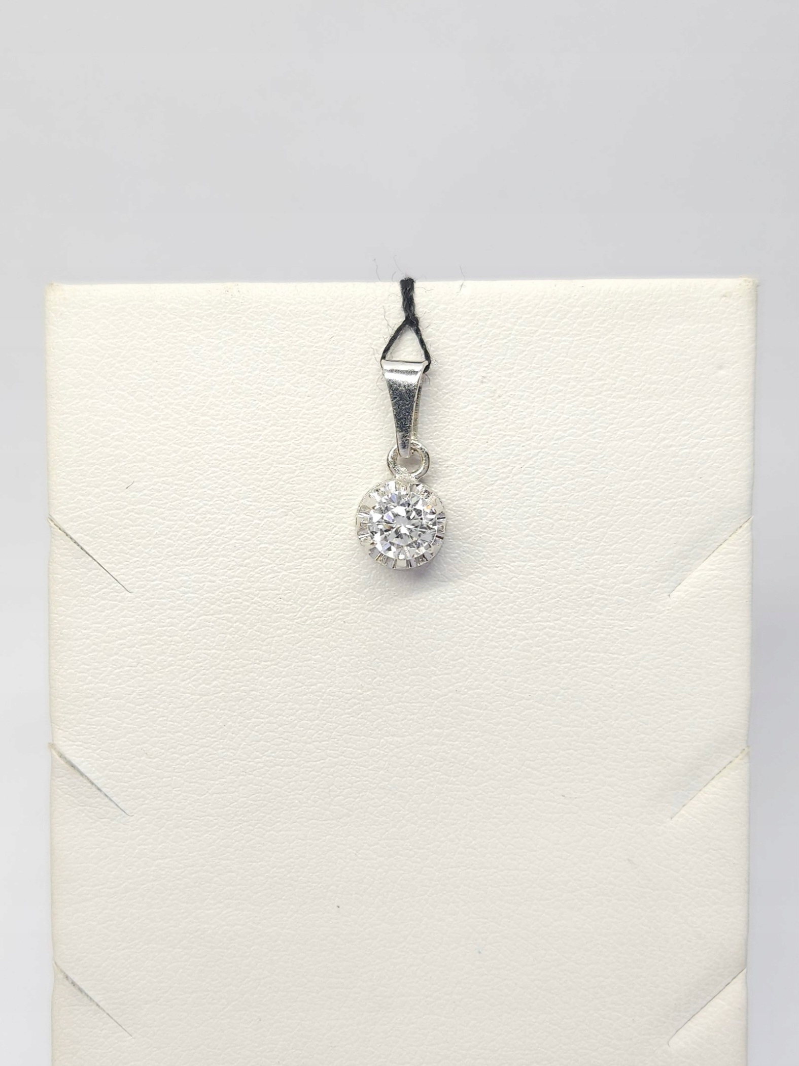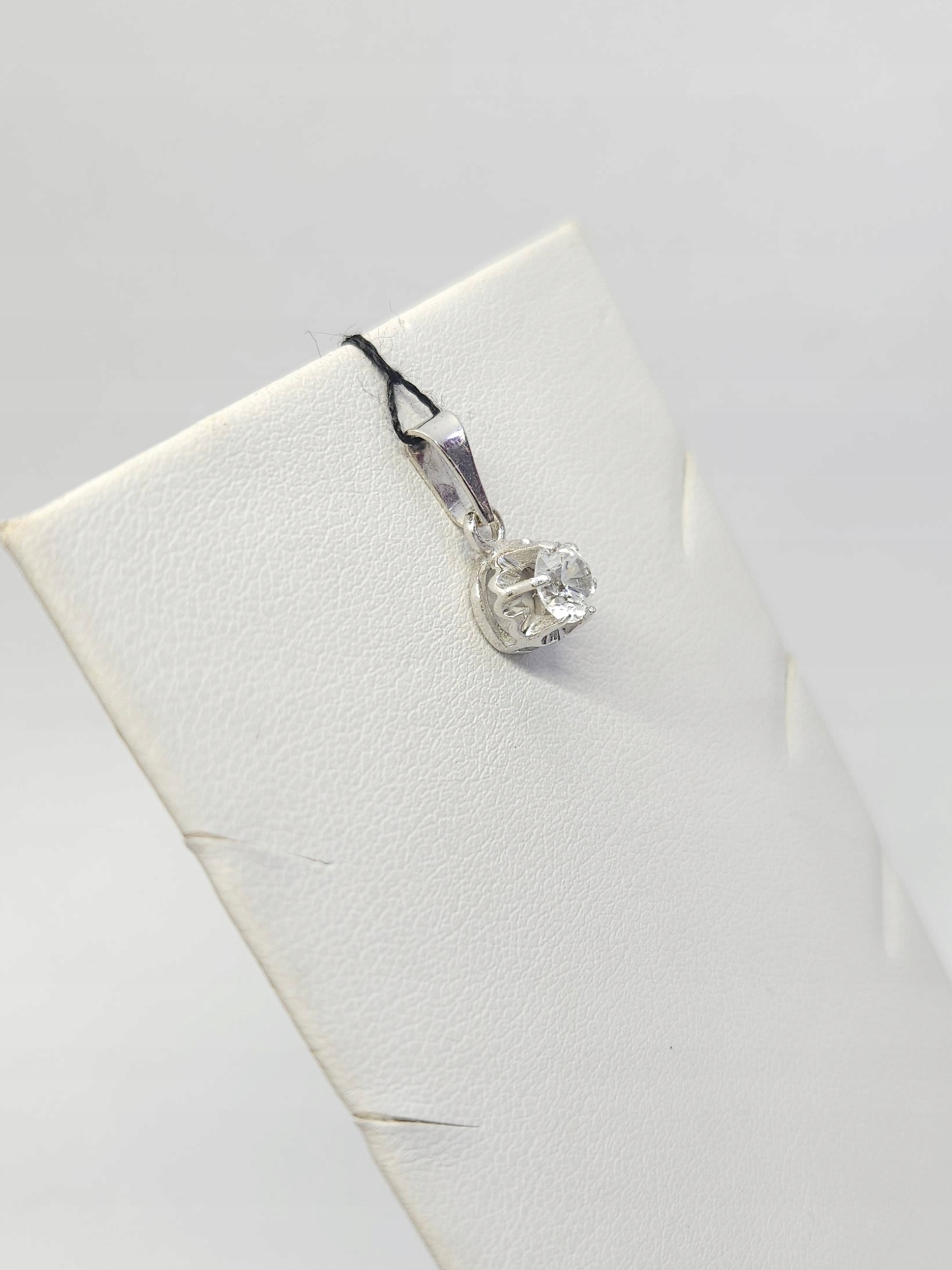 Delikatny wisiorek wykonany z białego złota, zdobiony pojedynczym bezbarwnym spinelem