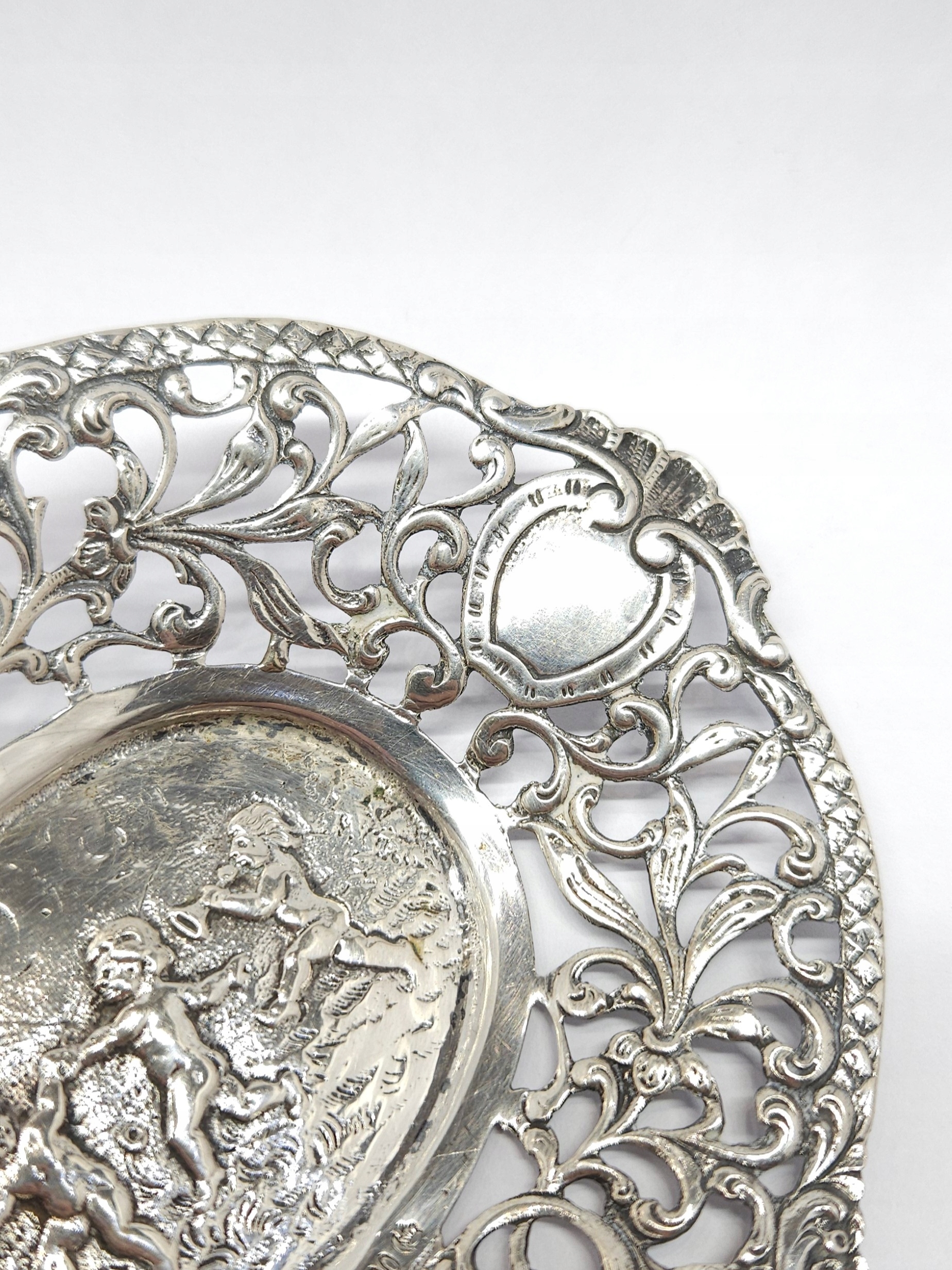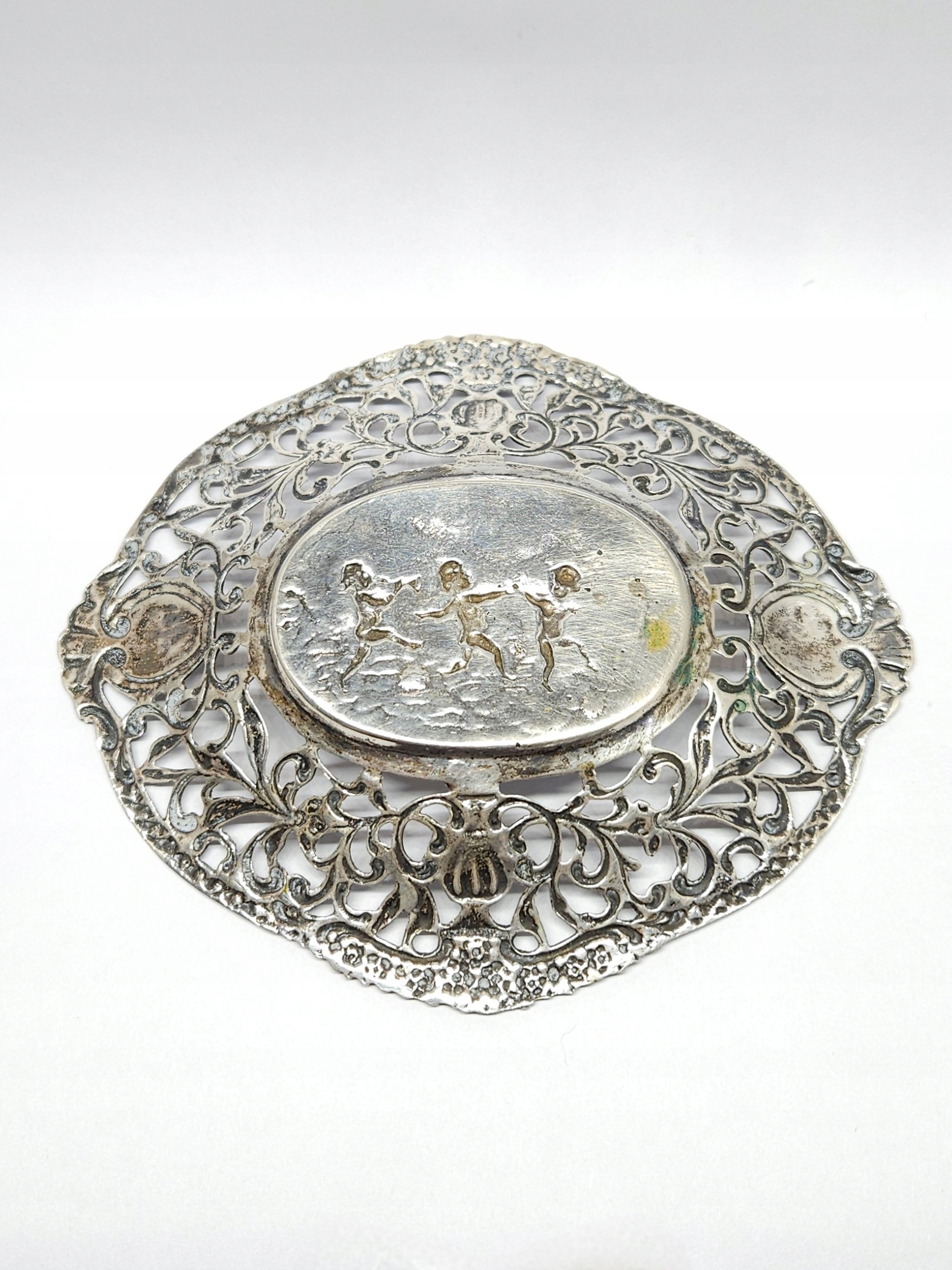 Srebrna miseczka – paterka – podstawka, zdobiona ażurowym ornamentem roślinnym, oraz wytłoczonym motywem trójki bawiących się dzieci – putto; z racji wieku możliwe drobne mikroryski i miejscowe przyciemnienia srebra