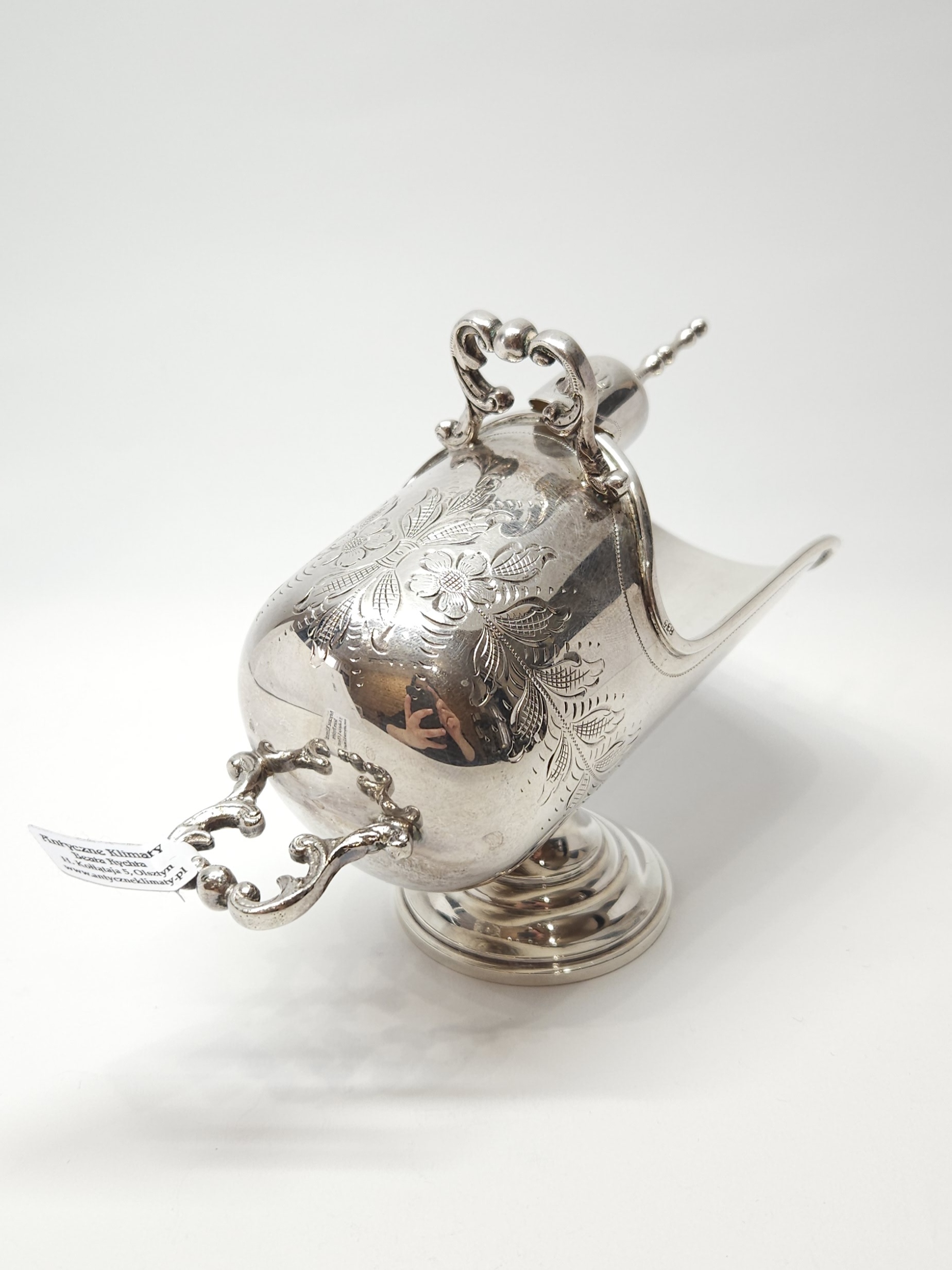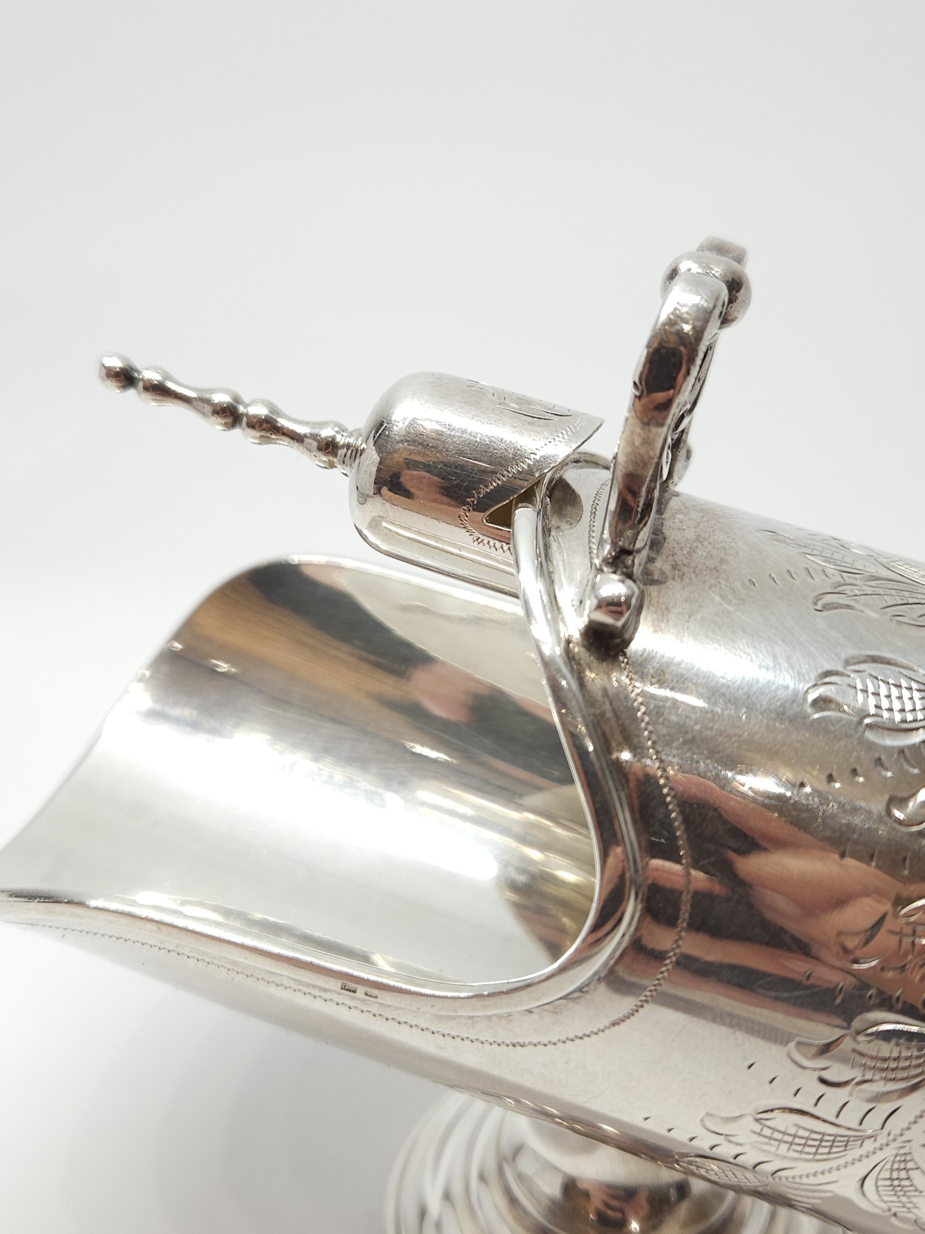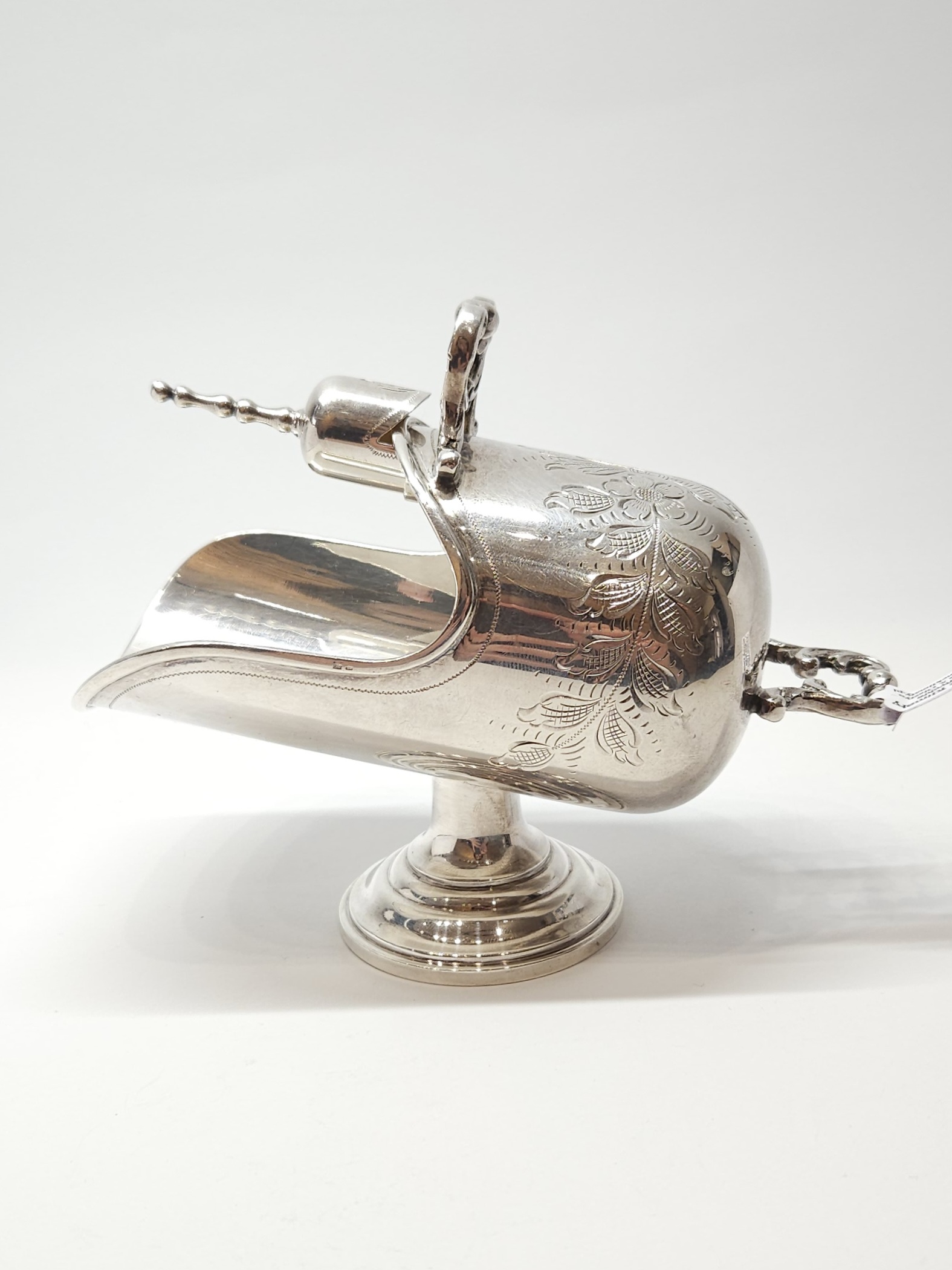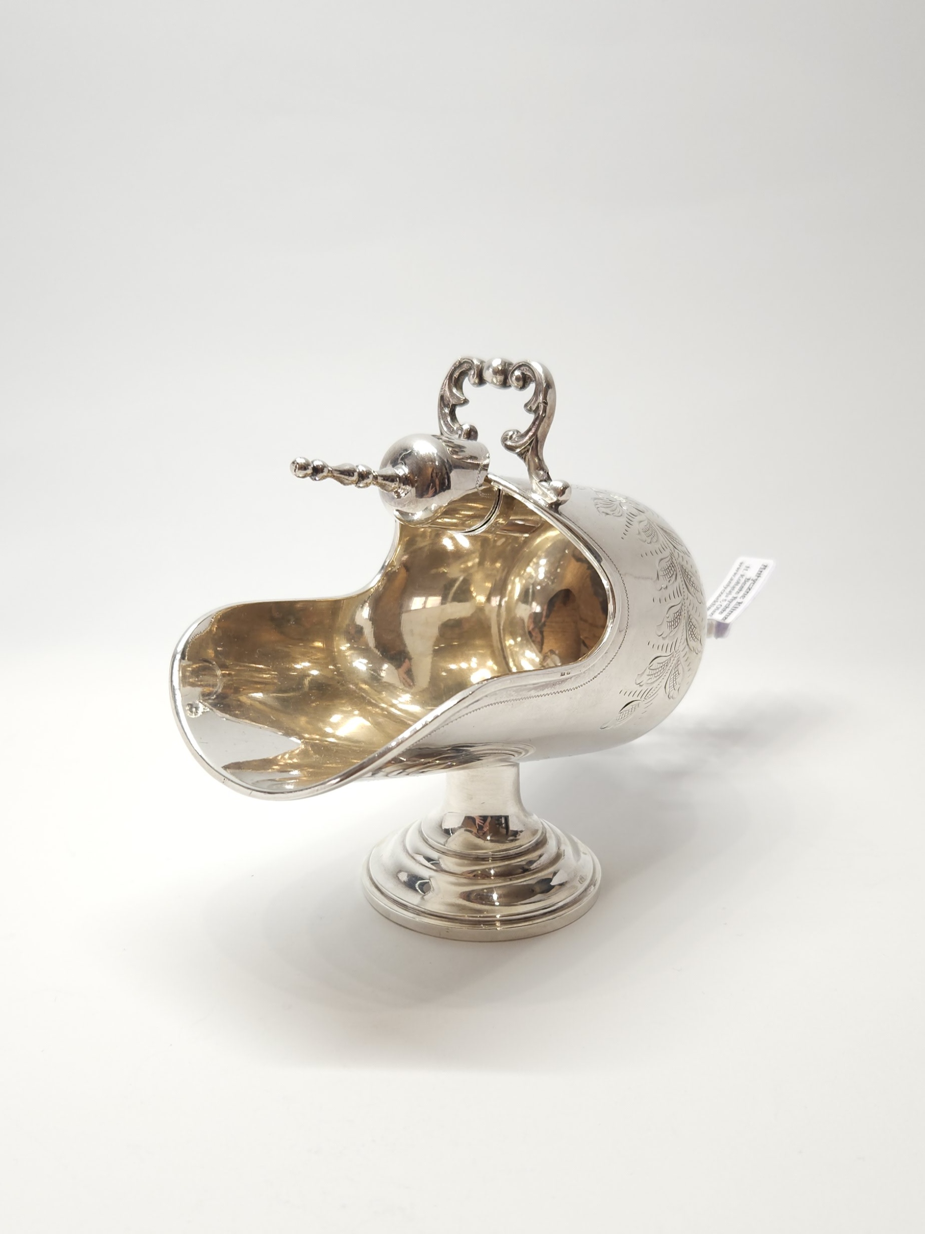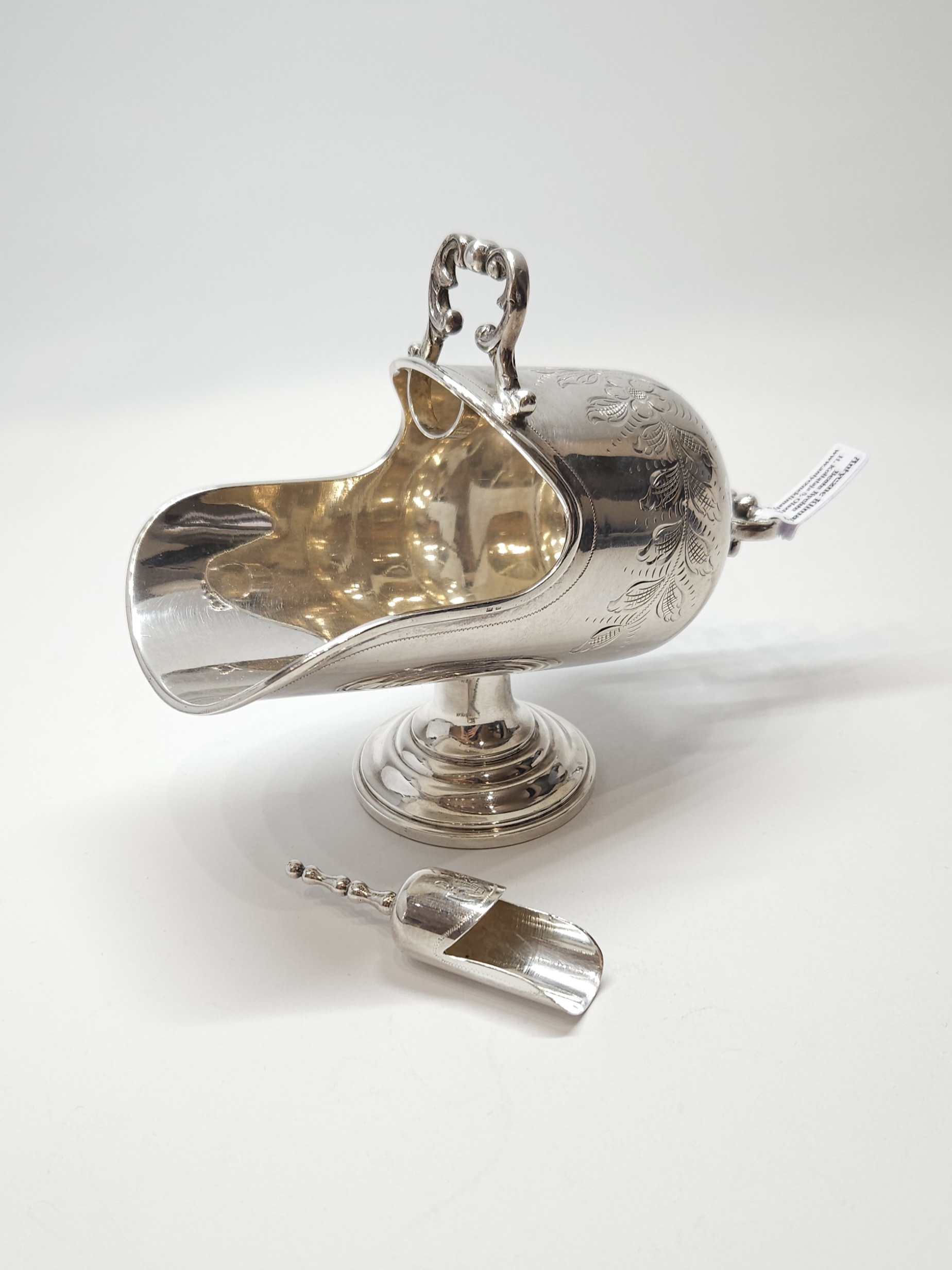 Srebrna, otwarta cukiernica w kształcie węglarki, w komplecie z szufelką, z ręcznie grawerowaną powierzchnią, zdobioną motywem kwiatowym