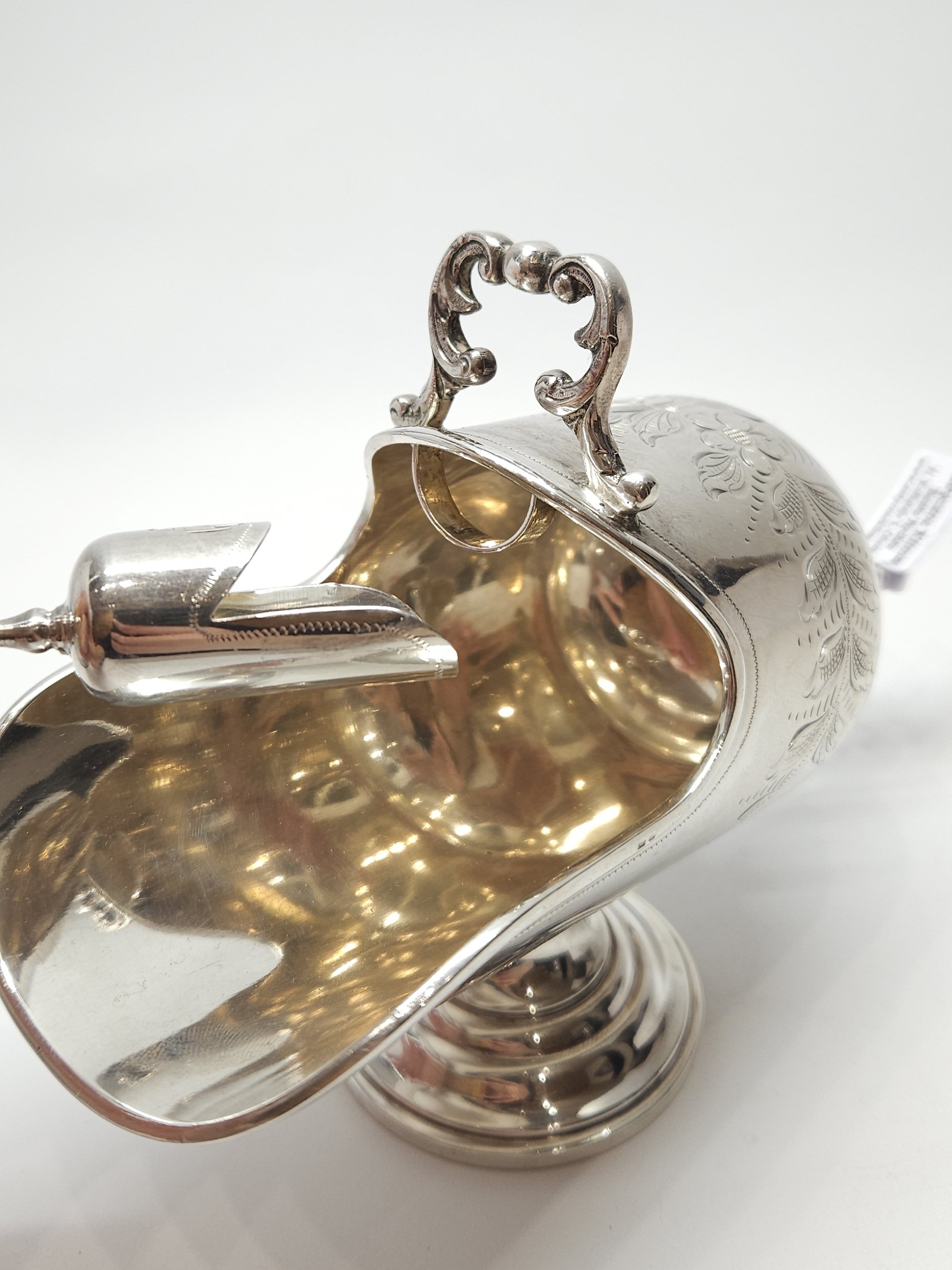 Srebrna cukiernica z szufelką, węglarka, srebro 0.835 grawerowana