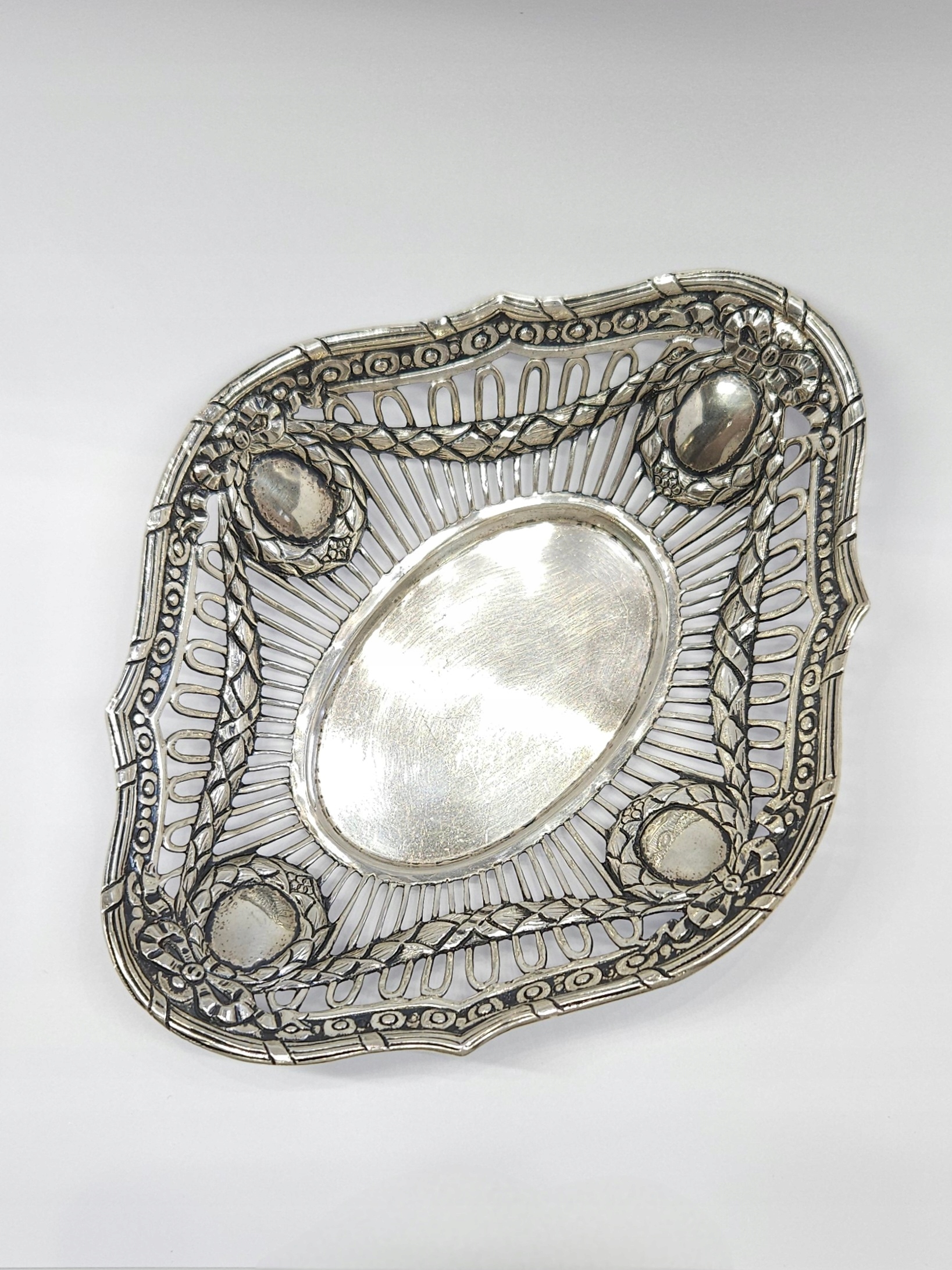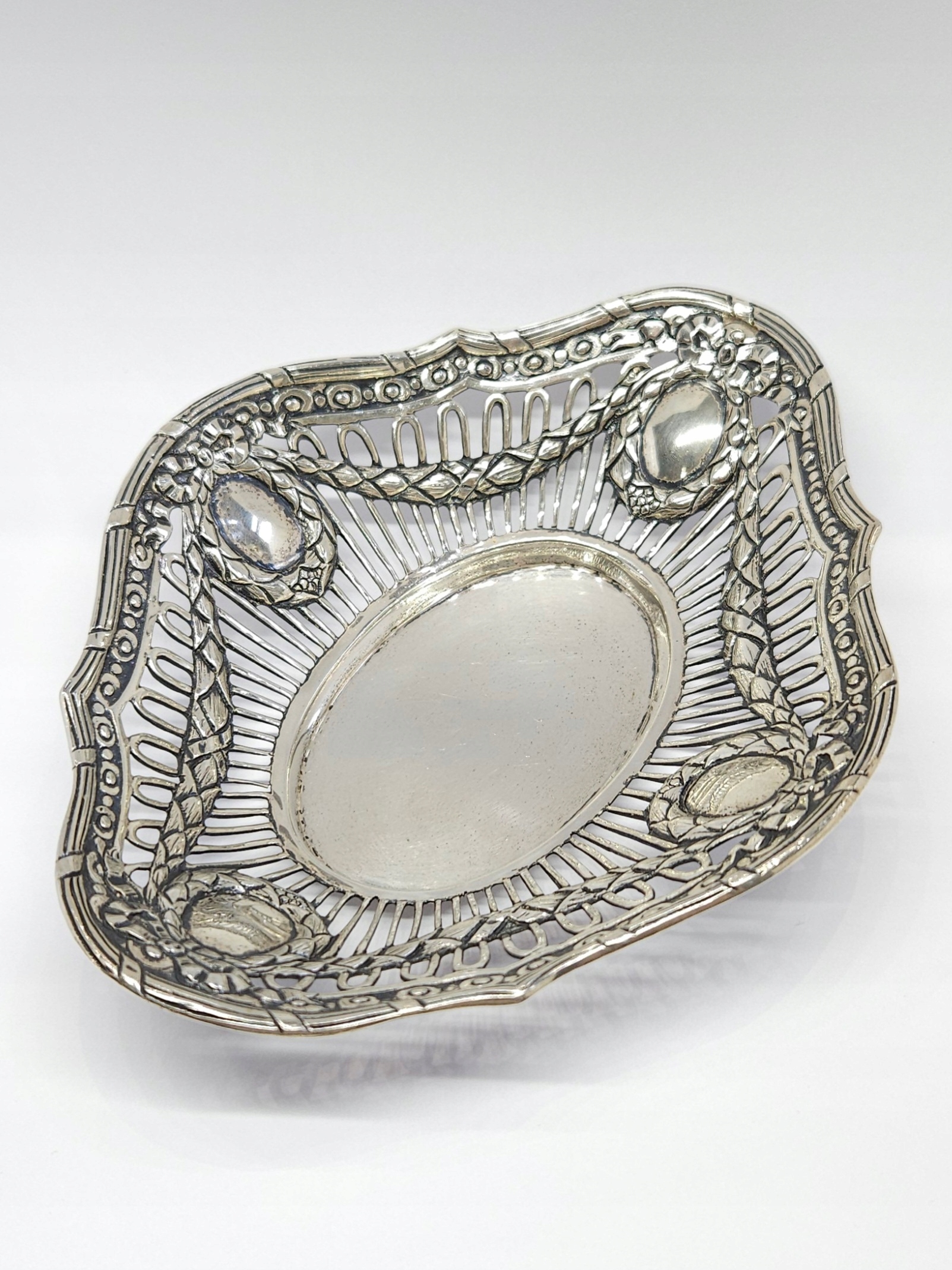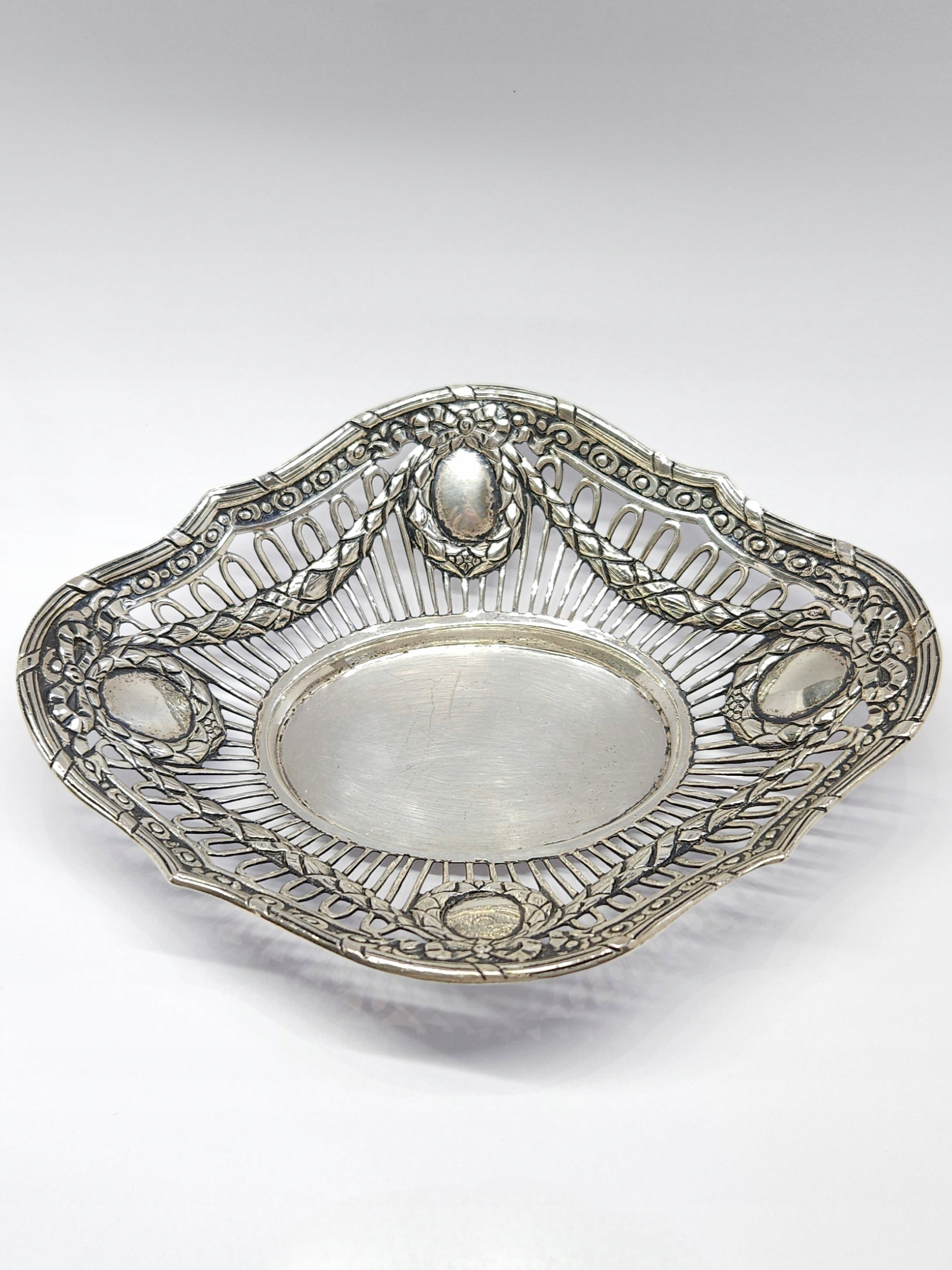 Strona główna » Sklep » Srebrna miseczka, ażurowa paterka, srebro 0,800 girlandy