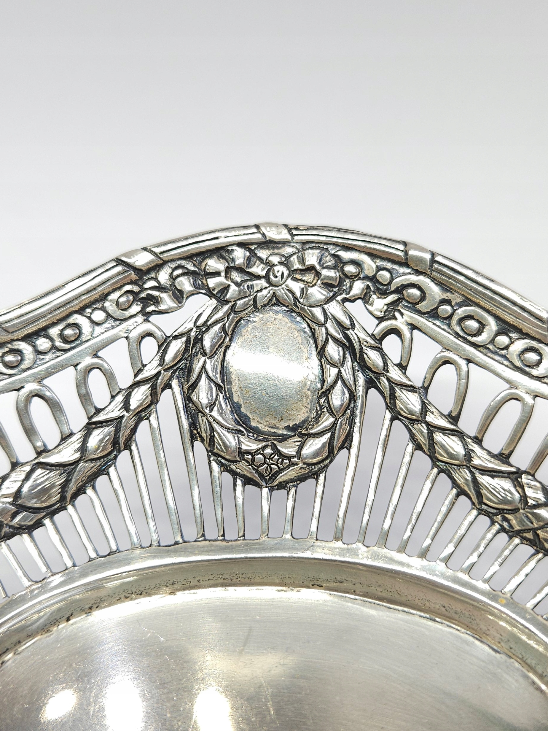 Srebrny, ażurowy koszyczek… niewielka patera, zdobiony motywem girlandy; z racji wieku lekkie ślady użytkowania