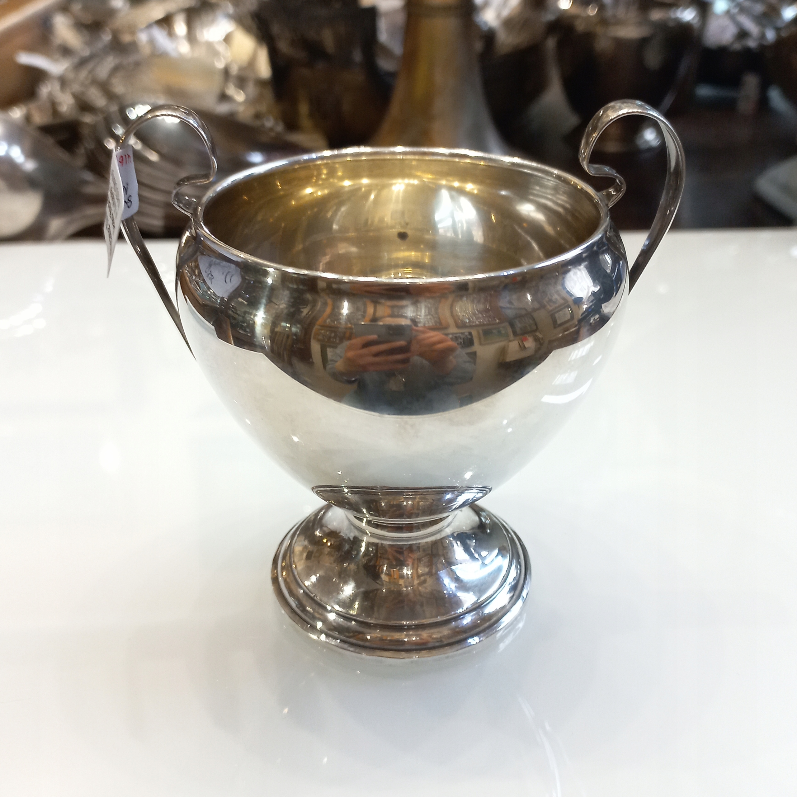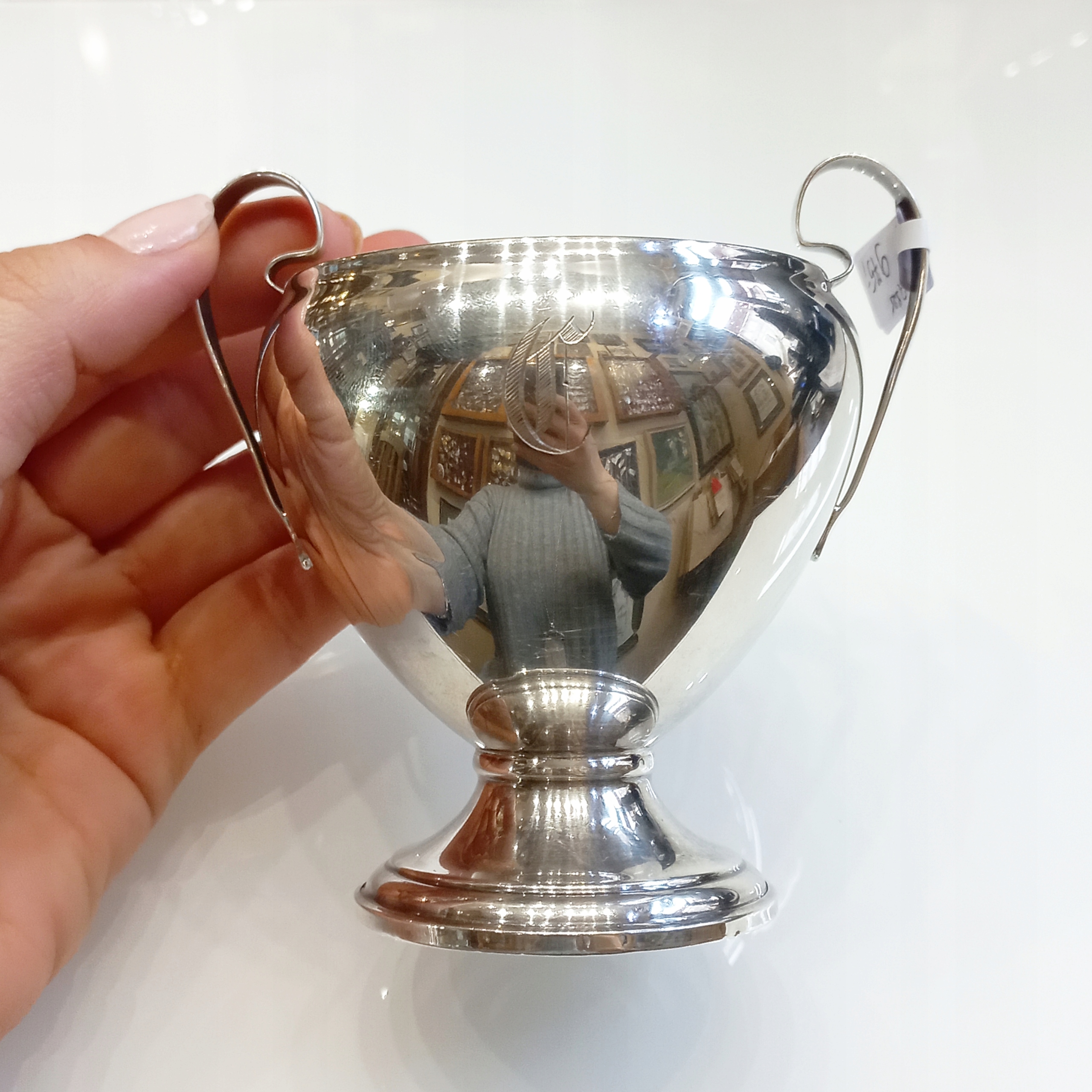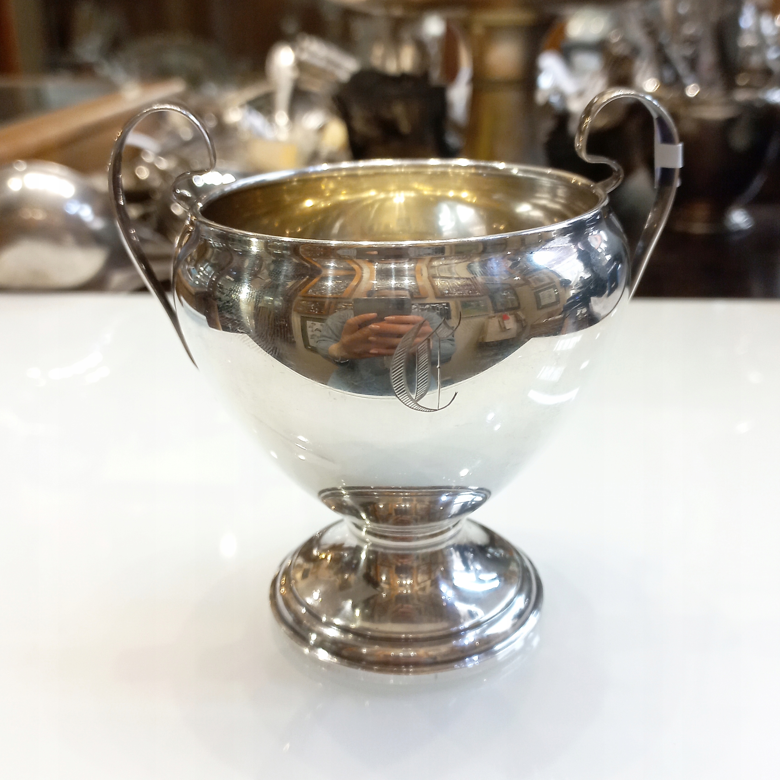 Przedmiotem sprzedaży jest srebrna cukiernica na nóżce, z dwoma uchwytami, z wygrawerowanym monogramem “C” (czcionka gotycka); nóżka dociążona wypełnieniem