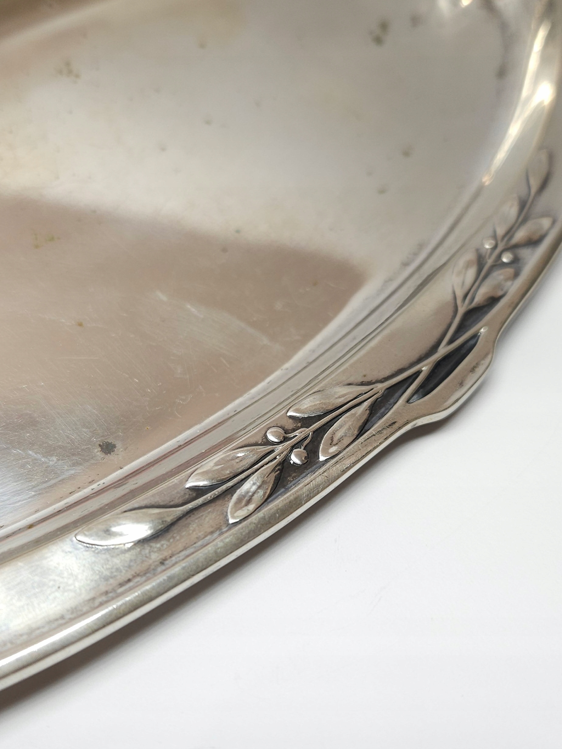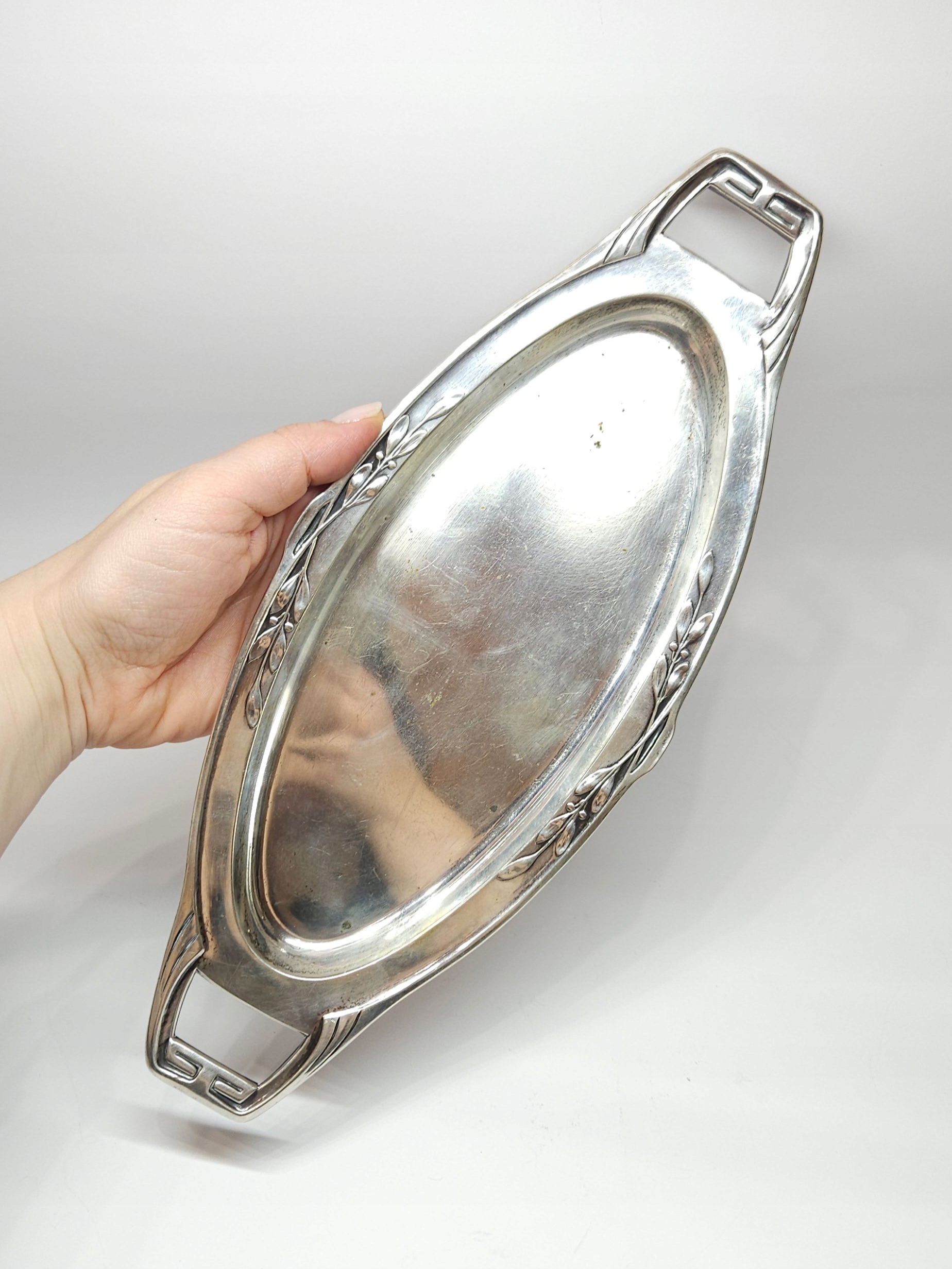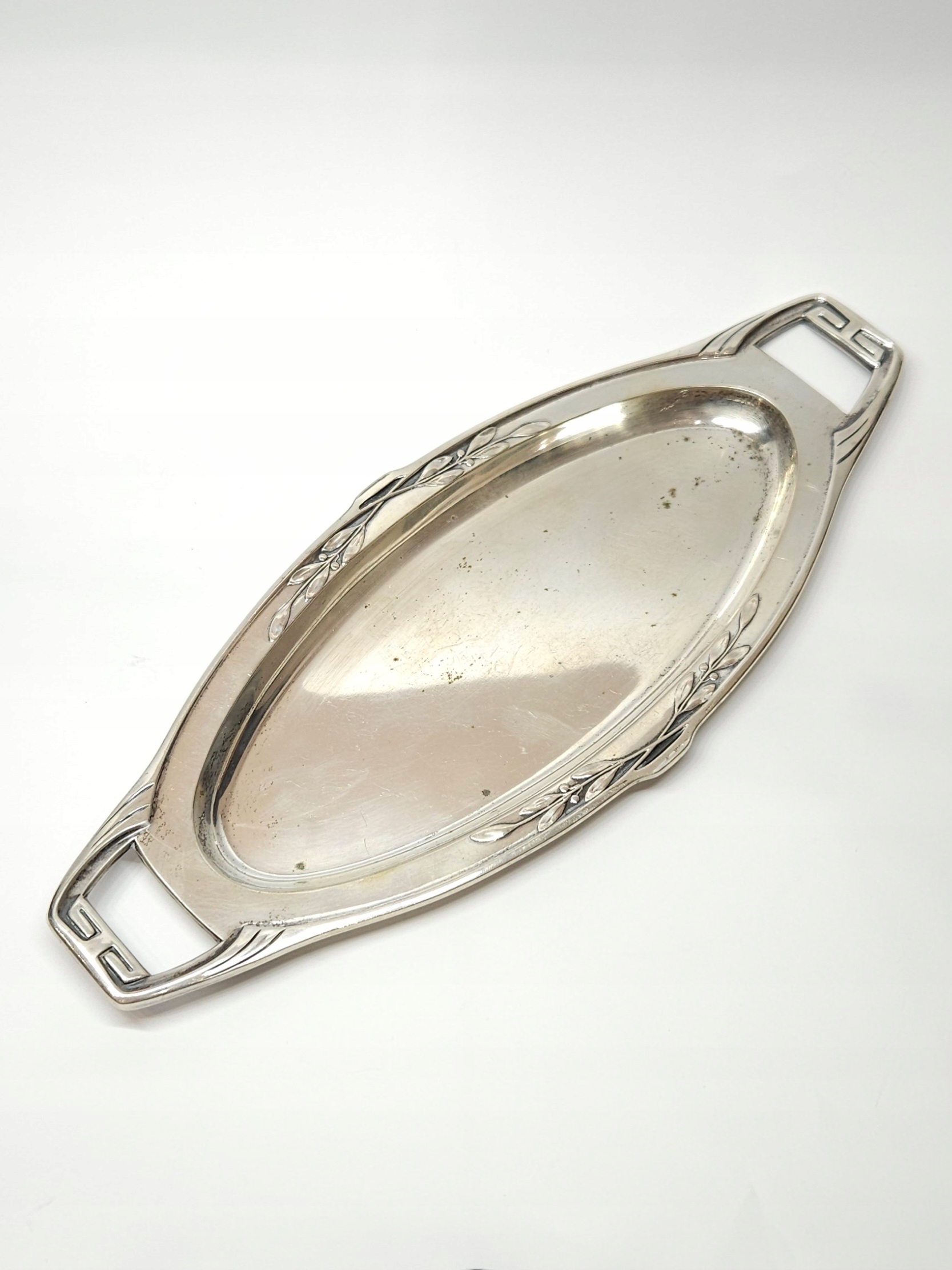 Podłużna, srebrna tacka z pocz. XXw., zdobiona secesyjnym motywem dekoracyjnym, mogąca służyć jako podstawka ood karafkę z kieliszkami lub przybornik toaletkowy… organizer na biurko; z racji wieku możliwe drobne mikroryski i miejscowe przyciemnienia srebra